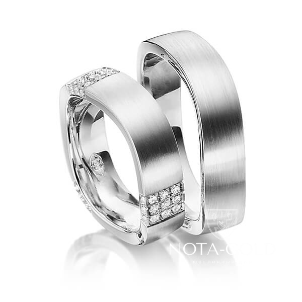 Широкие платиновые обручальные кольца квадратной формы с многочисленными бриллиантами в женском кольце (Вес пары: 19 гр.)