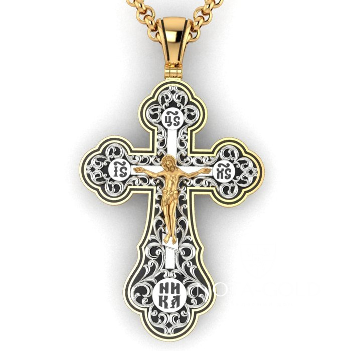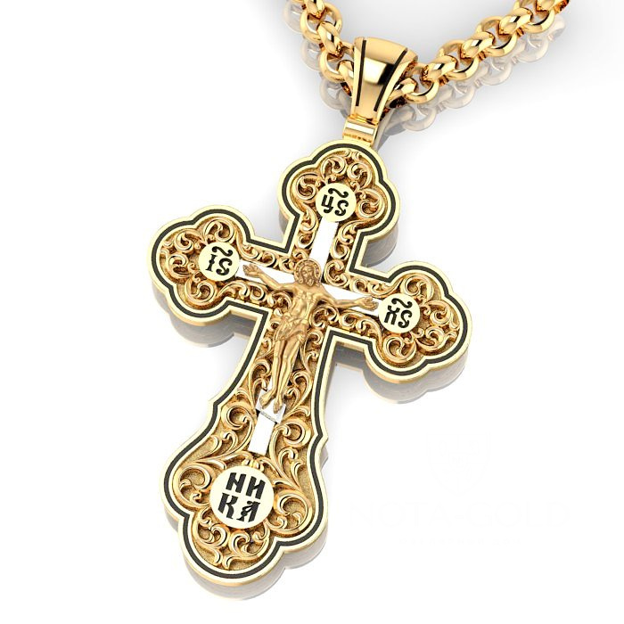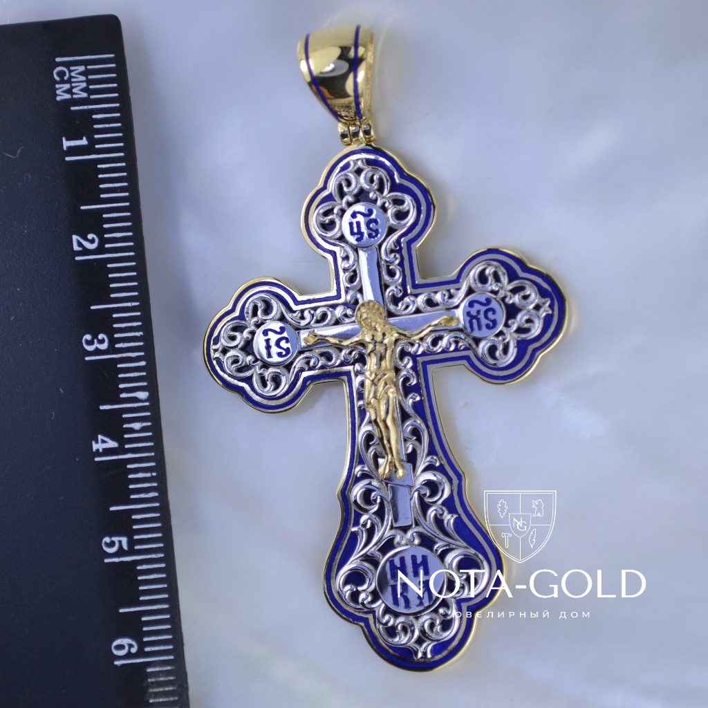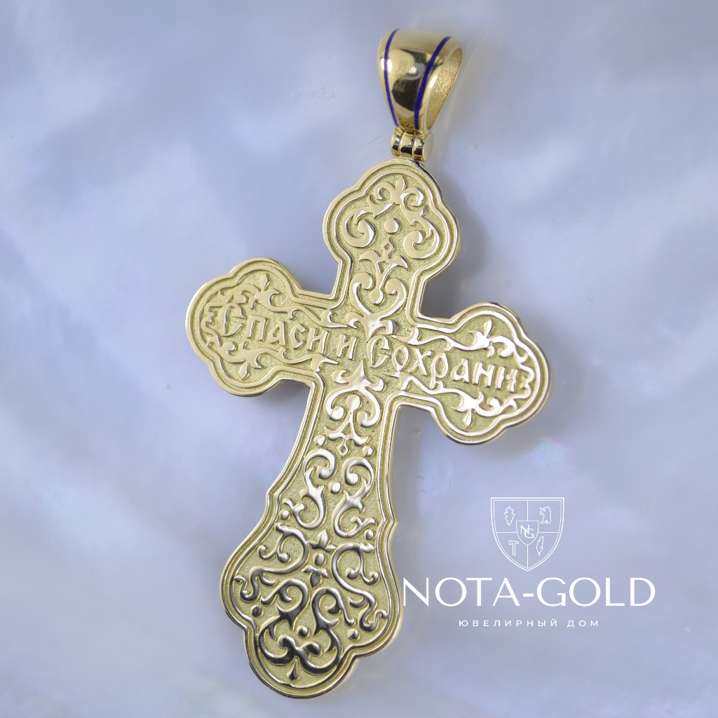 Большой плоский мужской крест из золота с ажурной накладкой и эмалью (Вес: 22 гр.)