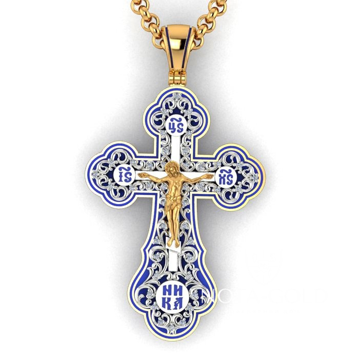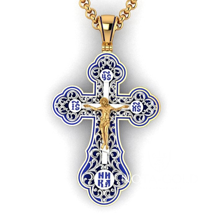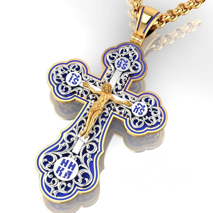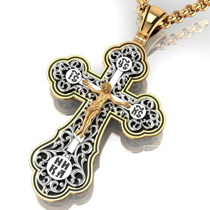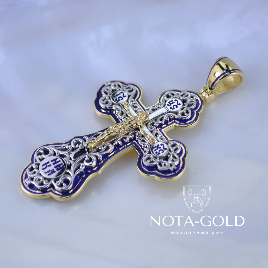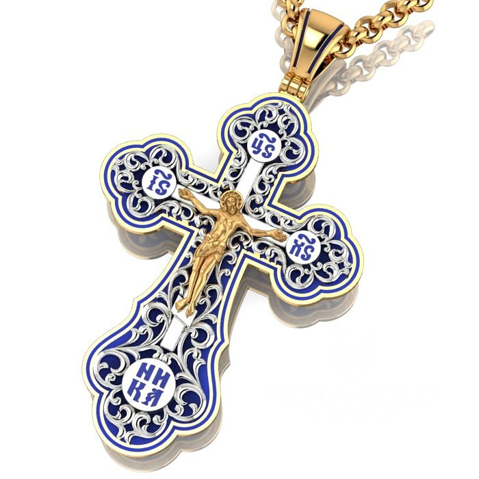 Большой плоский мужской крест из золота с ажурной накладкой и эмалью (Вес: 22 гр.)
