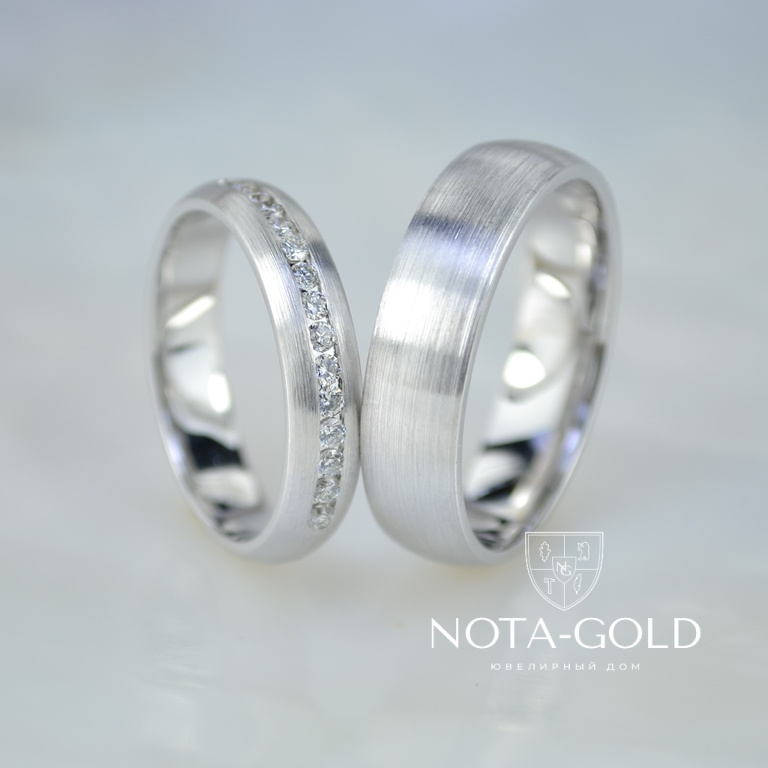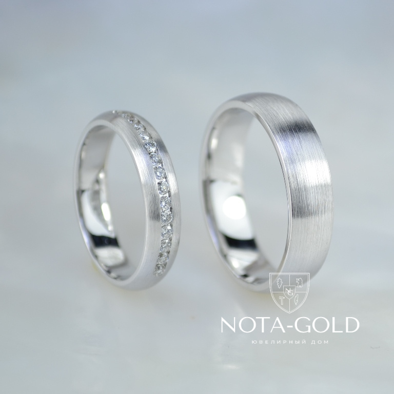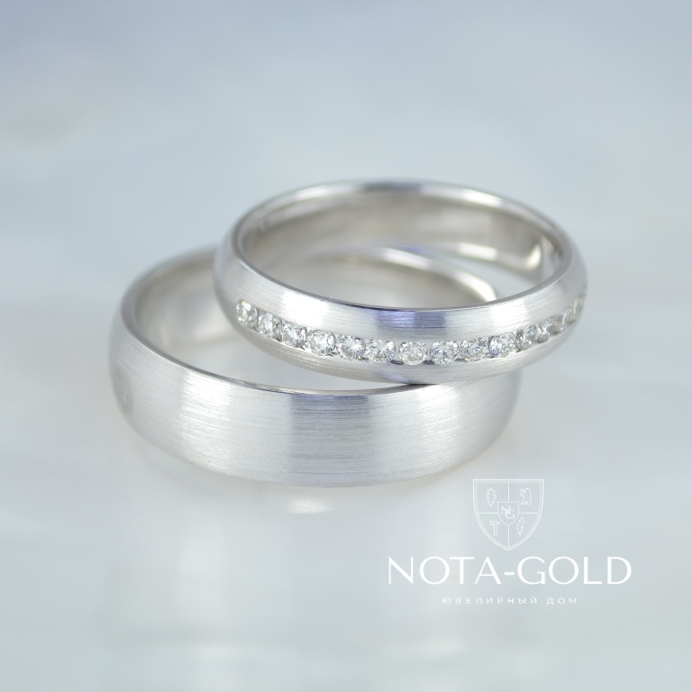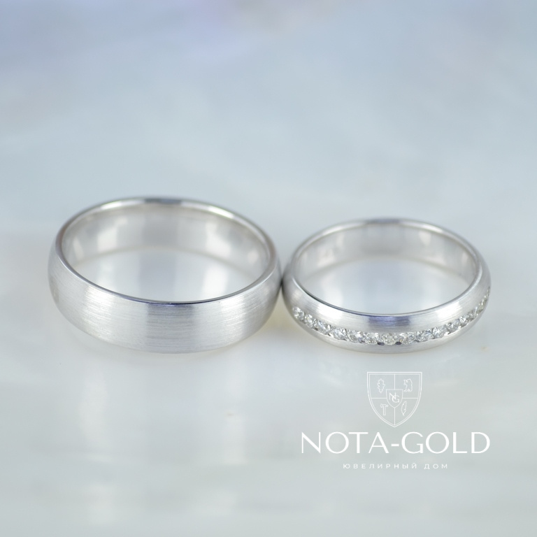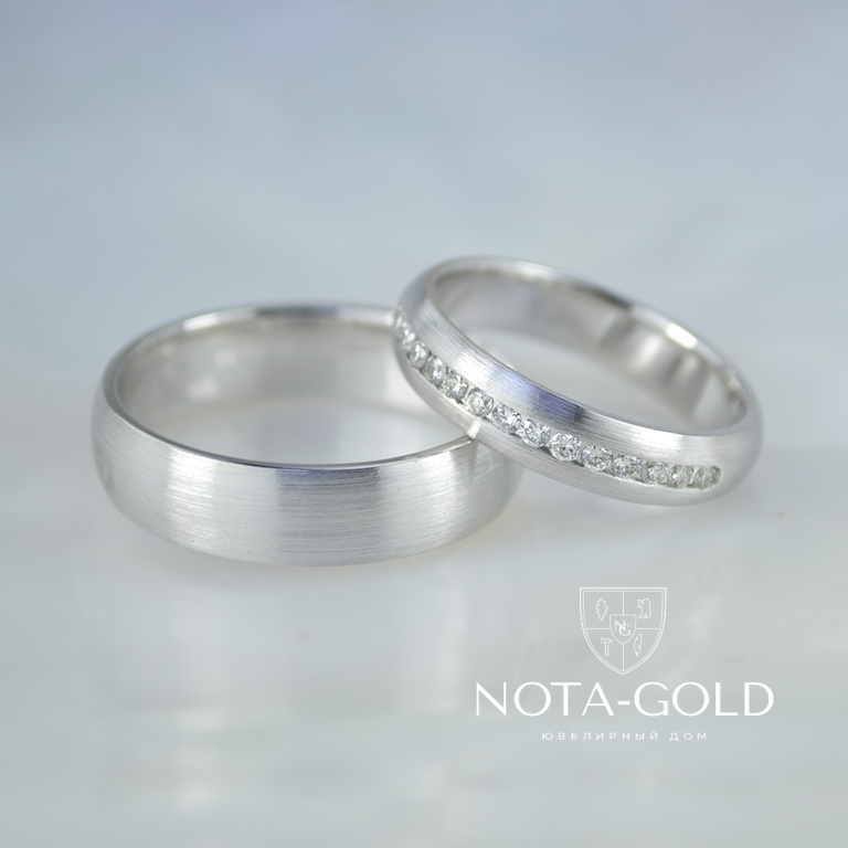 Матовые обручальные из белого золота с дорожкой бриллиантов в женском кольце (Вес пары: 10 гр.)