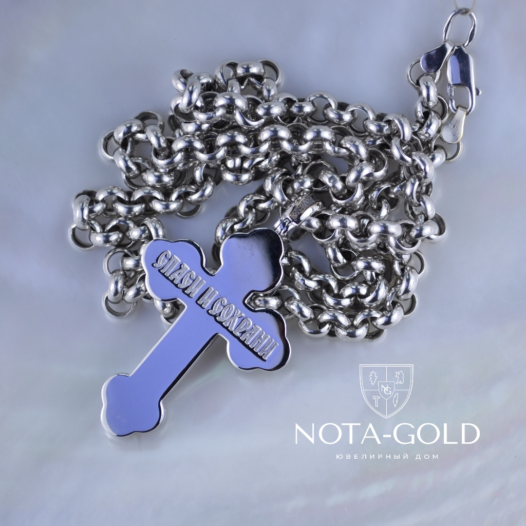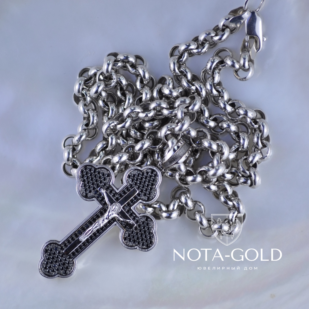 Мужской крестик из белого золота с россыпью чёрных бриллиантов на цепочке плетение Французское (Вес: 45 гр.)