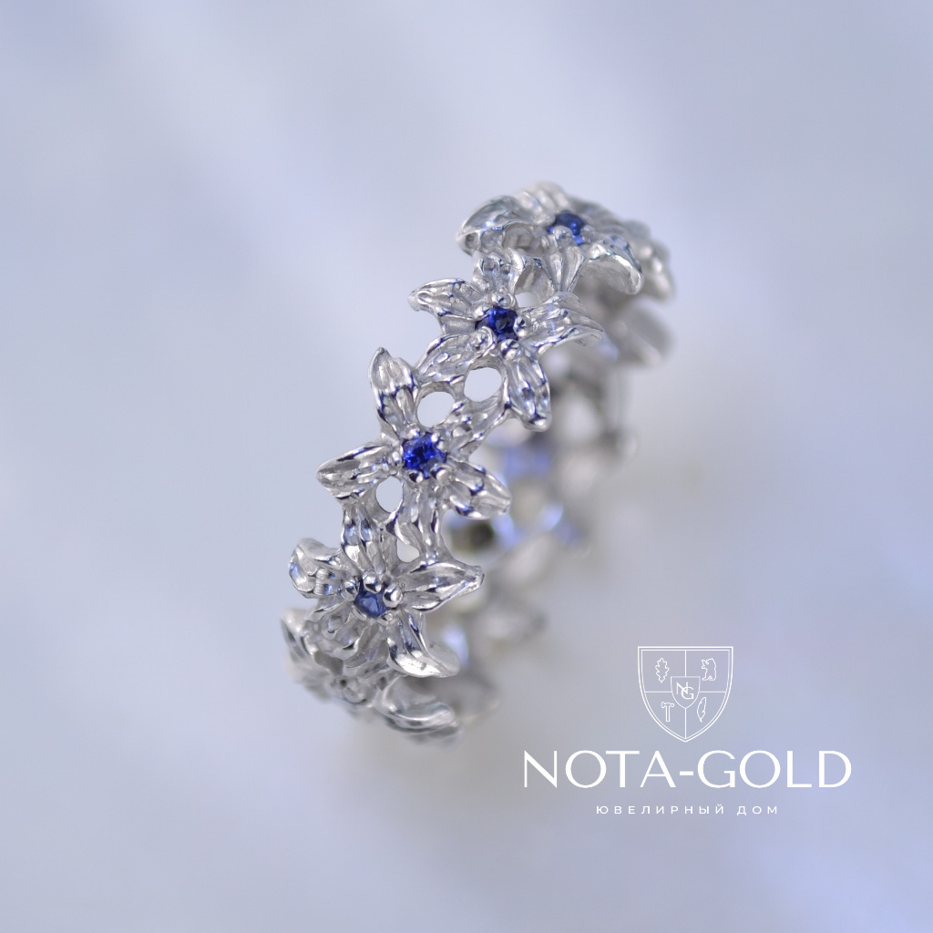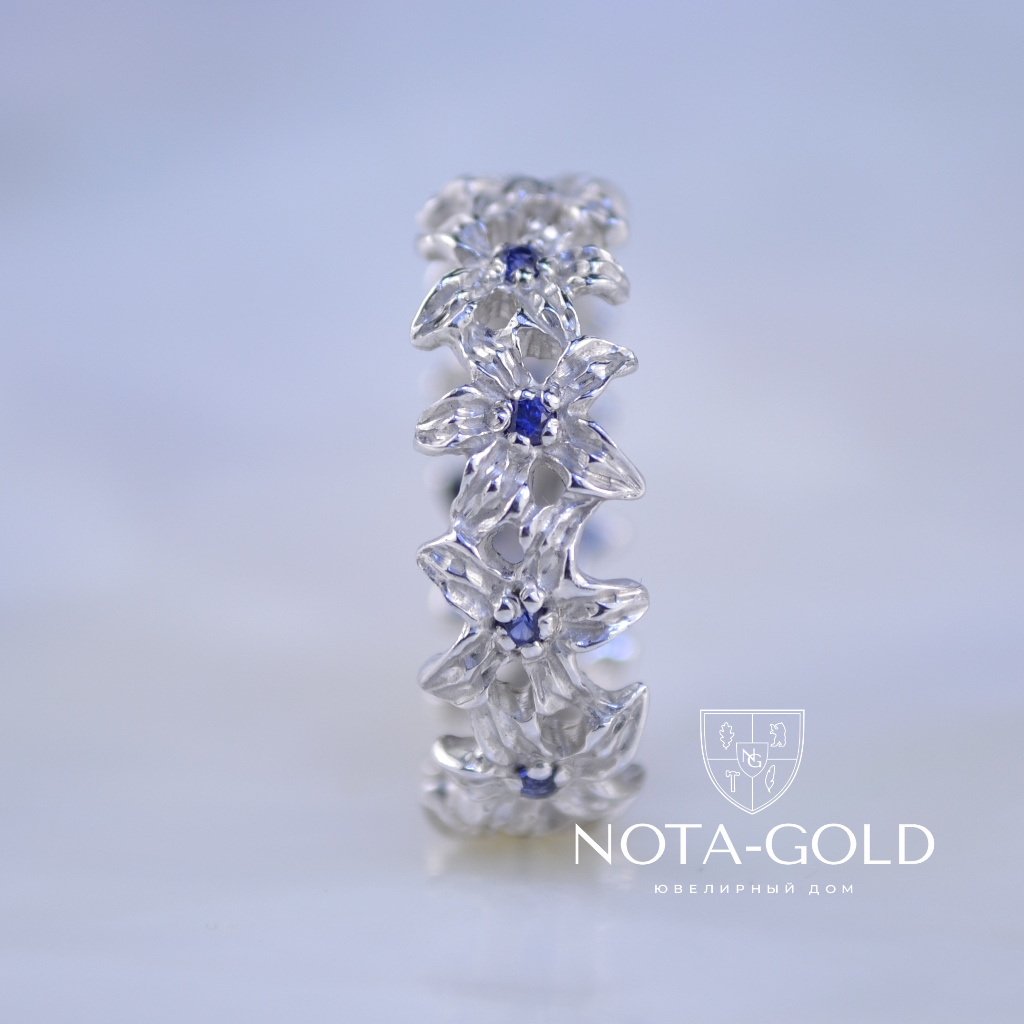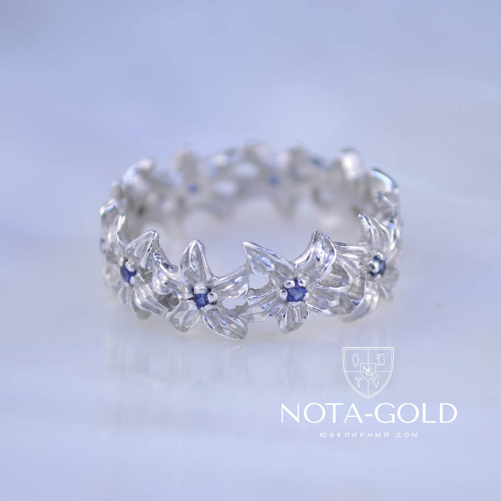 Женское кольцо из белого золота с цветами и сапфирами (Вес: 3 гр.)