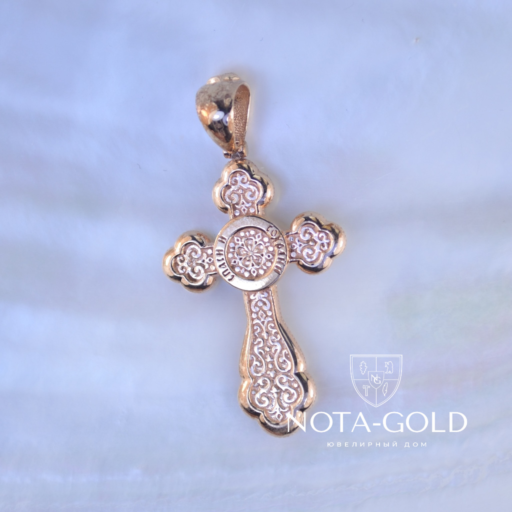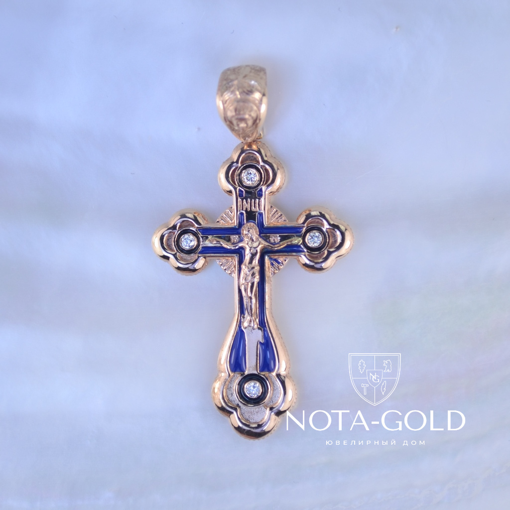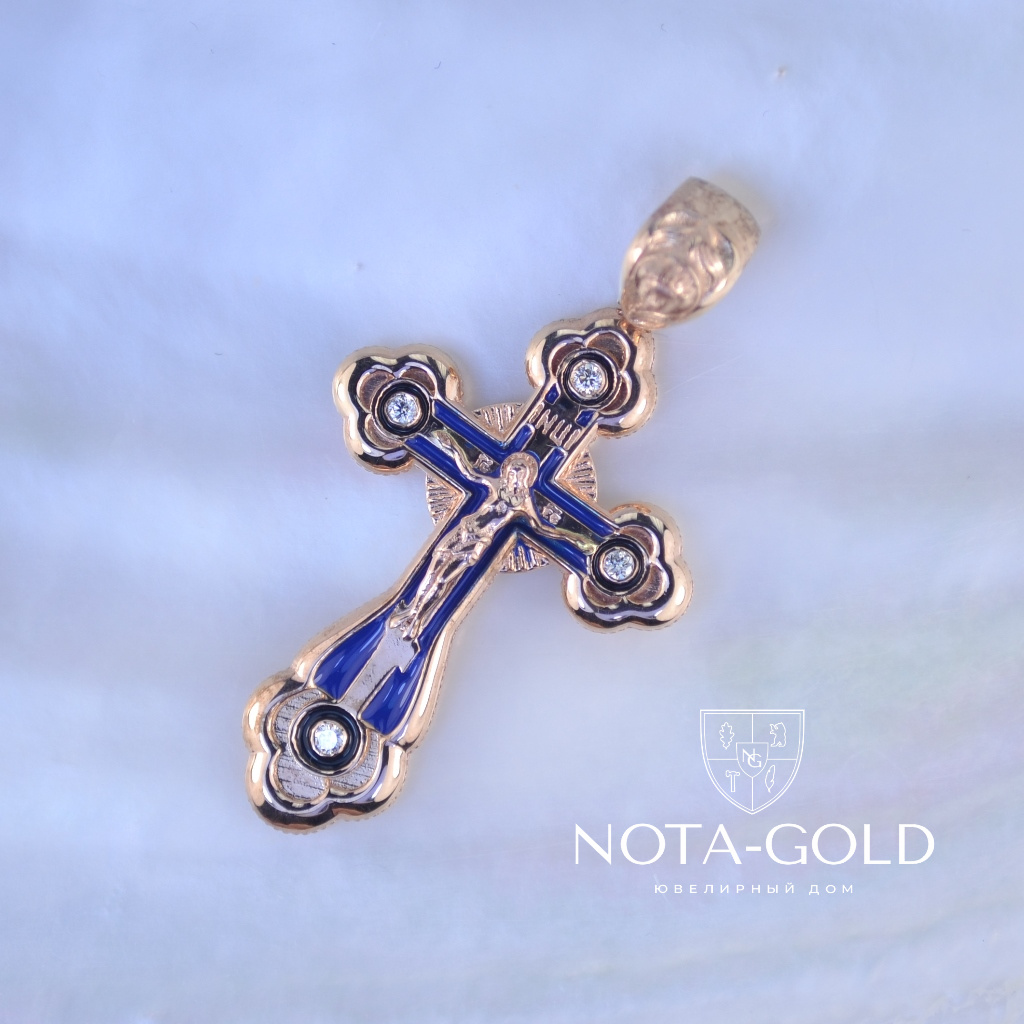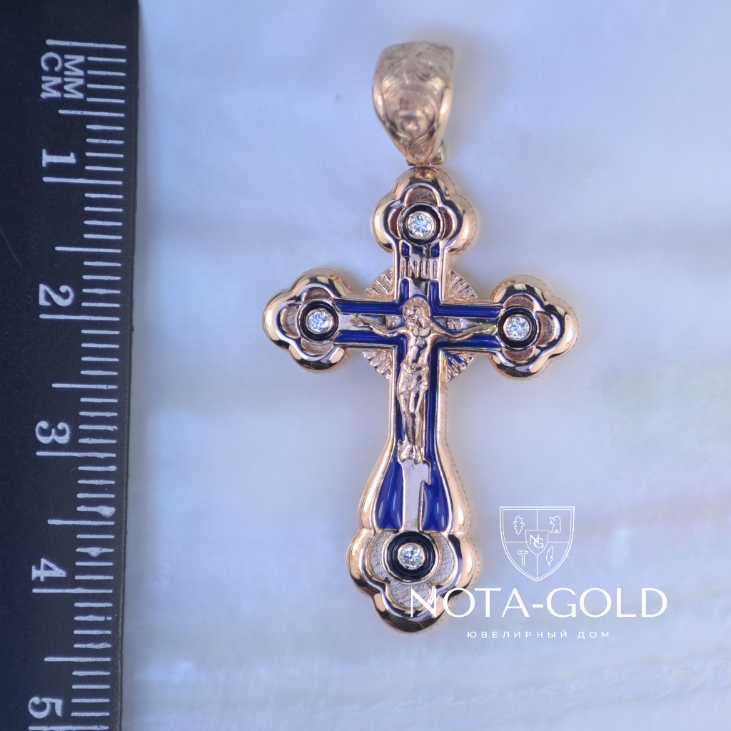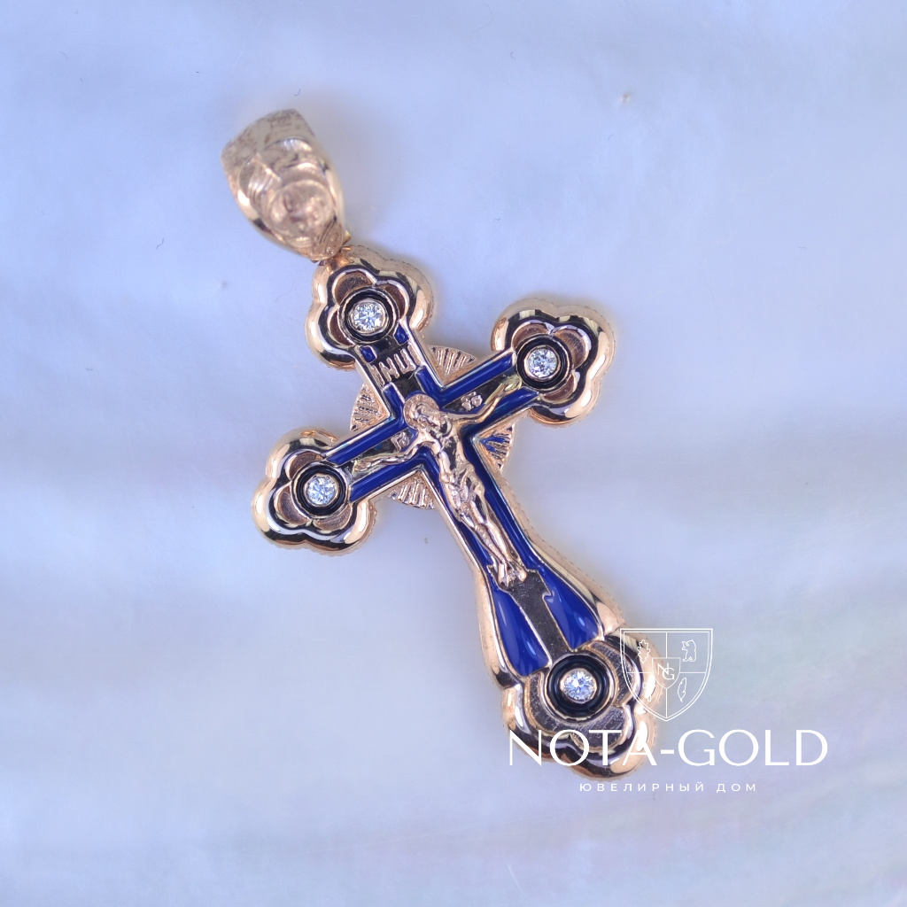 Крест из красного золота с эмалью, бриллиантами и Ангелом Хранителем на ушке (Вес: 9 гр.)