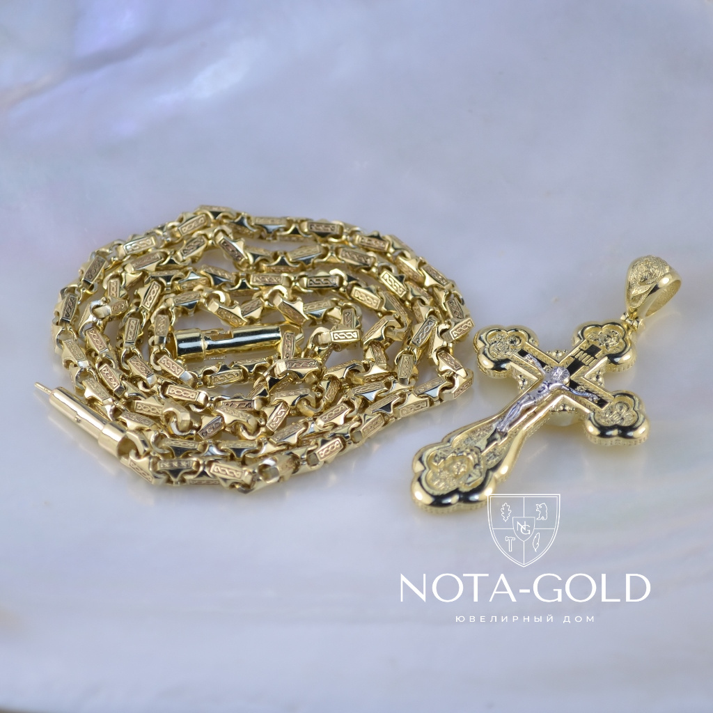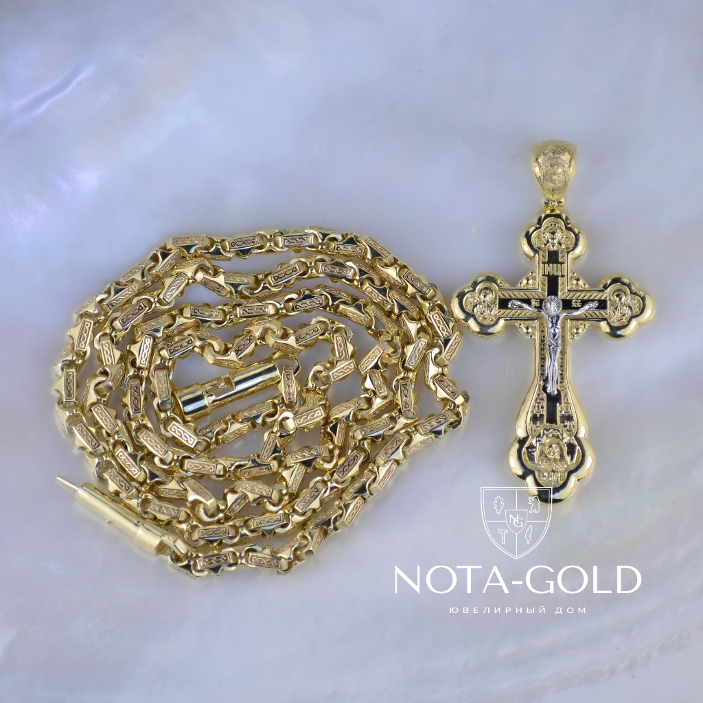 Православный крест из жёлтого золота с распятием и цепочкой плетения Краб Луксор (Вес: 48,5 гр.)