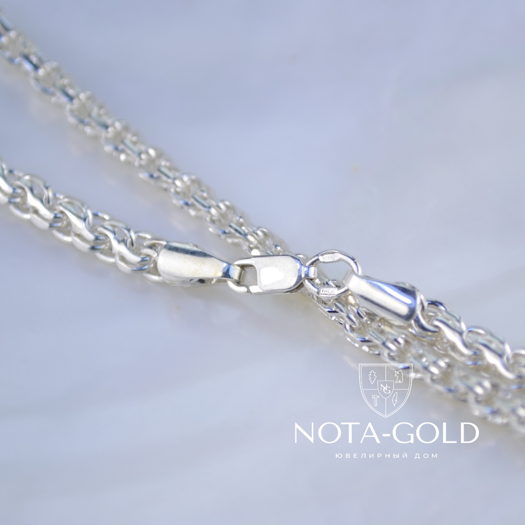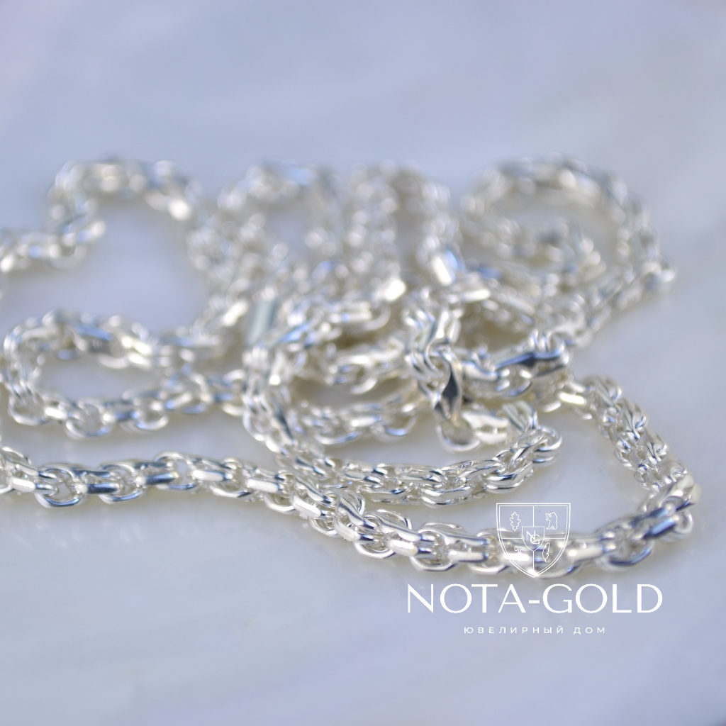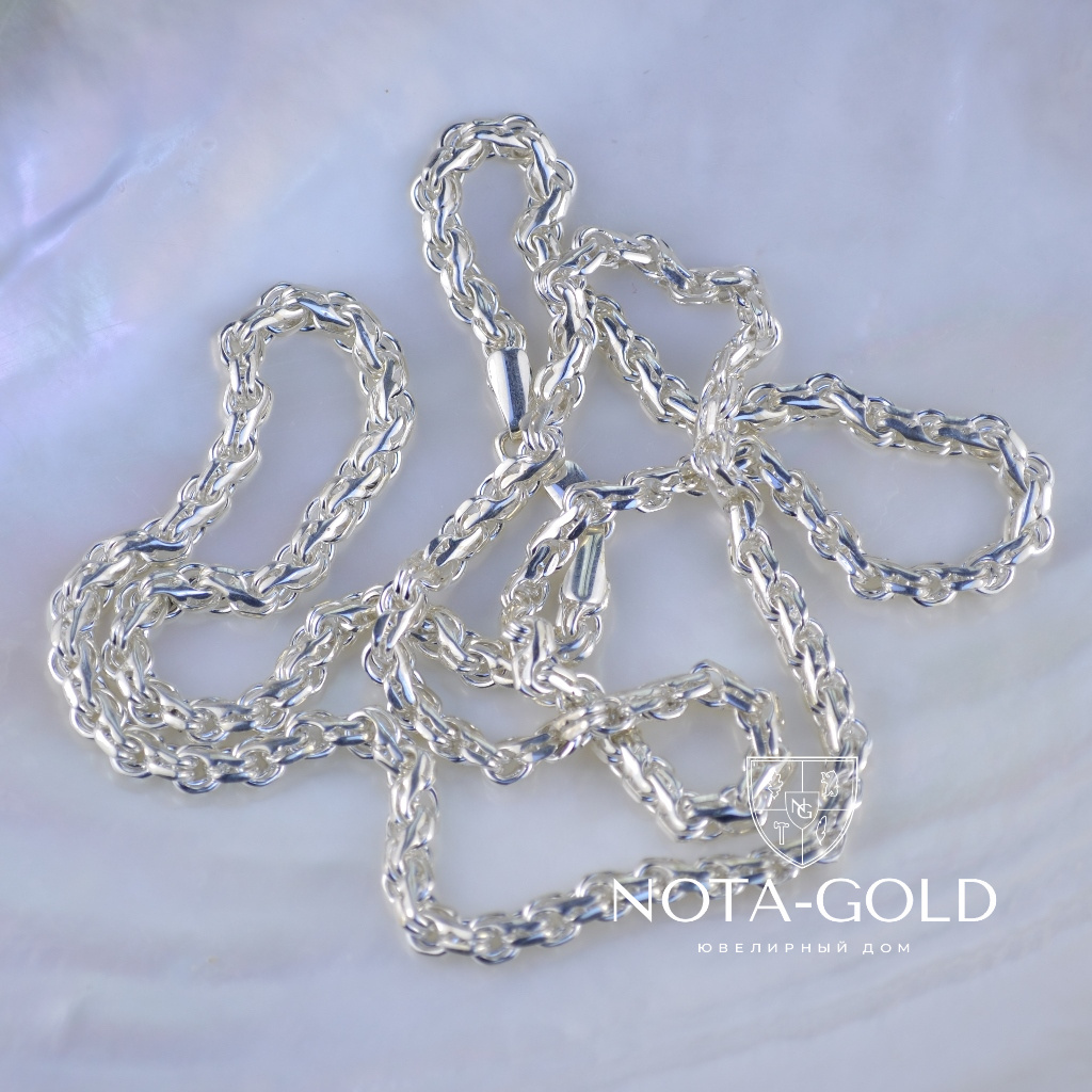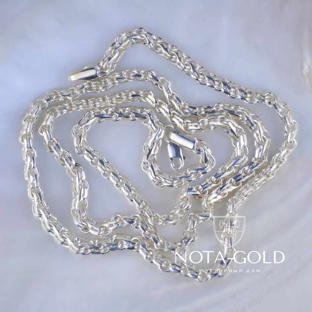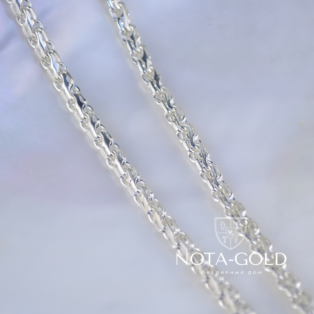 Серебряная цепочка на заказ плетение Ручеек может быть изготовлена из серебра Мастерской или из серебра Заказчика. Серебряная цепочка на заказ данного плетения может быть изготовлена любого веса (не менее минимально указанного для определённой длинны)