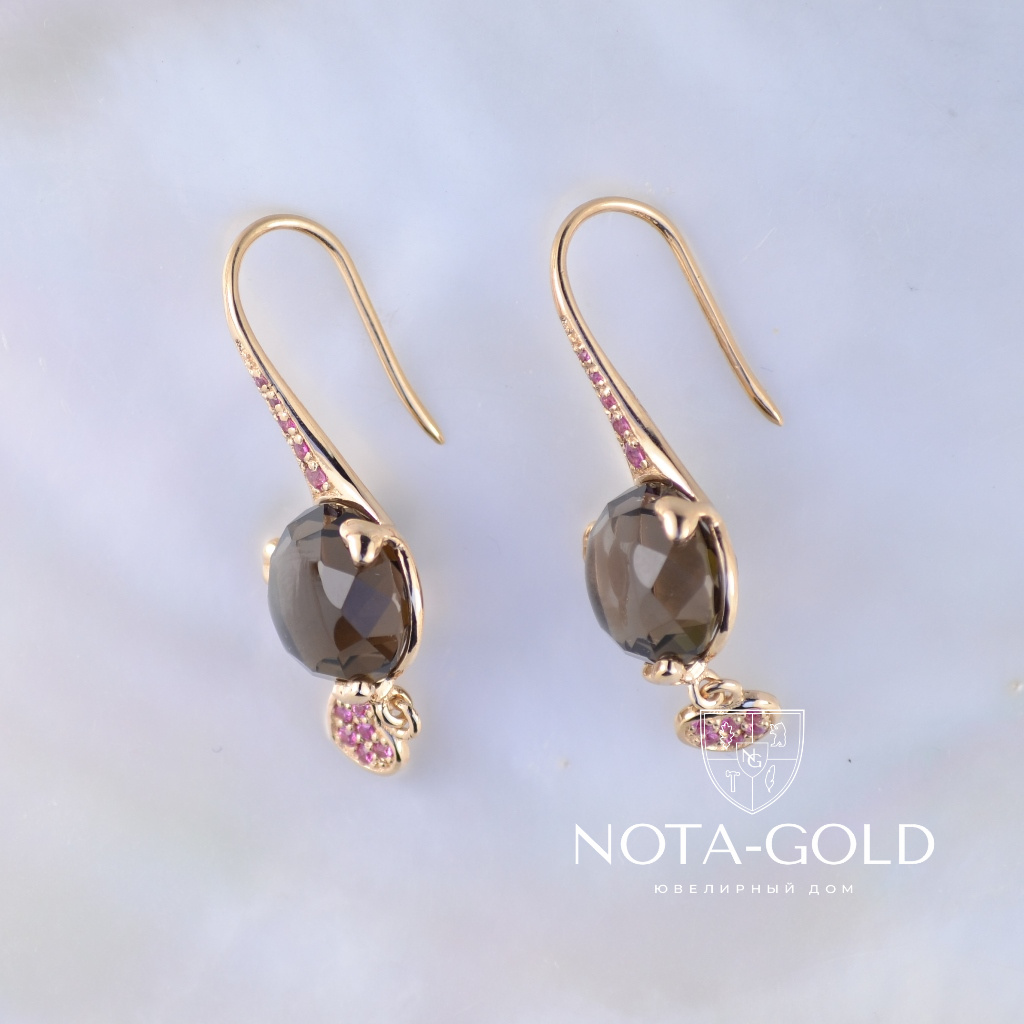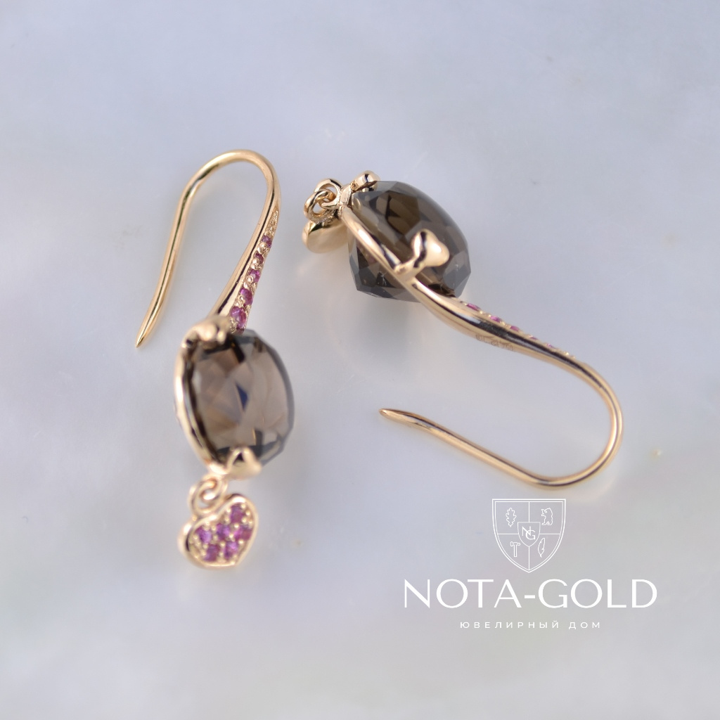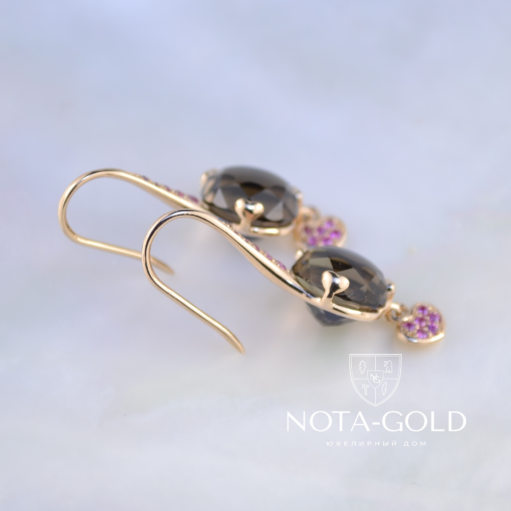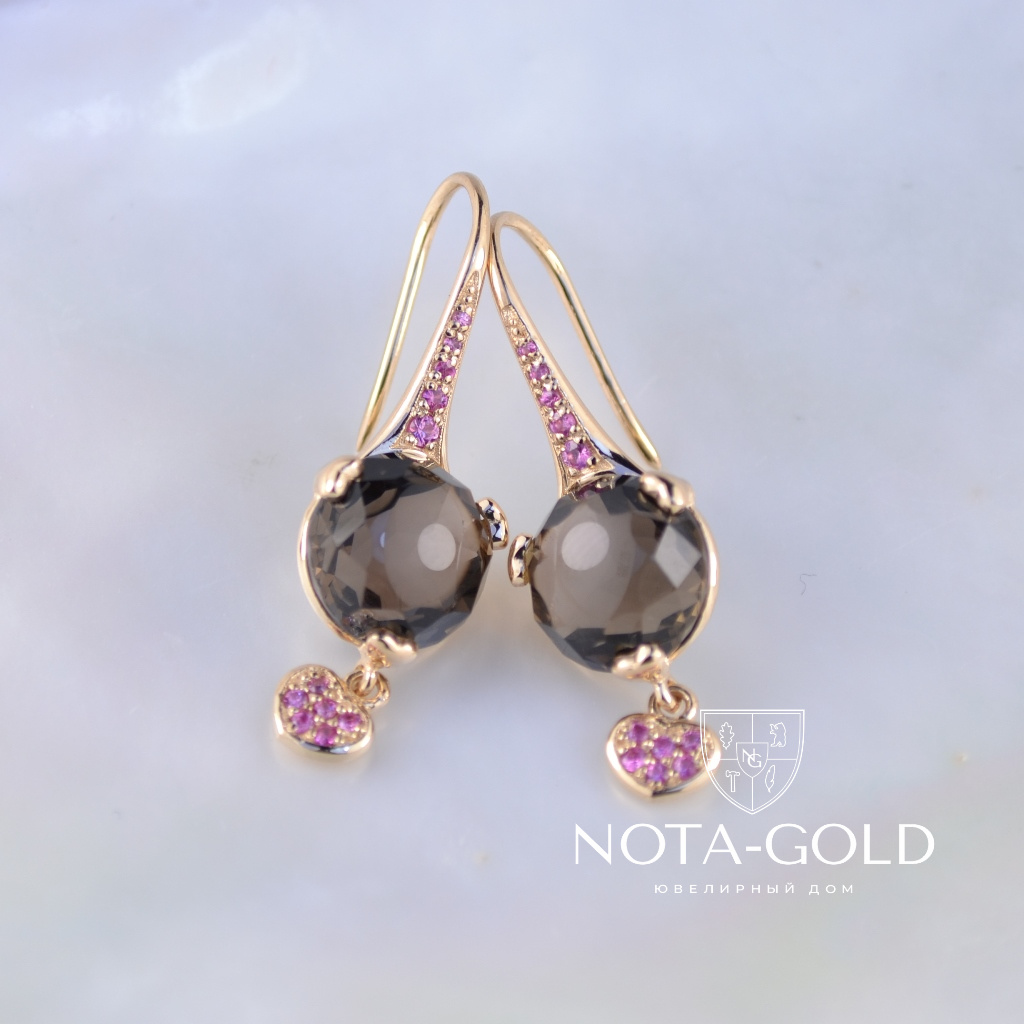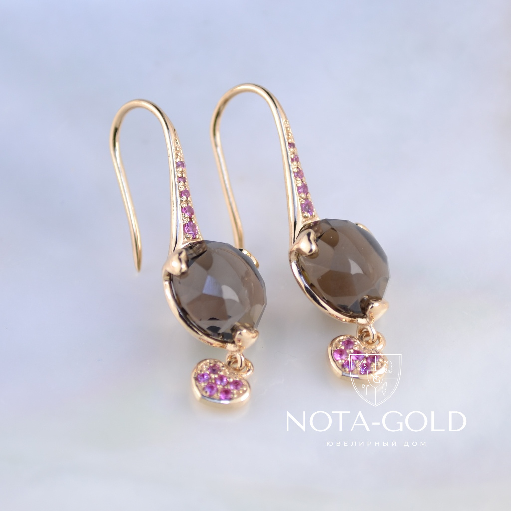 Серьги из красного золота с раухтопазами, сапфирами и подвесками в виде сердец (Вес 6 гр.)