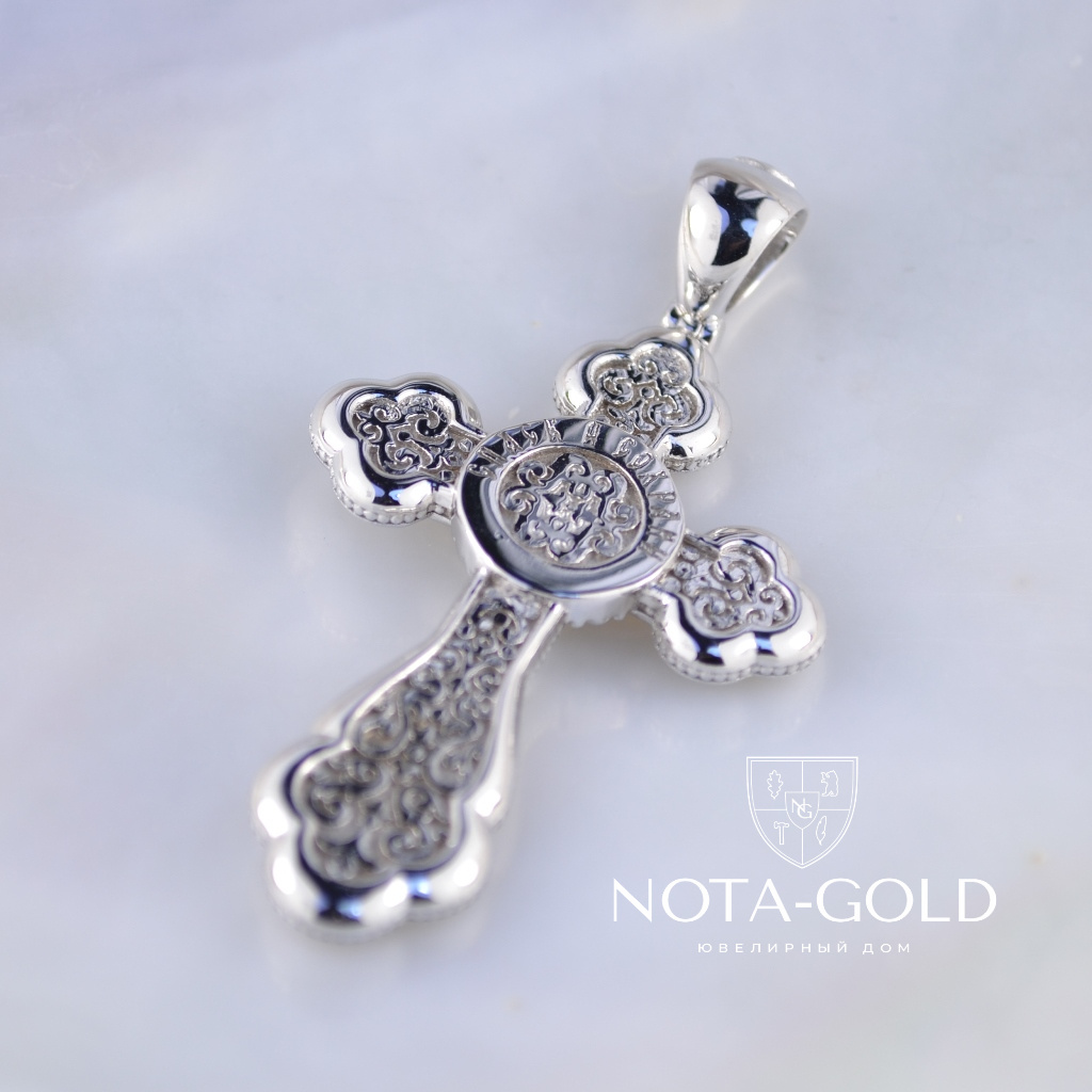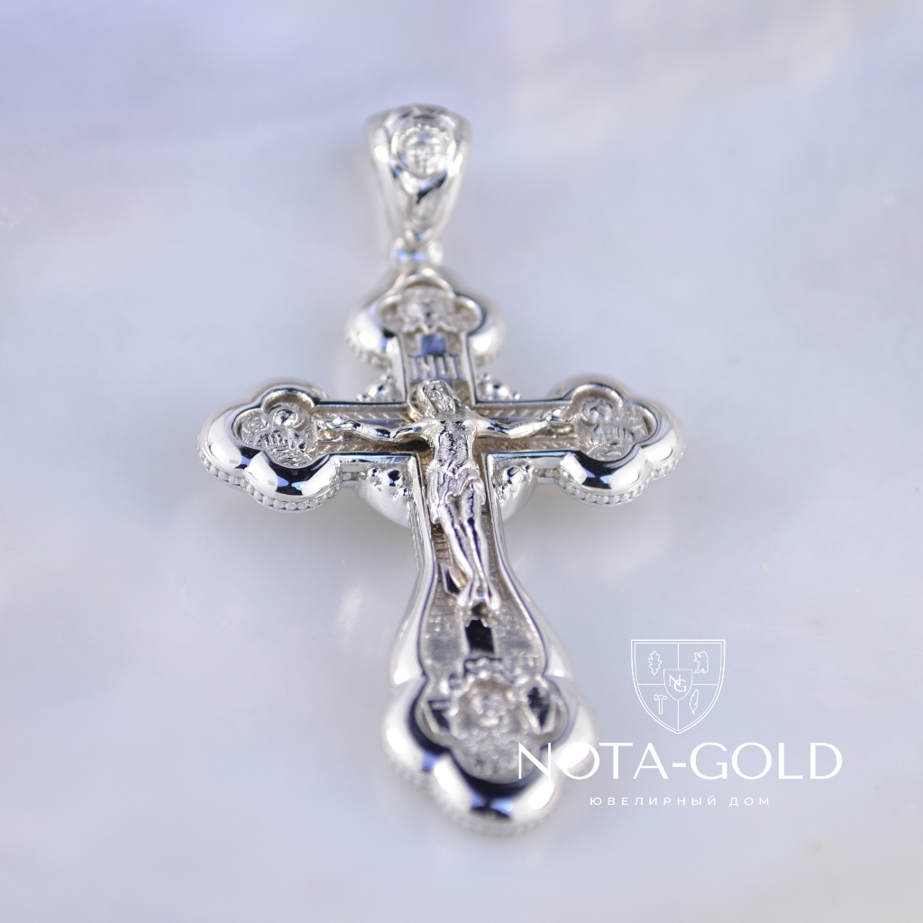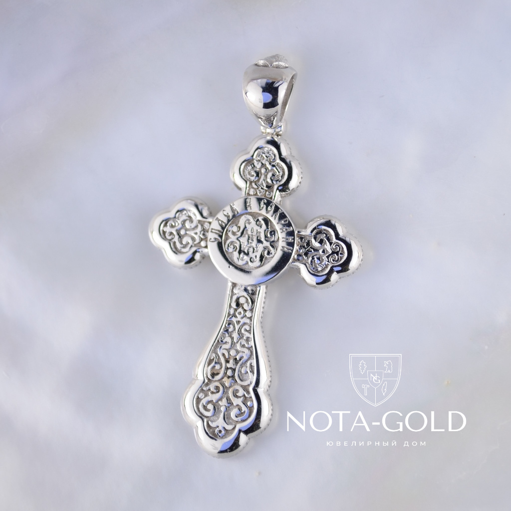 Эксклюзивный крест из белого золота Распятие Иисуса Христа и лик Божья Матерь (Вес 15 гр.)