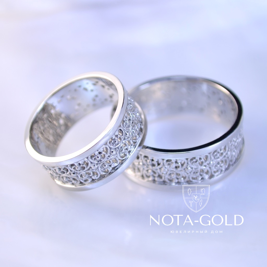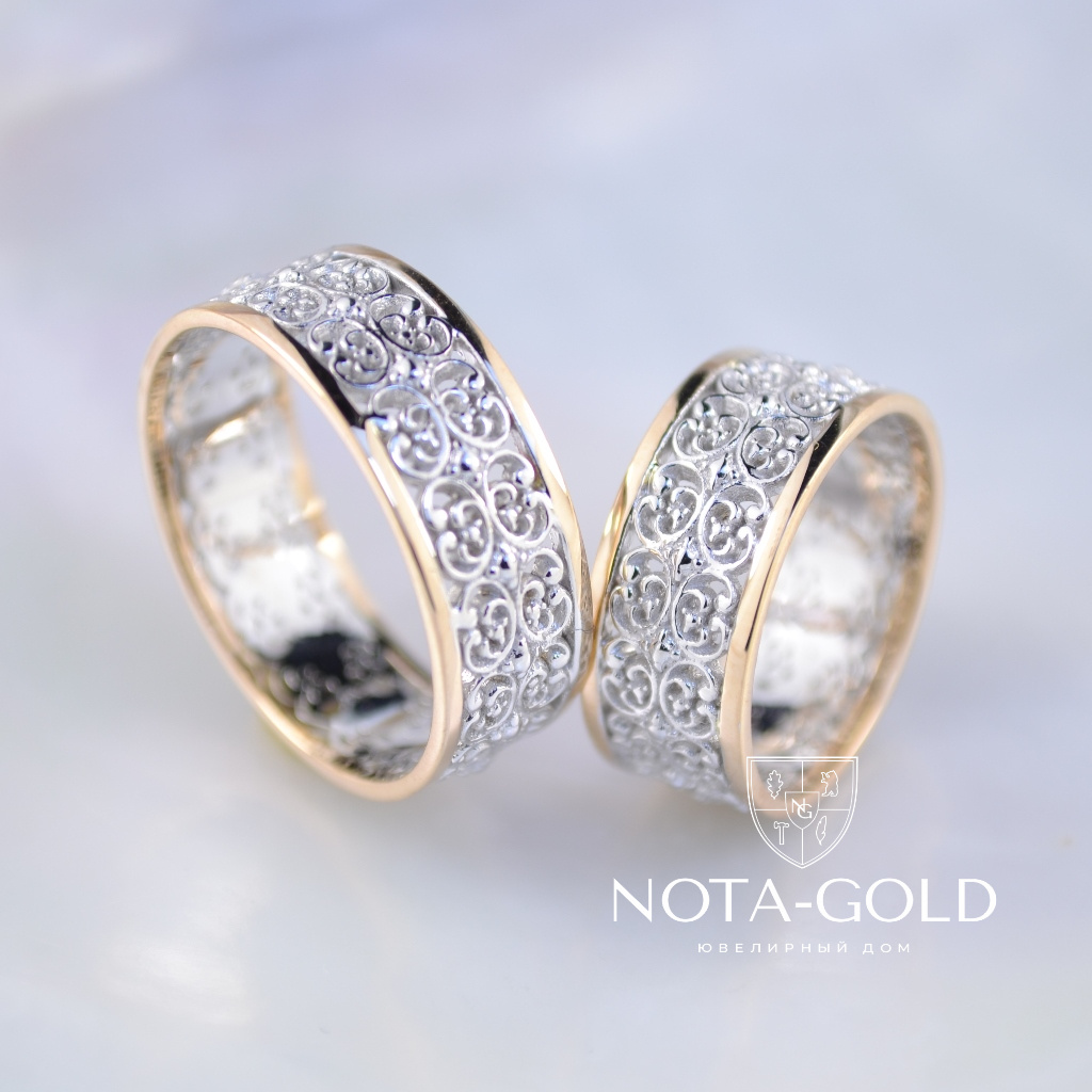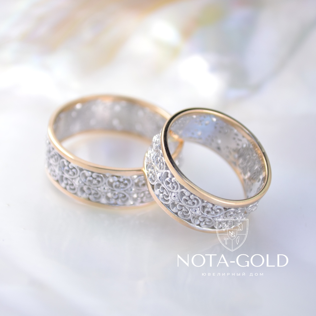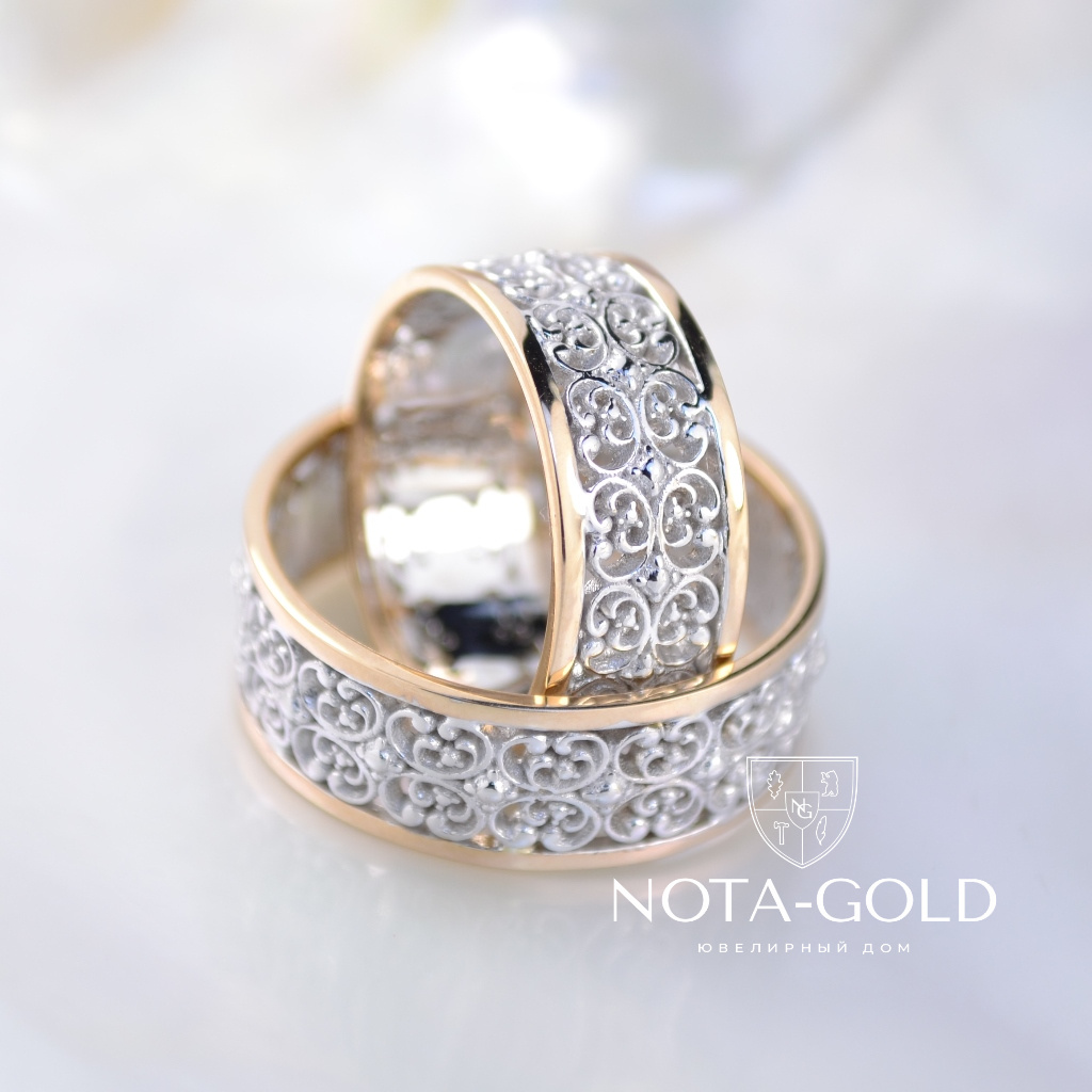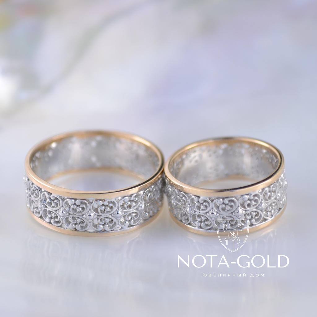 Двухцветные обручальные кольца с винтажным узором (Вес пары 8,5 гр.)