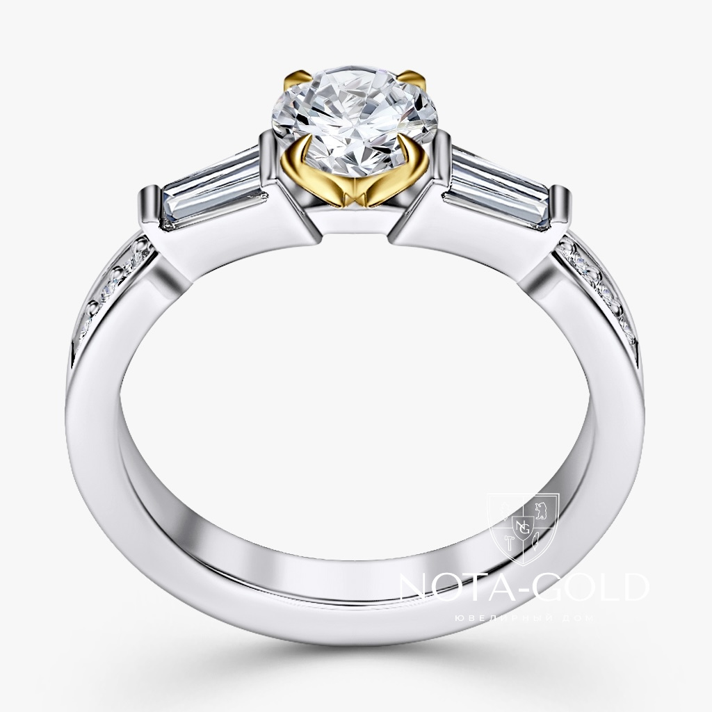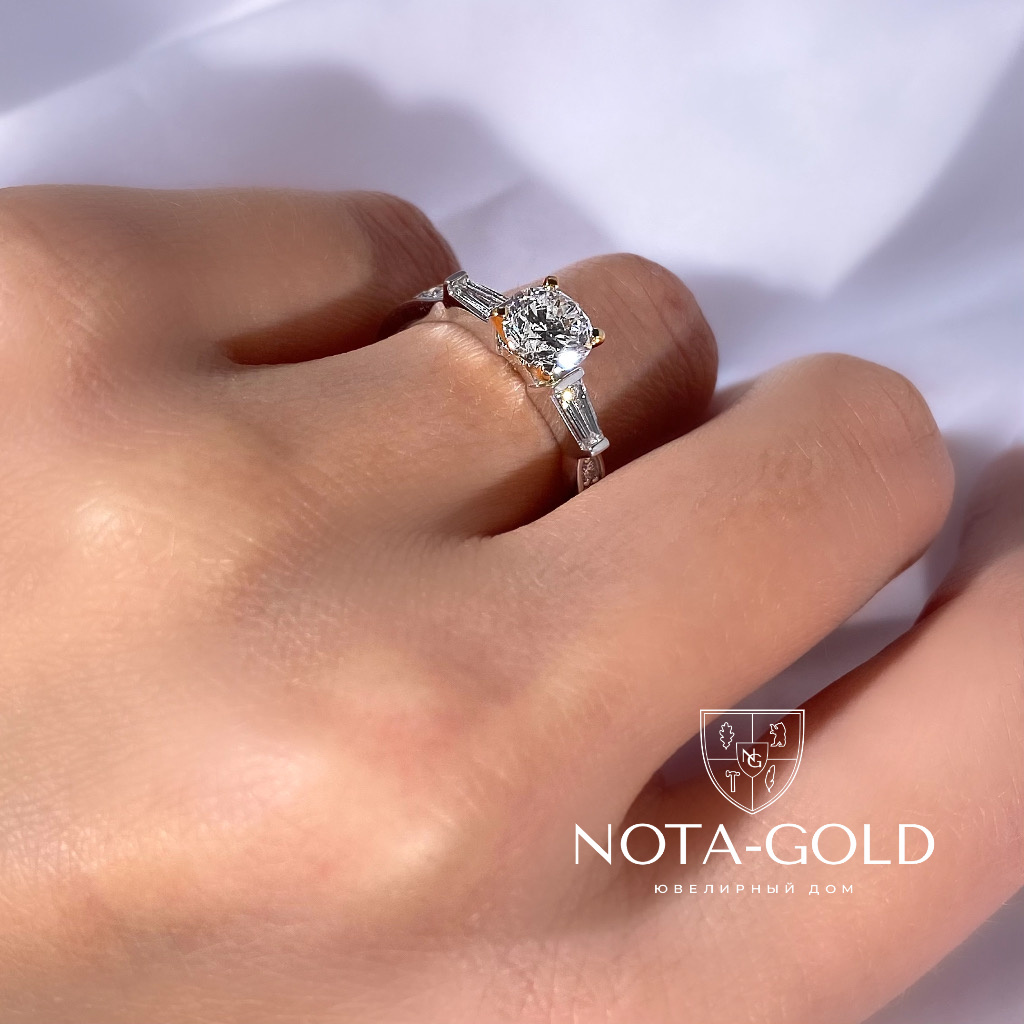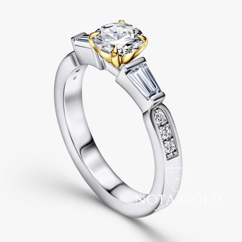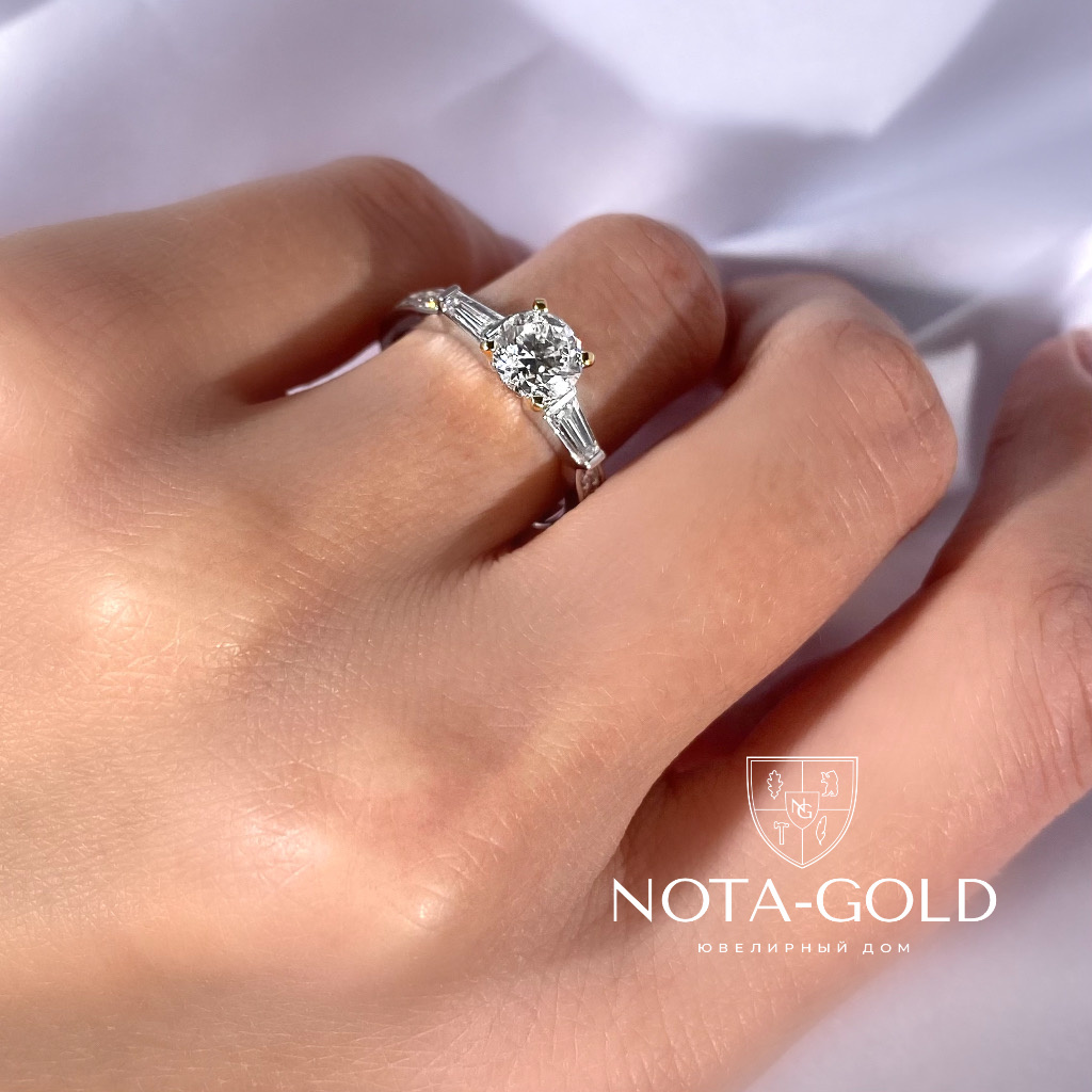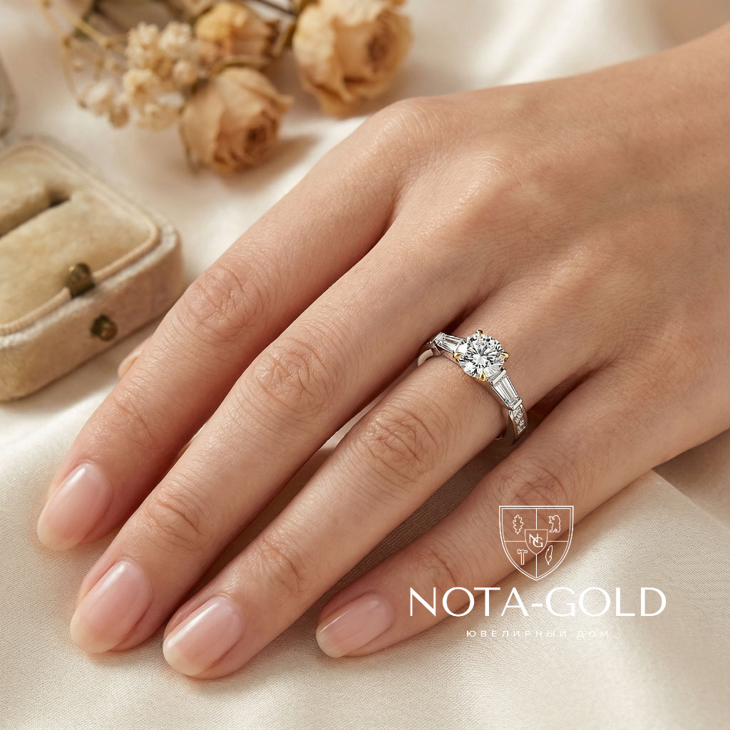 Бриллиант в окружении двух трапециевидных бриллиантов, расположенных по бокам от центрального камня, создает сбалансированную и гармоничную композицию.