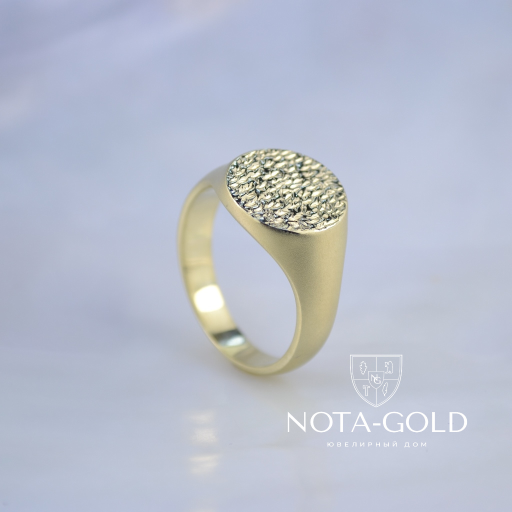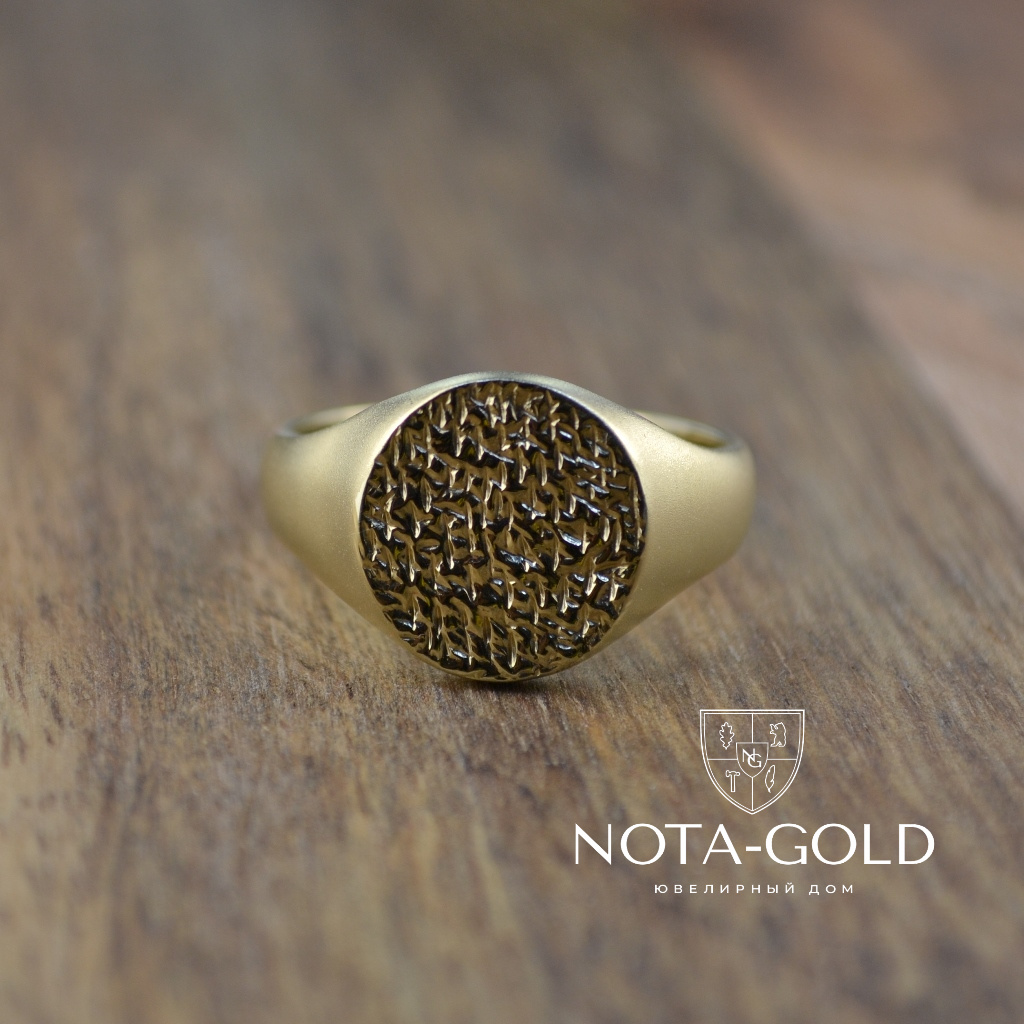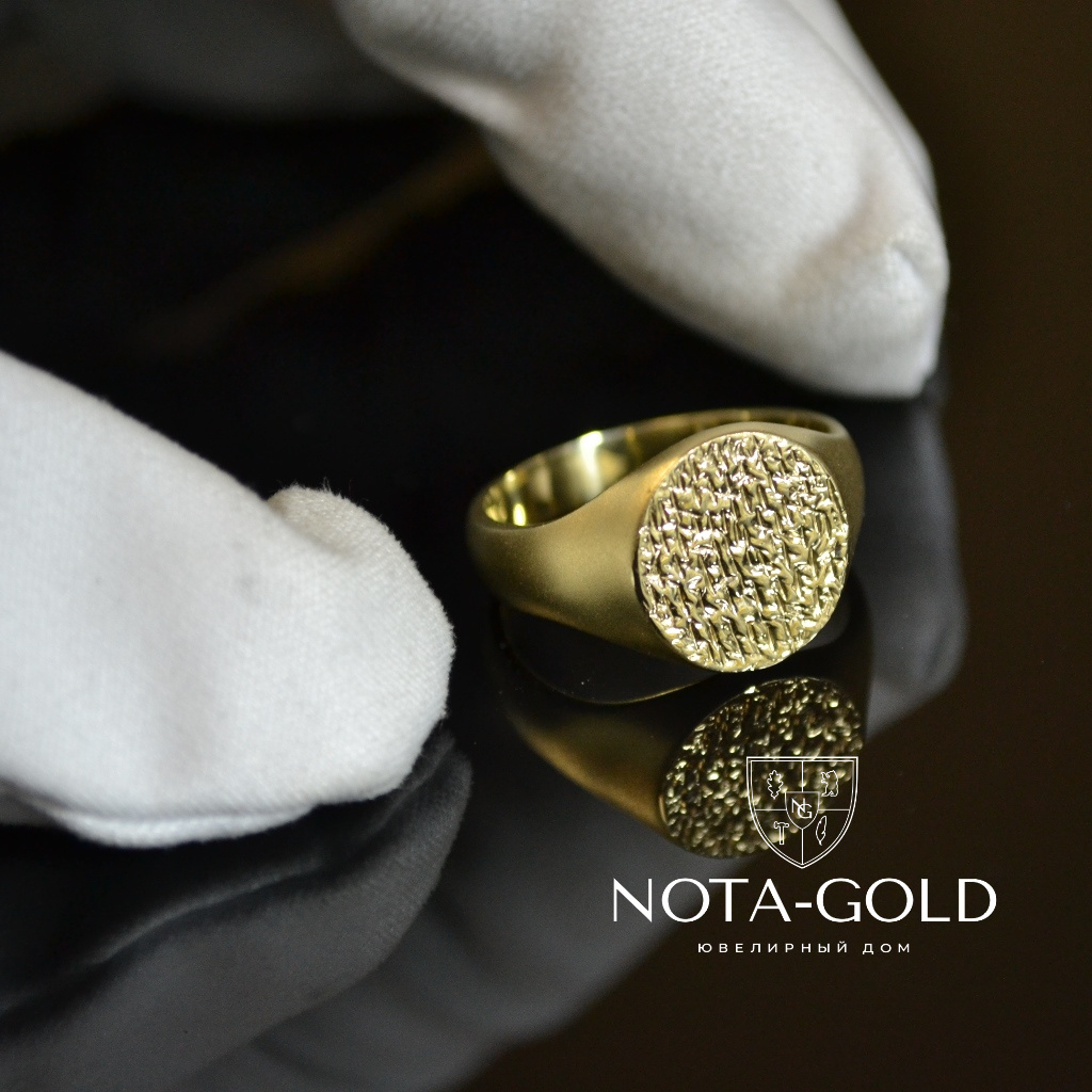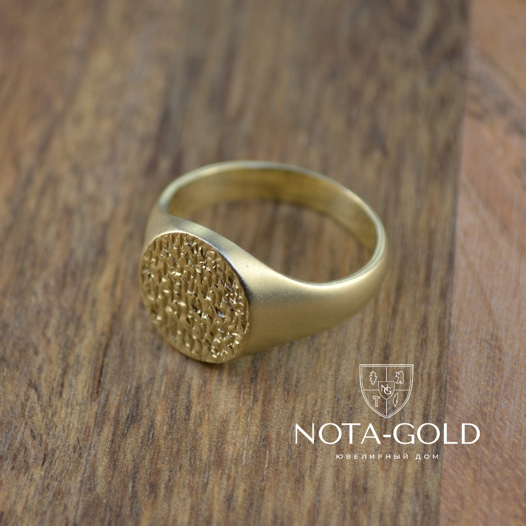 Мужское кольцо-печатка из матового золота с рельефной площадкой (Вес: 10 гр.)