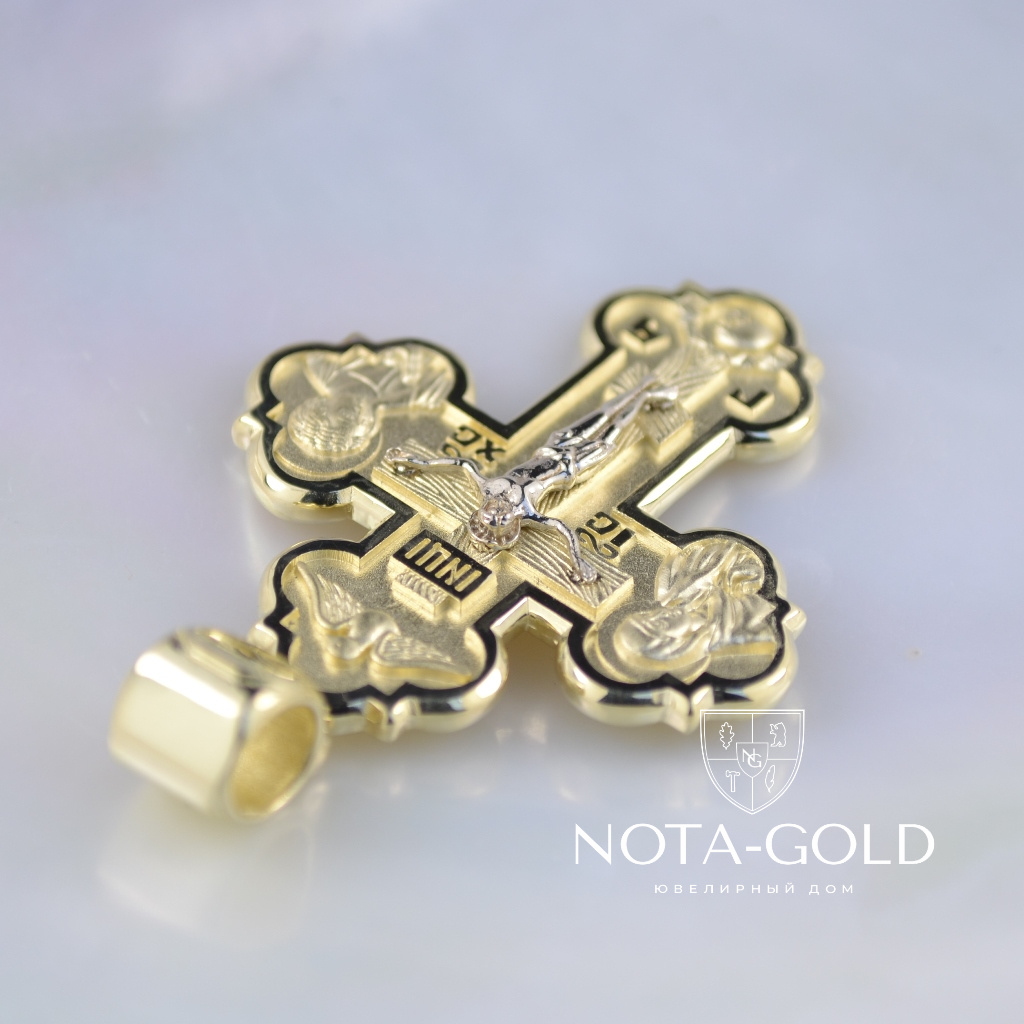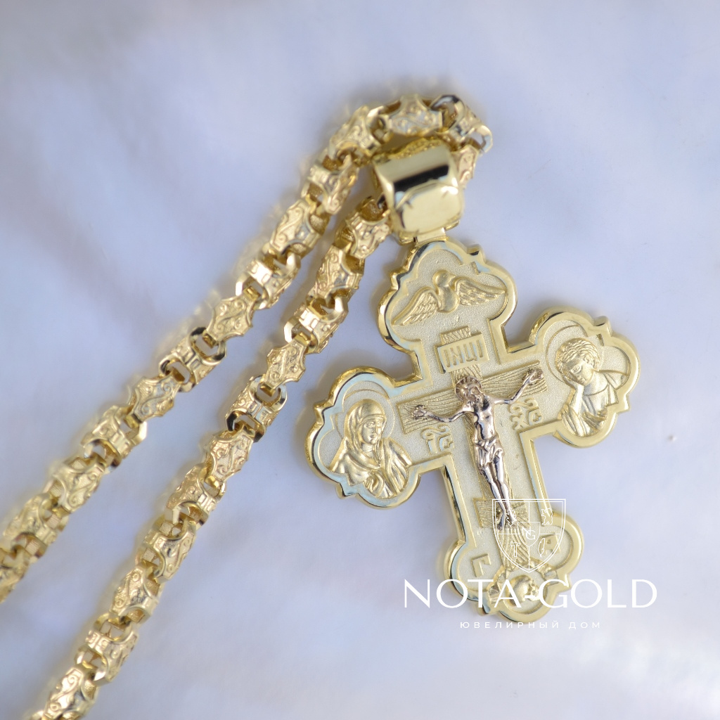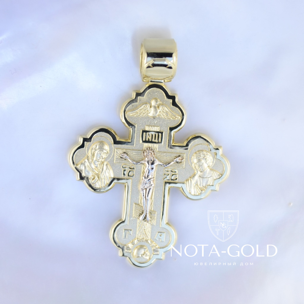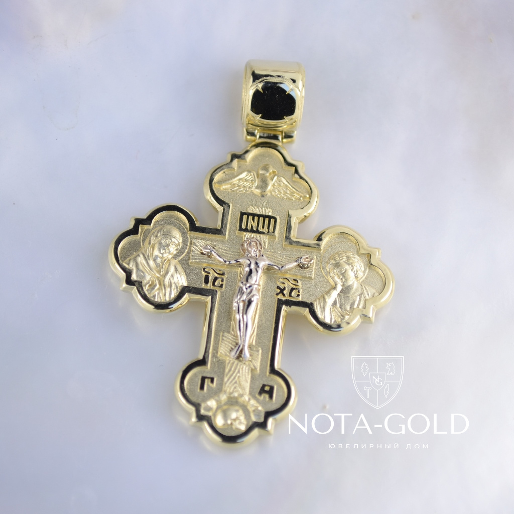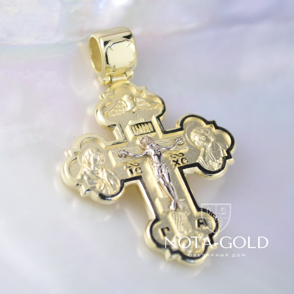 Нательный крест из жёлтого золота с распятием, ликами, гравировкой Спаси и сохрани (Вес 17 гр.)