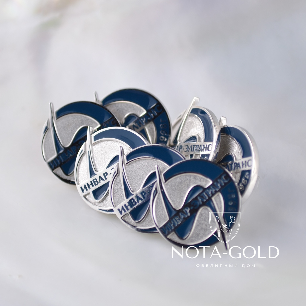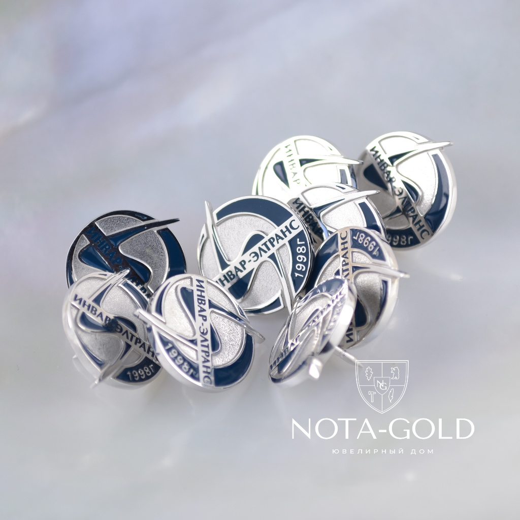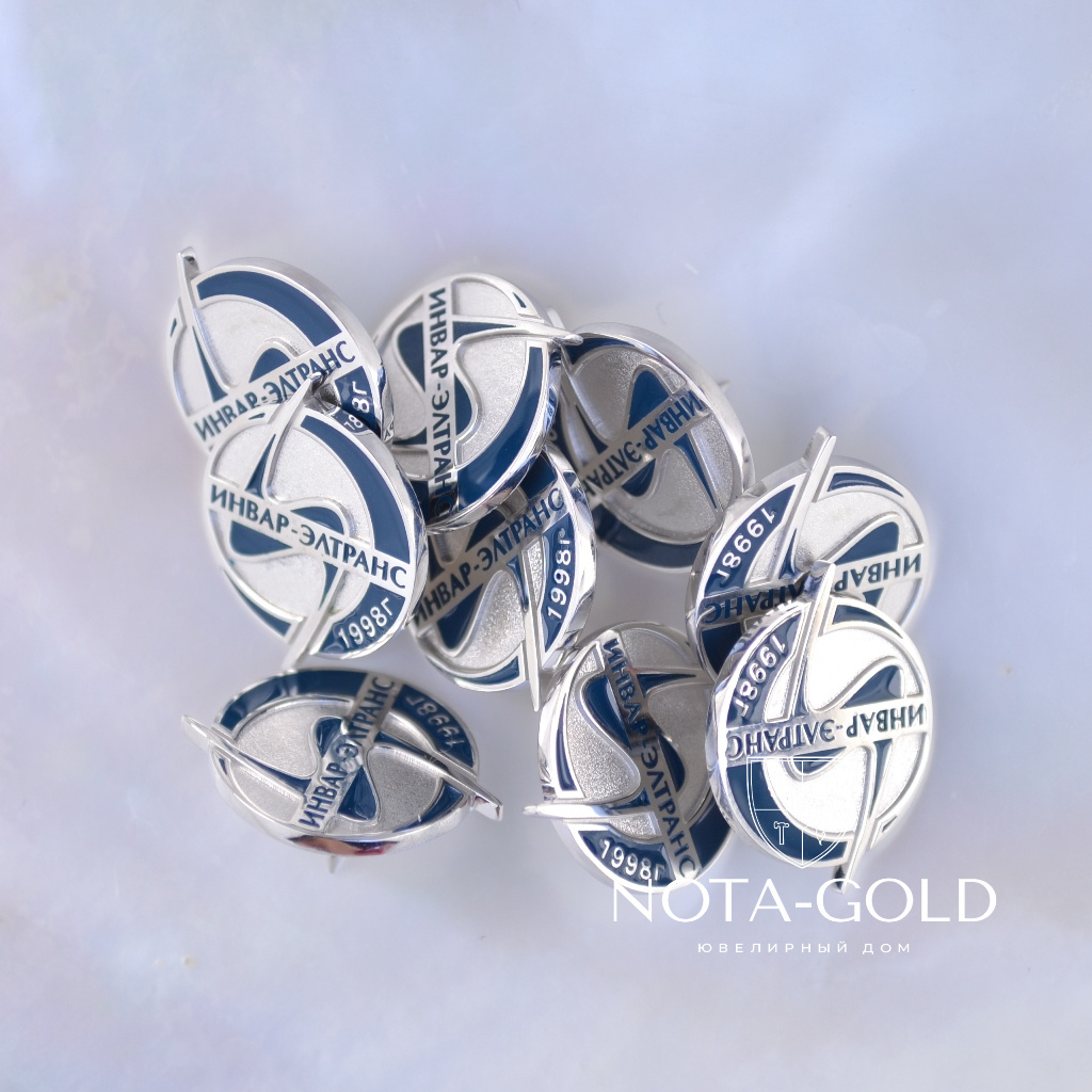 Партия нагрудных значков из серебра и белого золота с эмалью и логотипом компании