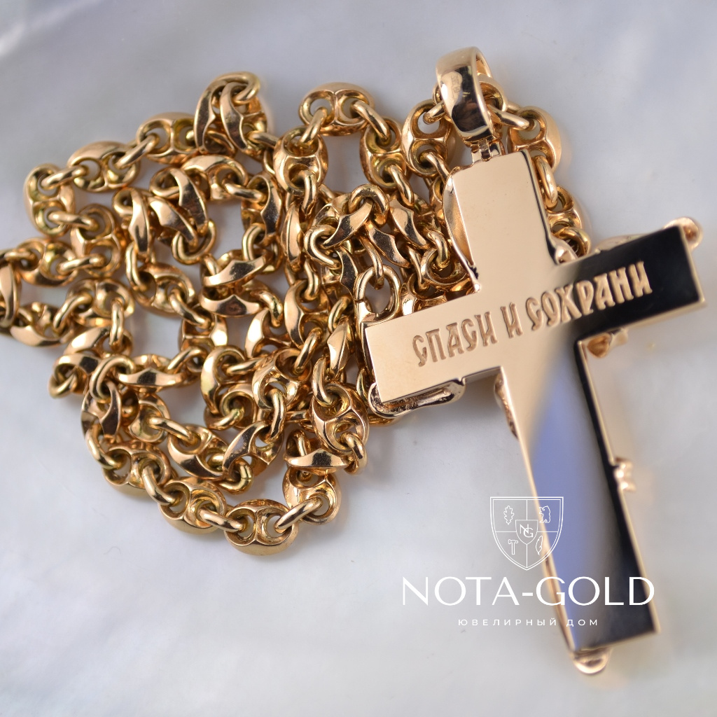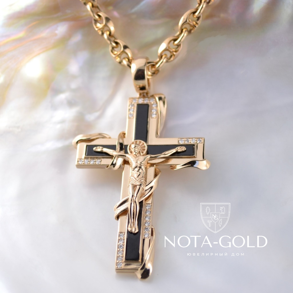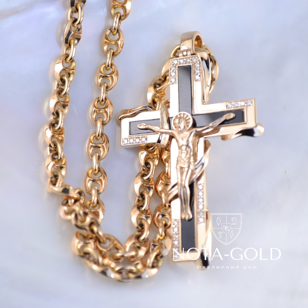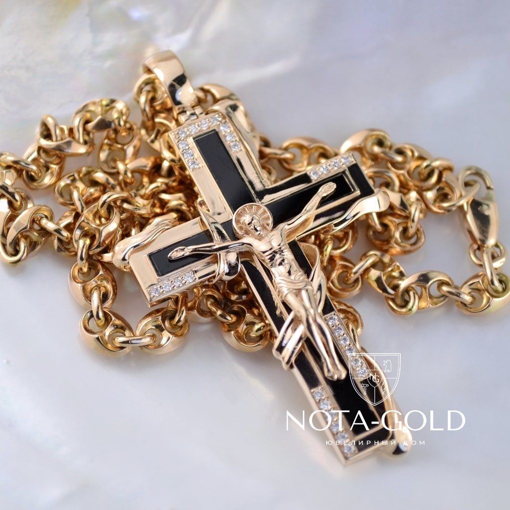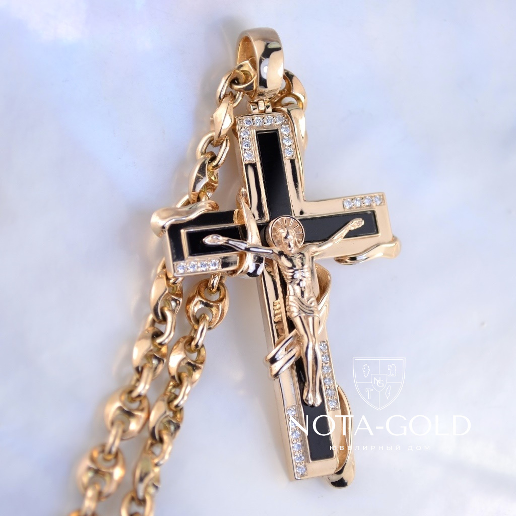 Мужской крест из красного золота с распятием, ониксом, бриллиантами на цепочке плетение Гачи (Вес: 60,5 гр.)