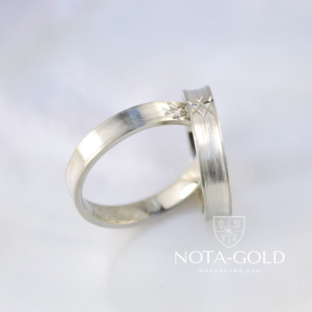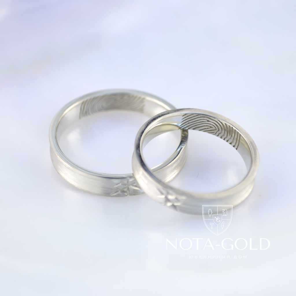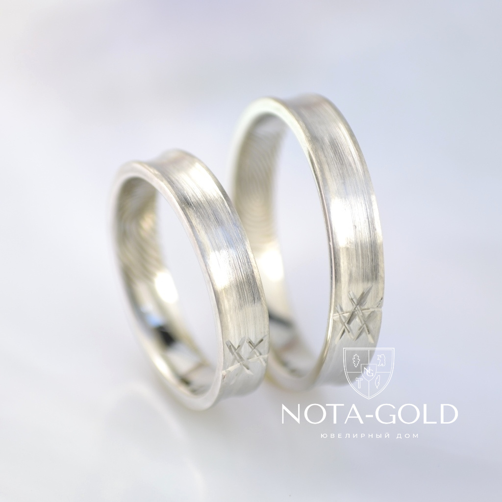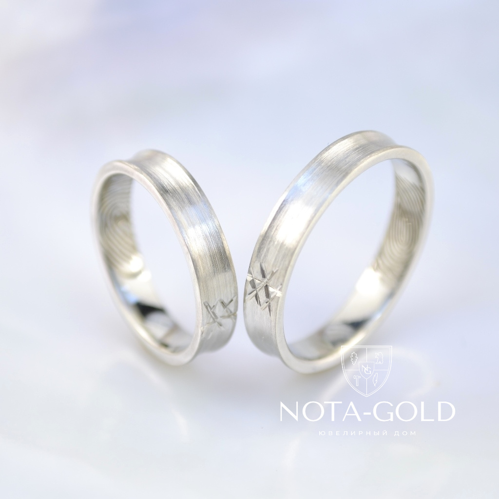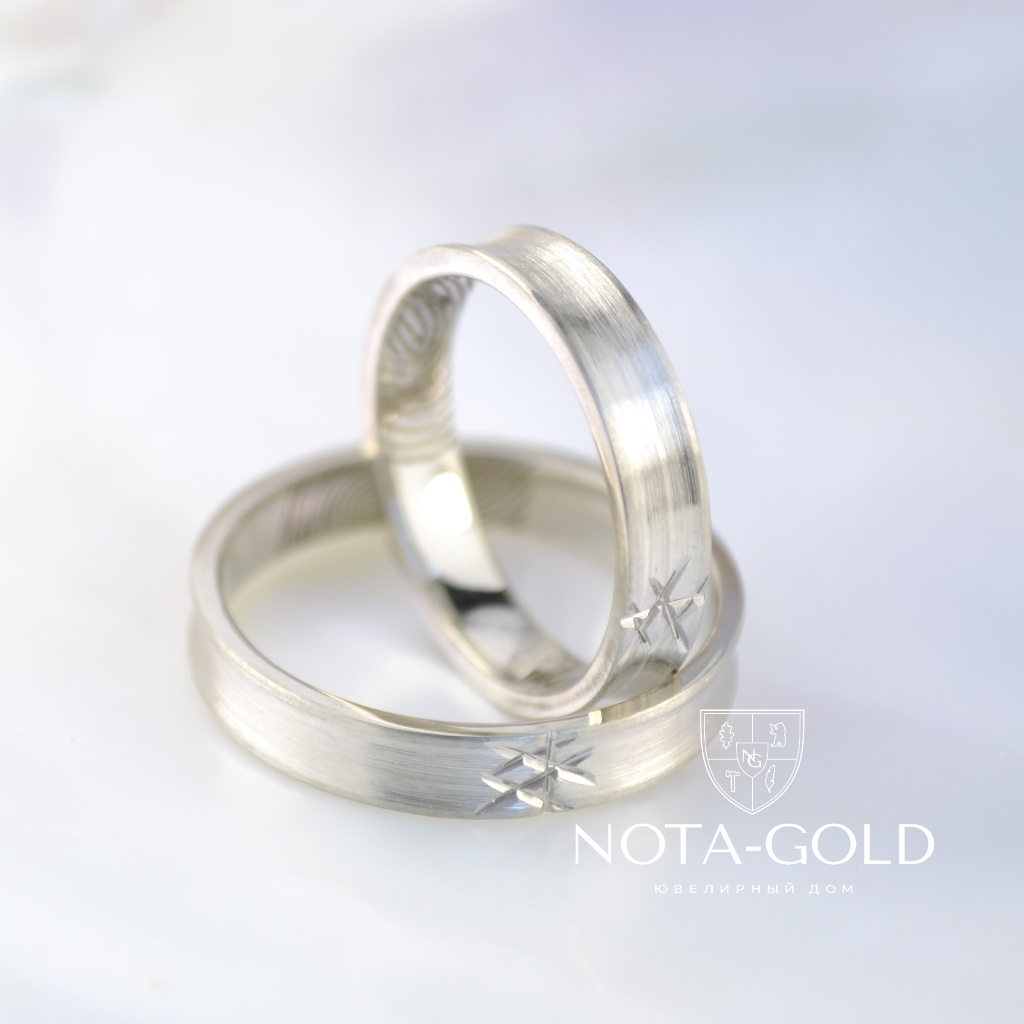 Матовые вогнутые обручальные кольца с отпечатками пальцев и гравировкой символа (Вес пары: 7,5 гр.)