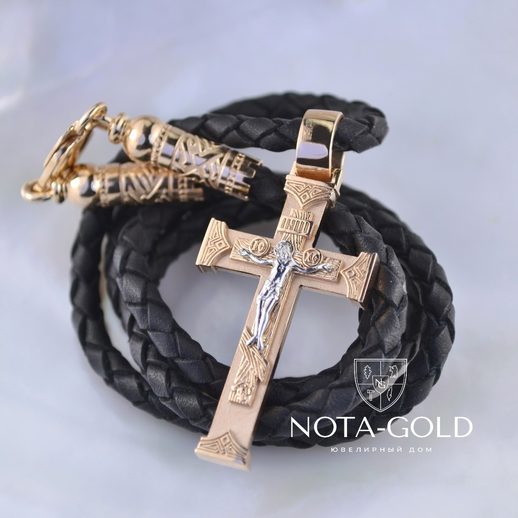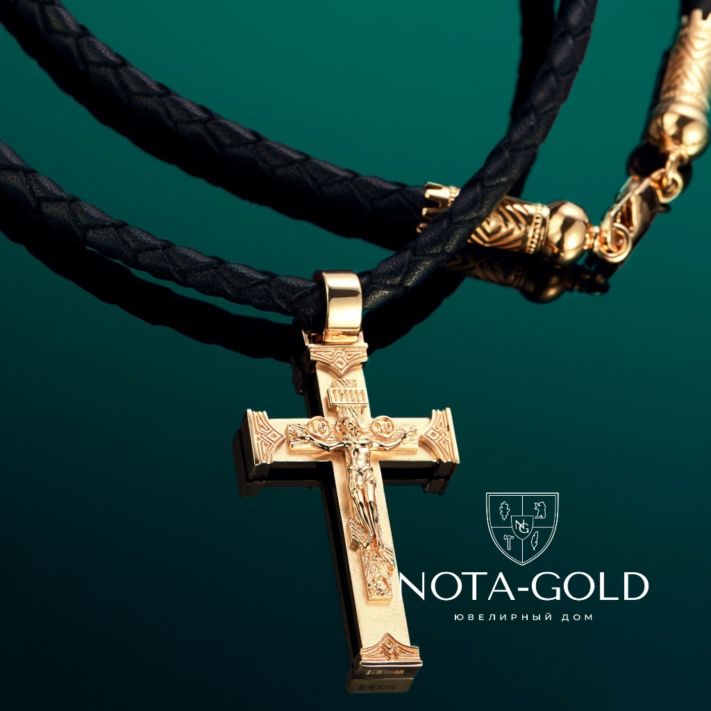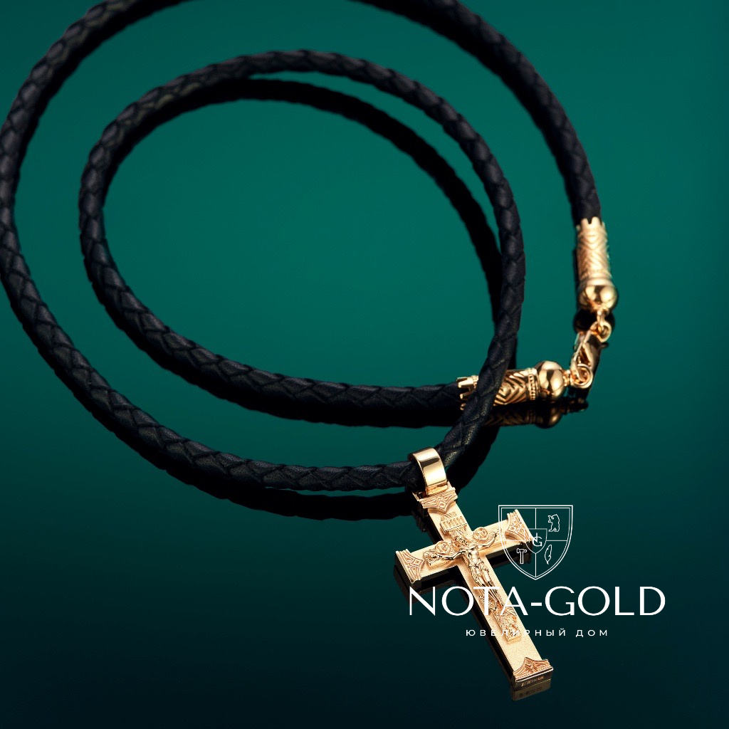 Именной нательный золотой крест с бриллиантом на шнурке-гайтане из натуральной кожи (Вес 18 гр.)