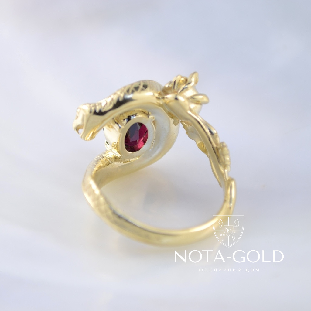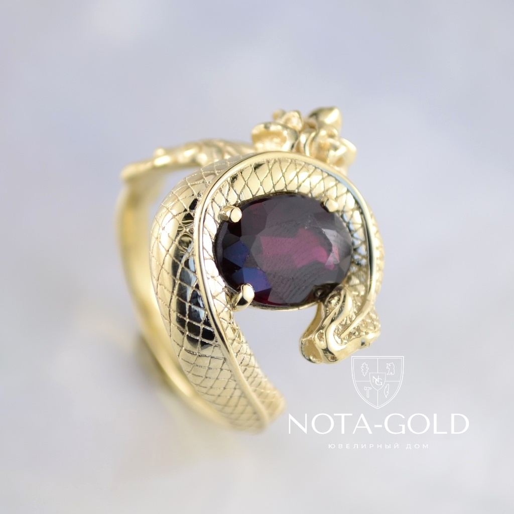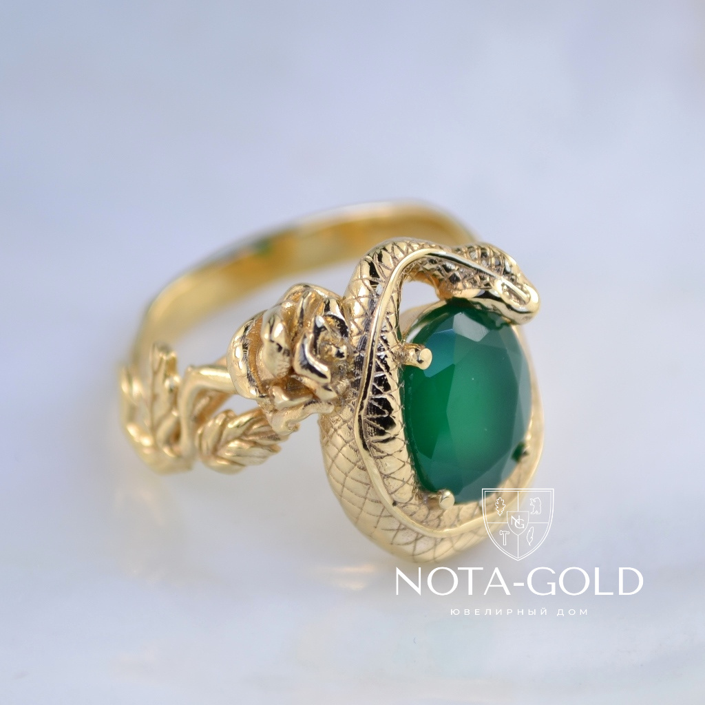 Золотое кольцо из жёлтого золота с драгоценным камнем, змеей и цветком (Вес: 15,5 гр.)
