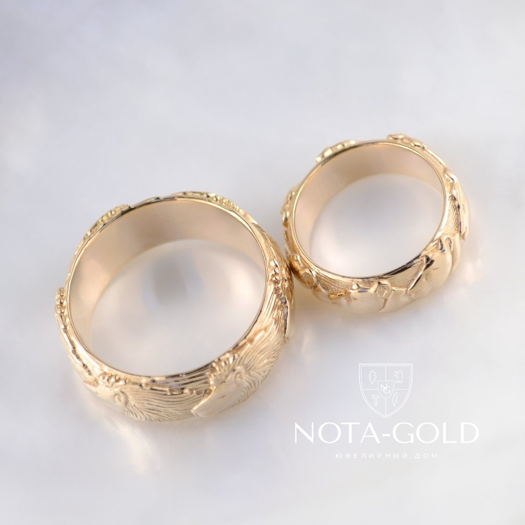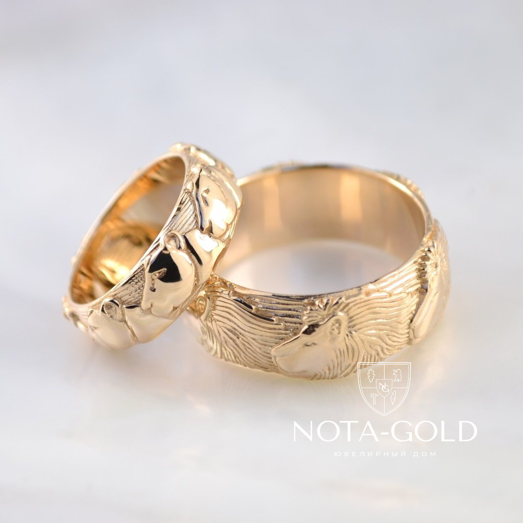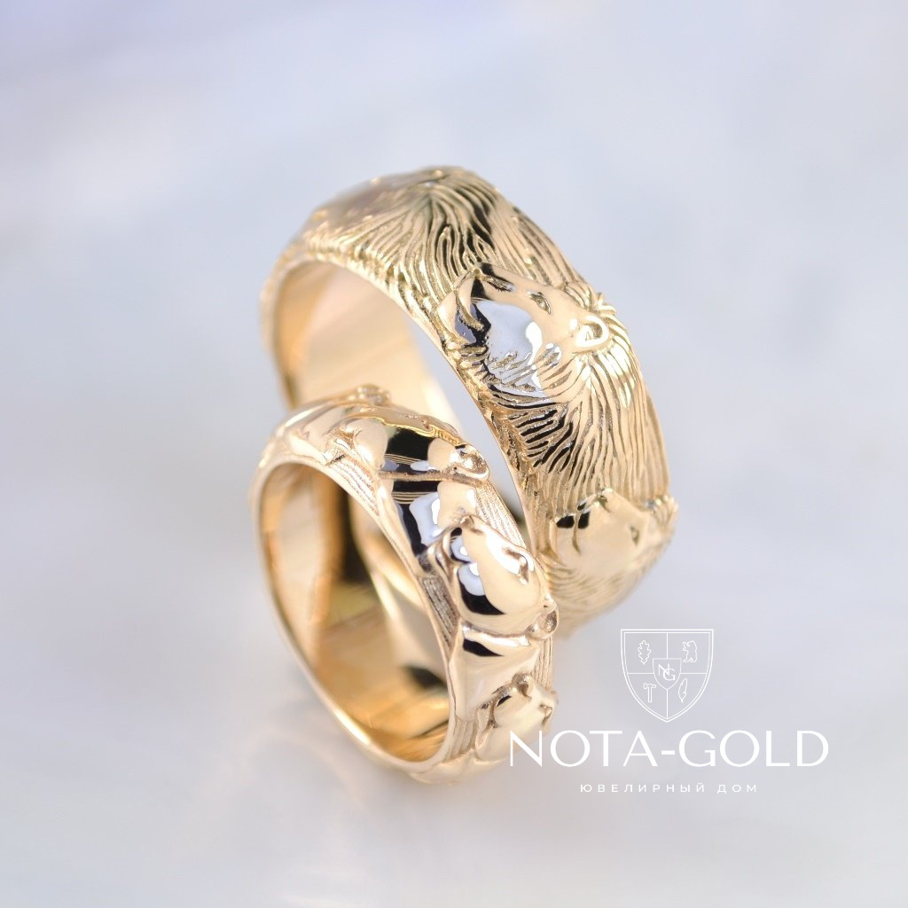 Обручальные кольца из красного золота с львами и львицами на заказ (Вес пары:25 гр.)