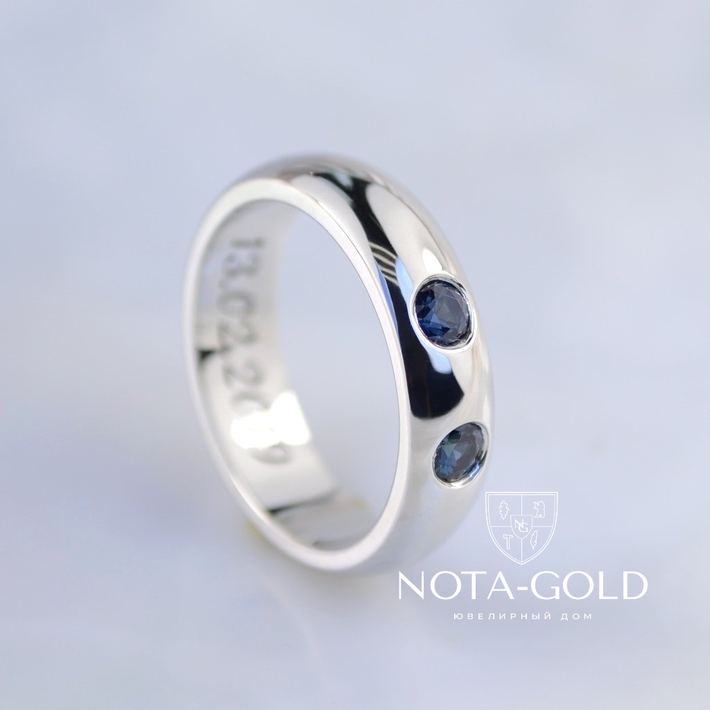 Мужское кольцо на заказ из белого золота с сапфирами и датой рождения (Вес: 5 гр.)
