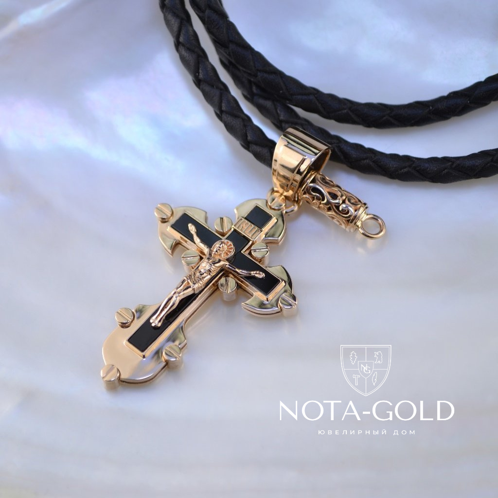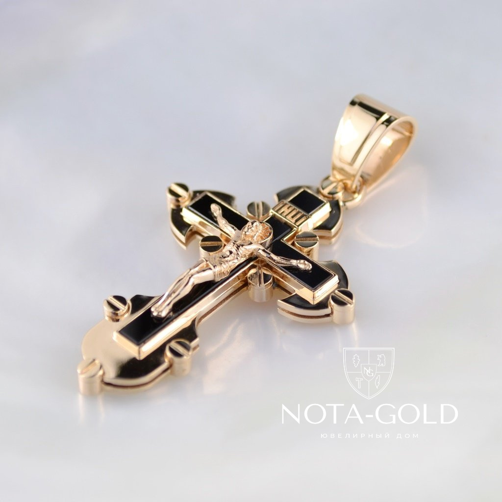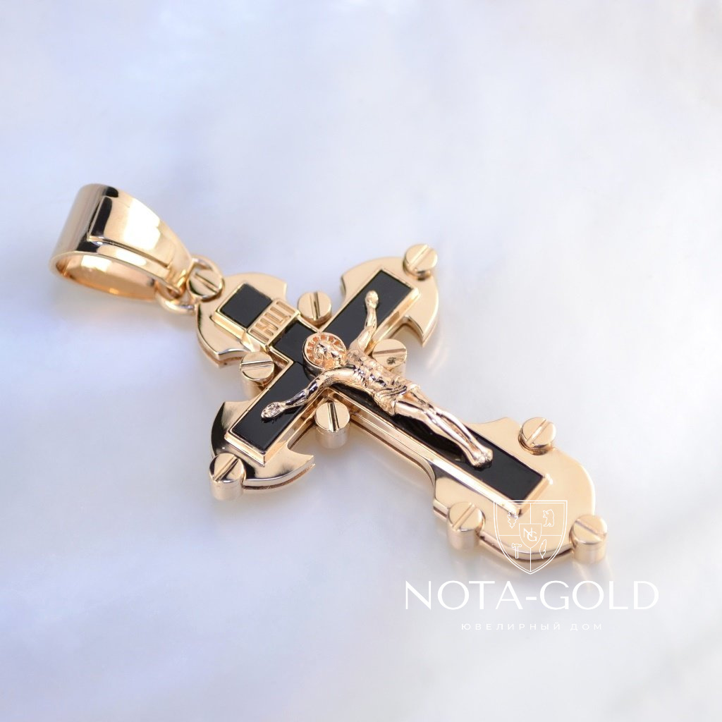 Мужской золотой крест из красного золота с распятием и чёрным ониксом на заказ (Вес 14 гр.)