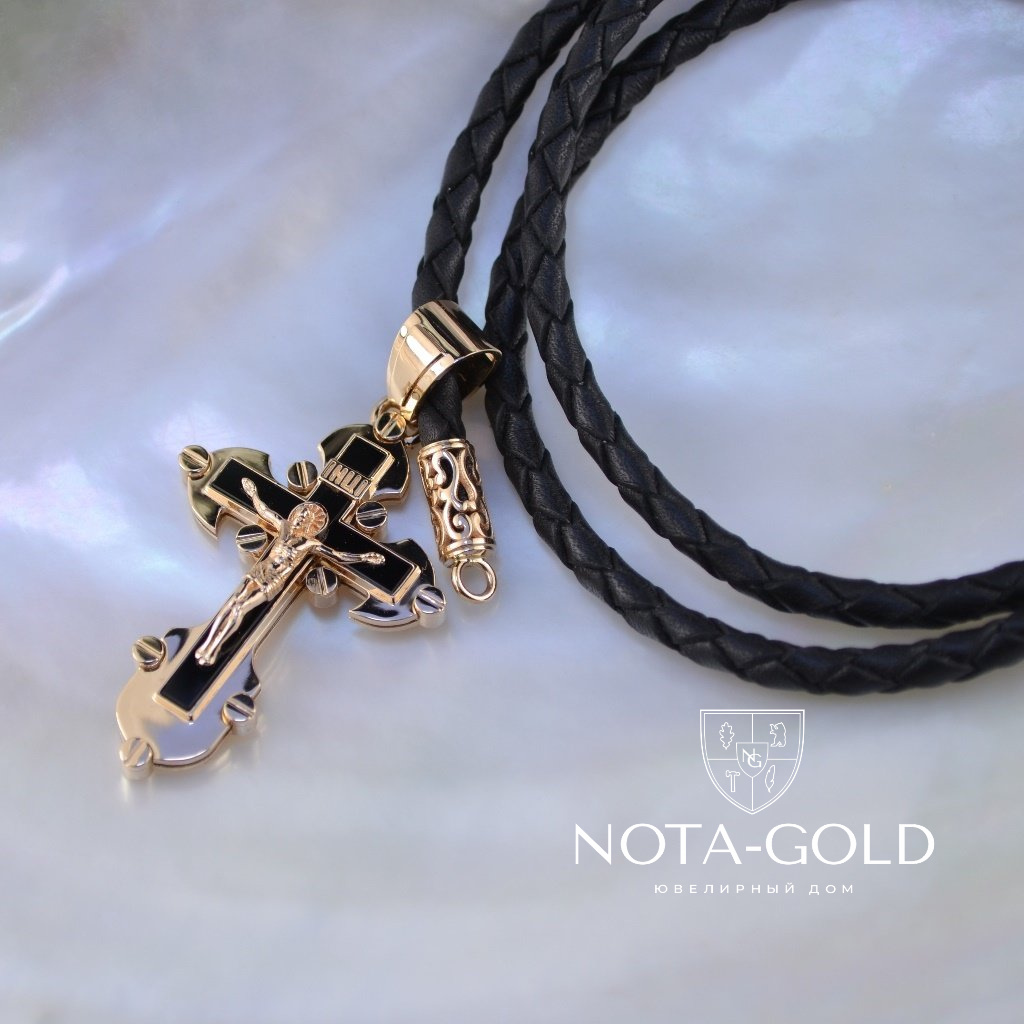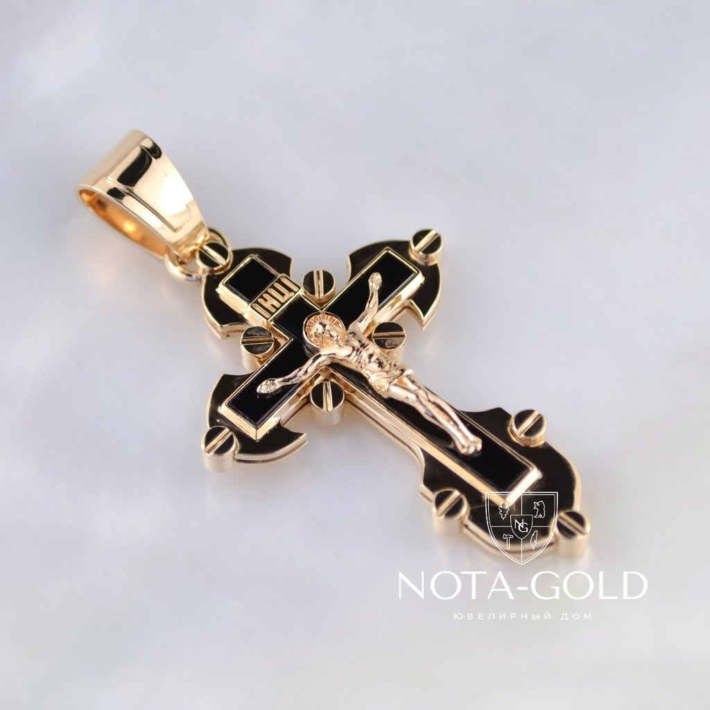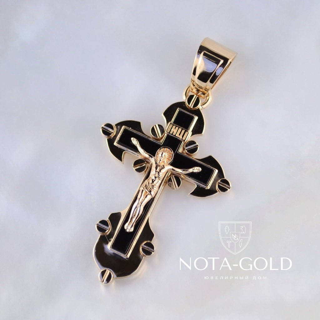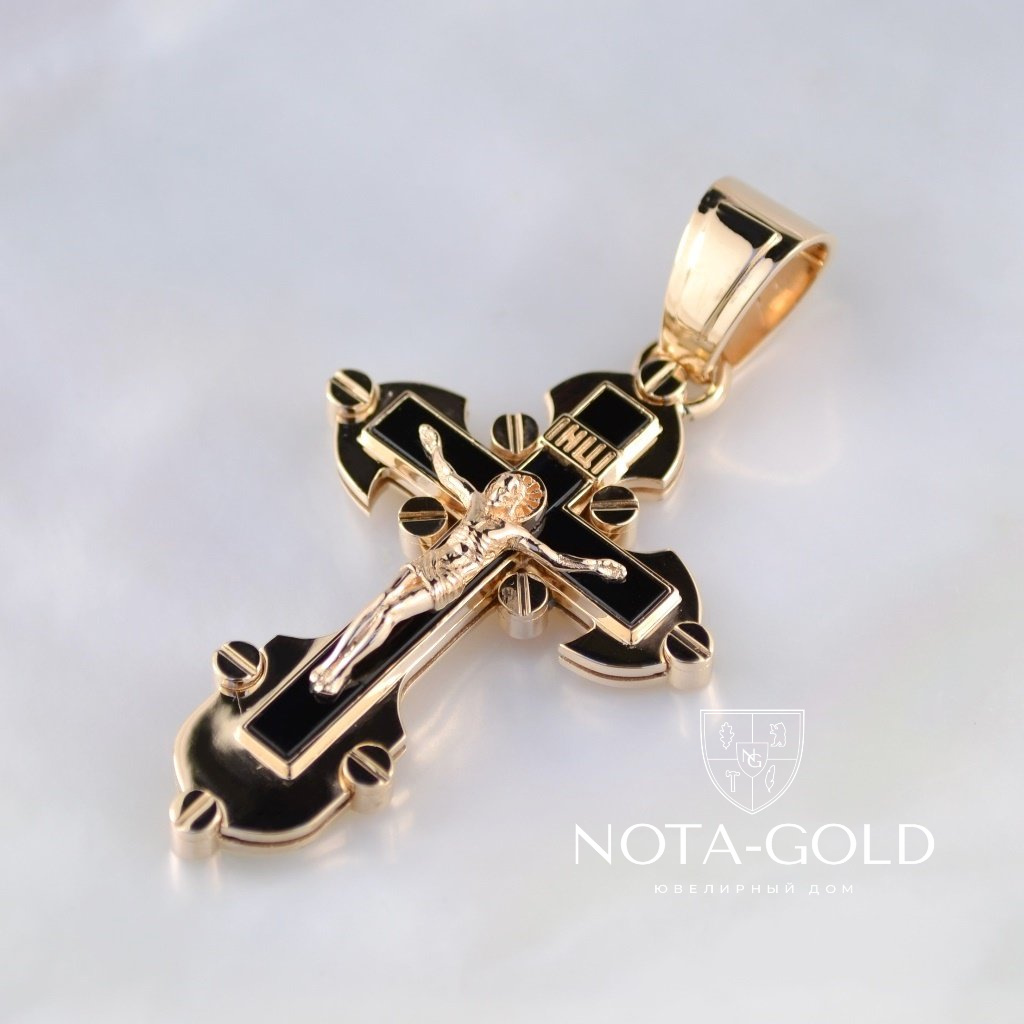 Мужской золотой крест из красного золота с распятием и чёрным ониксом на заказ (Вес 14 гр.)