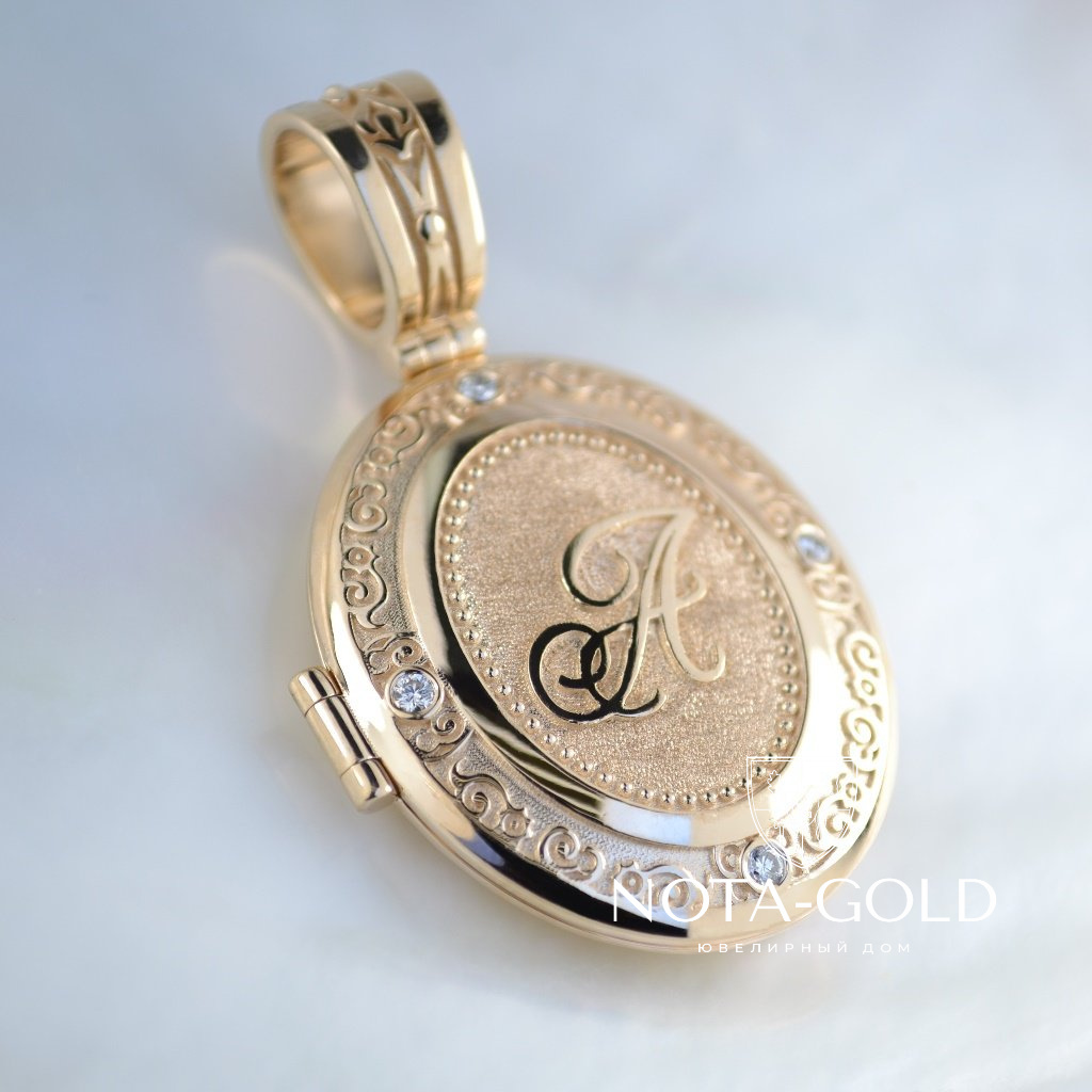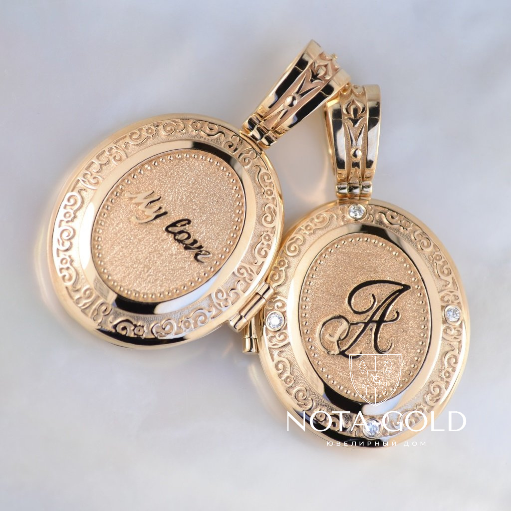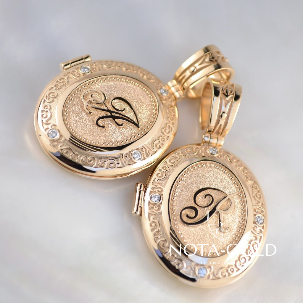 Парные именные медальоны на заказ из красного золота с бриллиантами и гравировкой (Вес: 35 гр.)