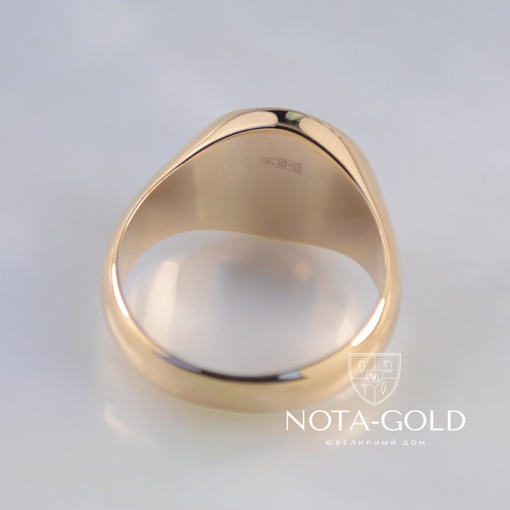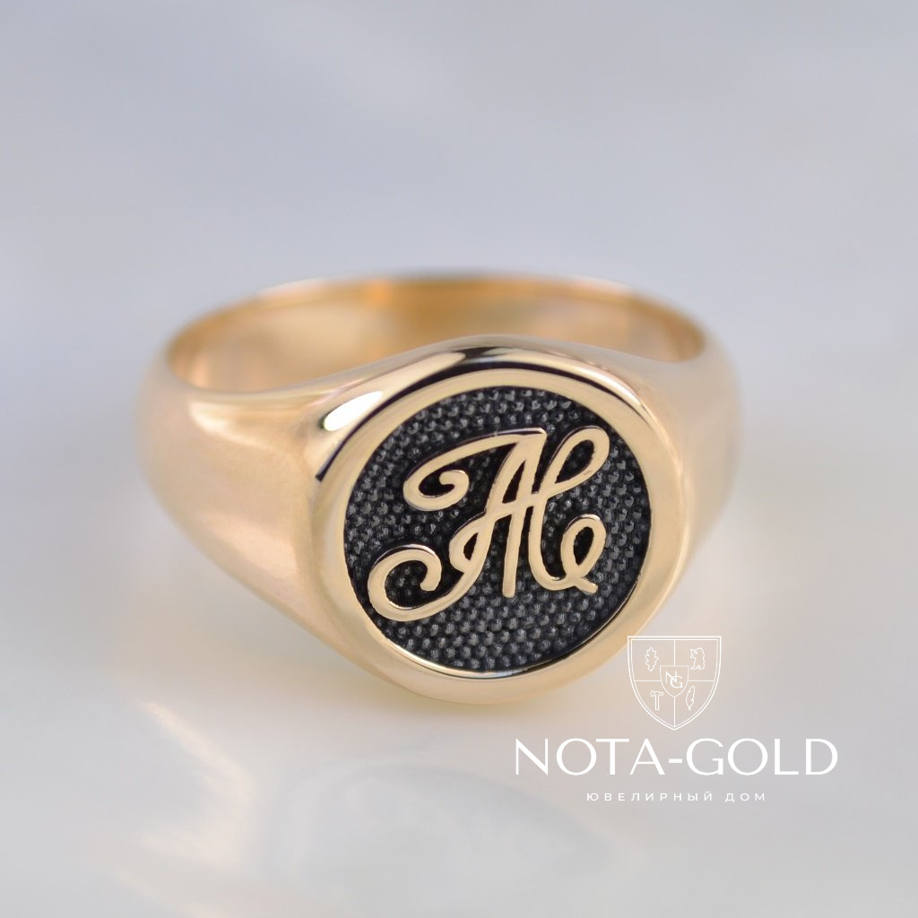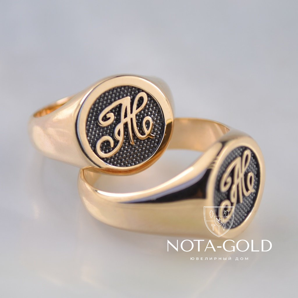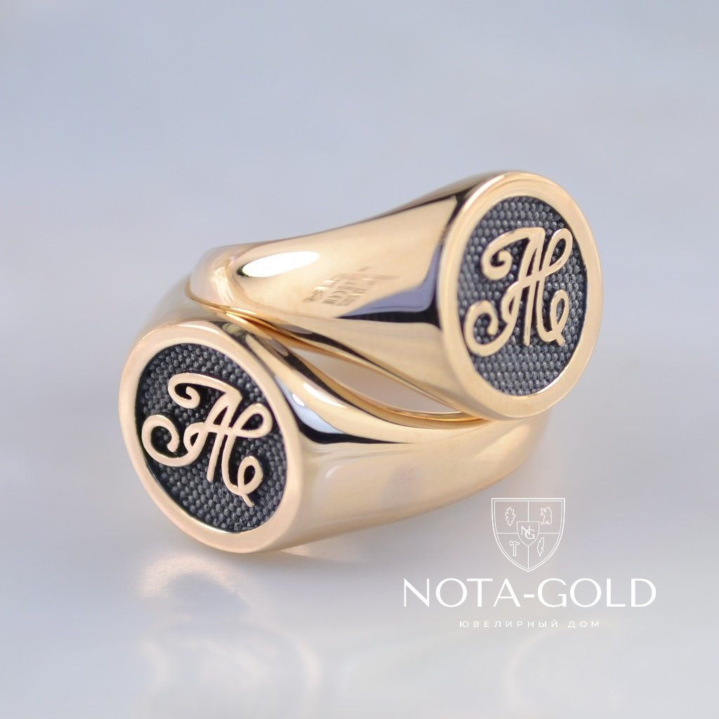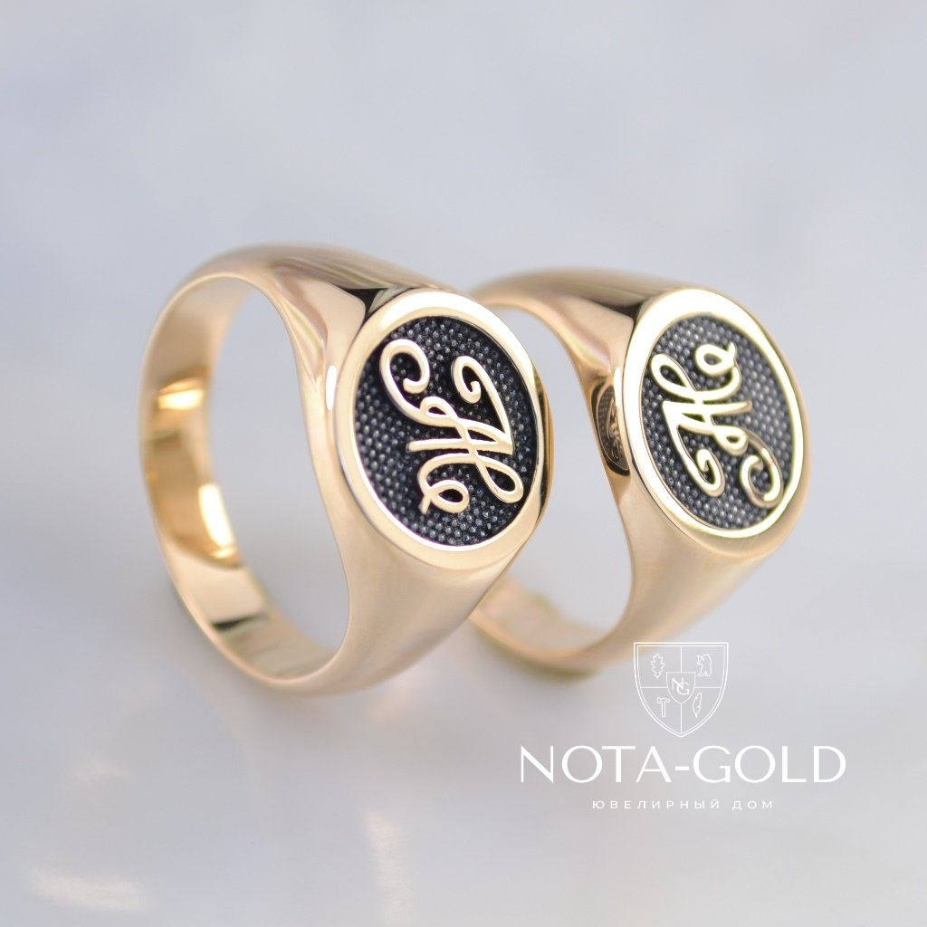 Золотые парные кольца-печатки из красного золота с инициалами и чернением (Вес: 13,5 гр.)