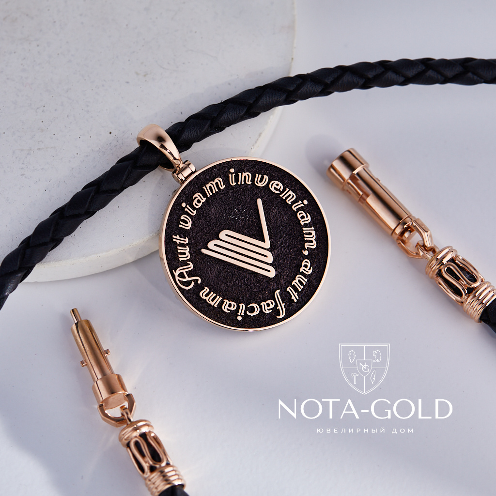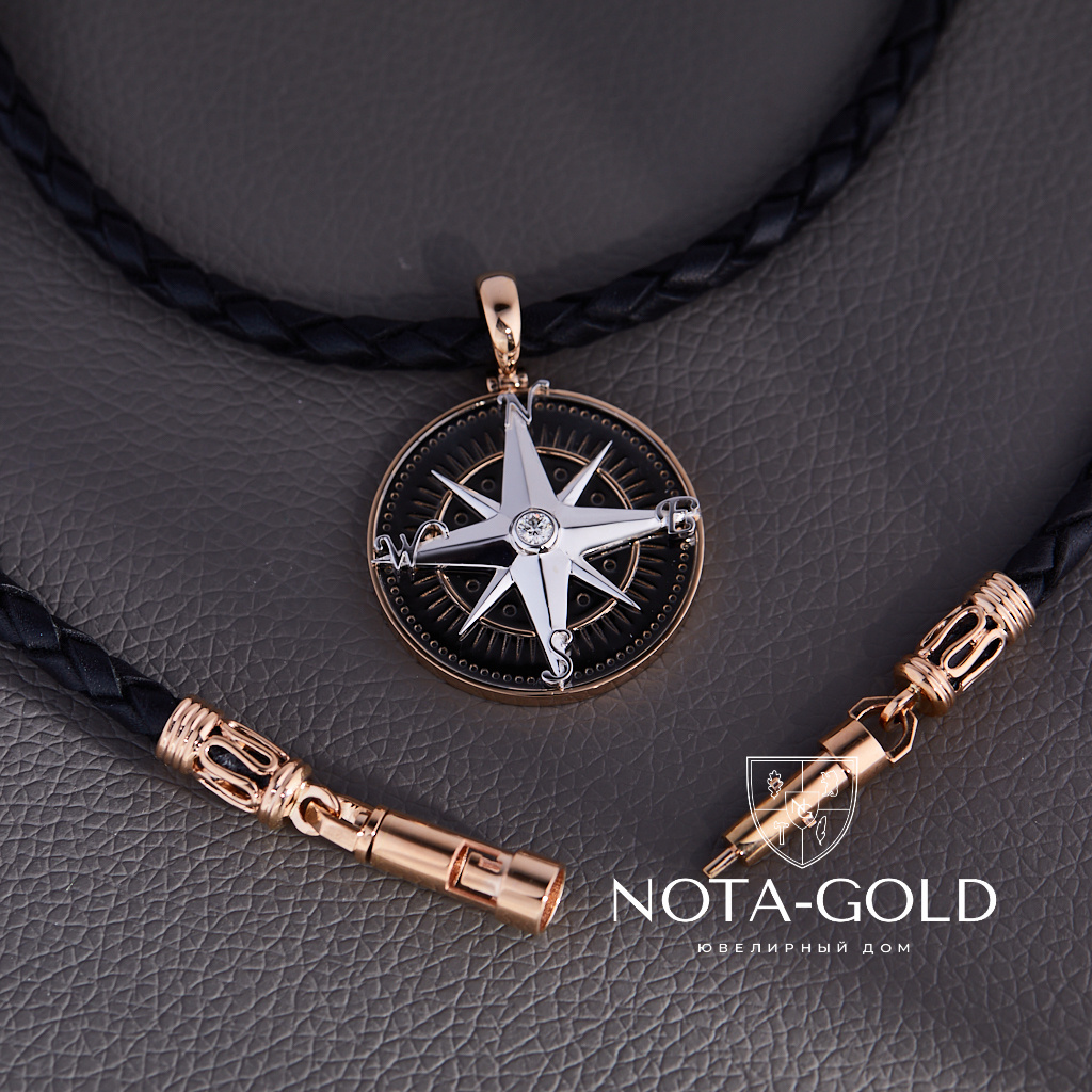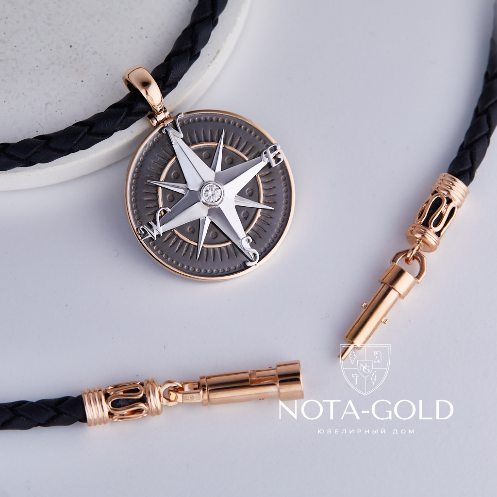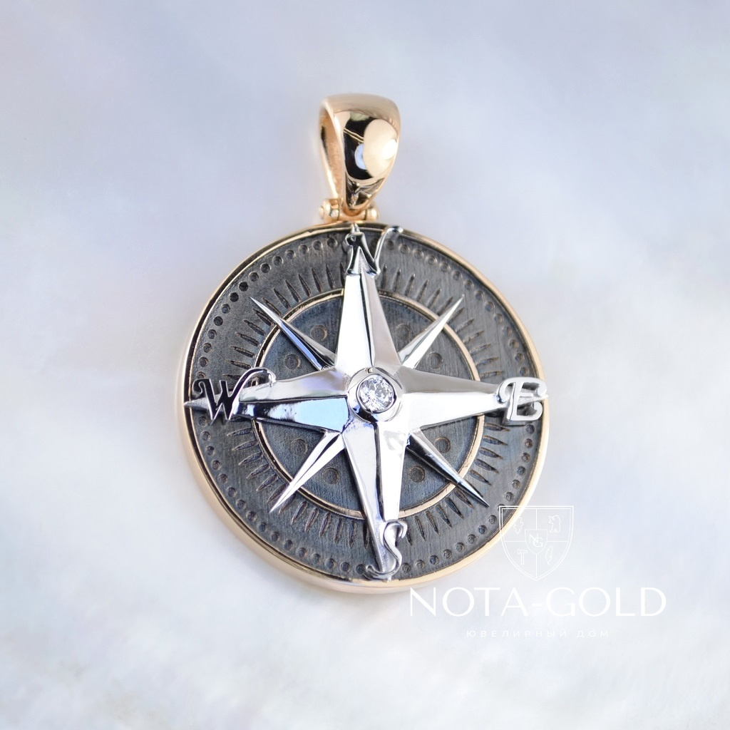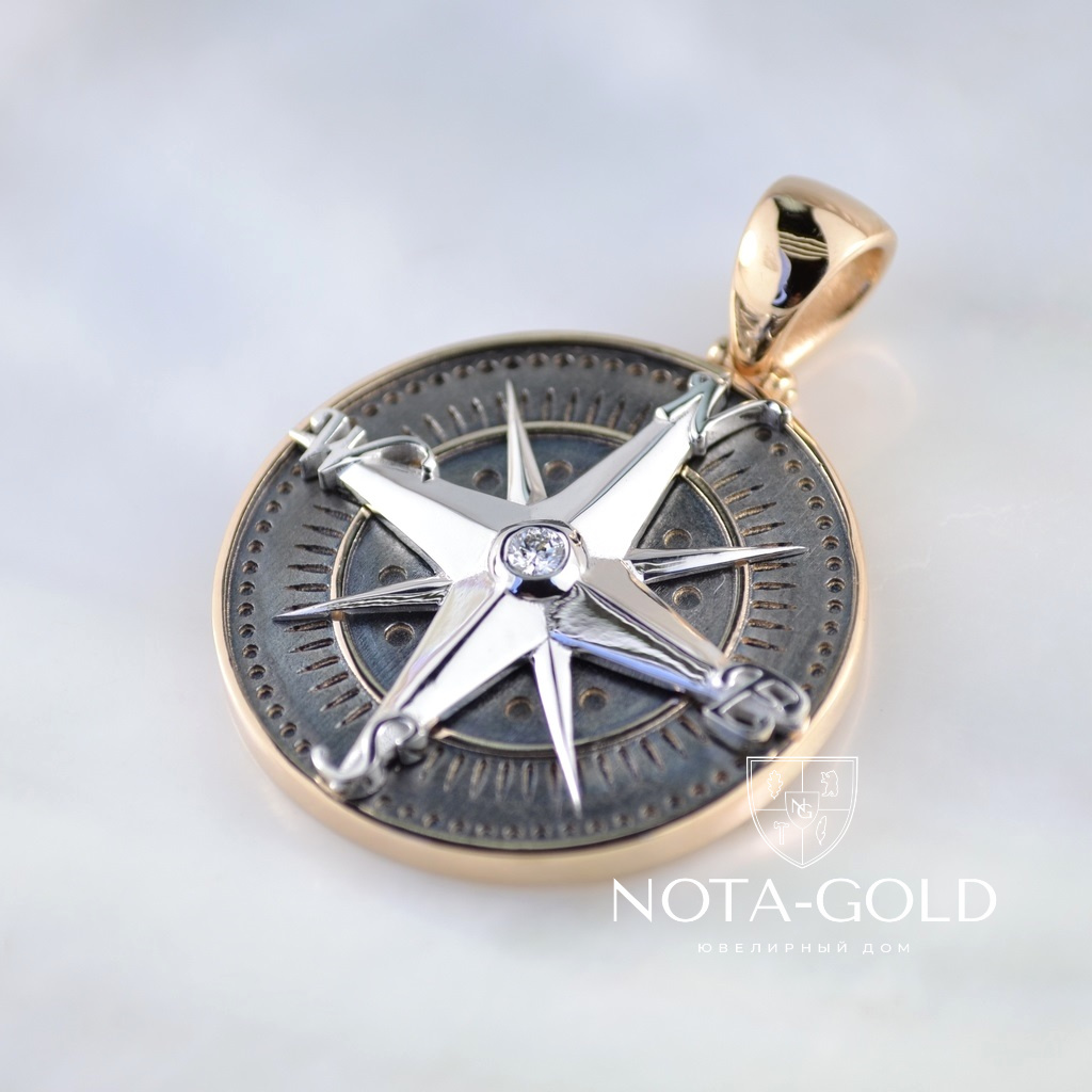 Золотая подвеска Роза ветров с бриллиантом и чернением (Вес: 19 гр.)