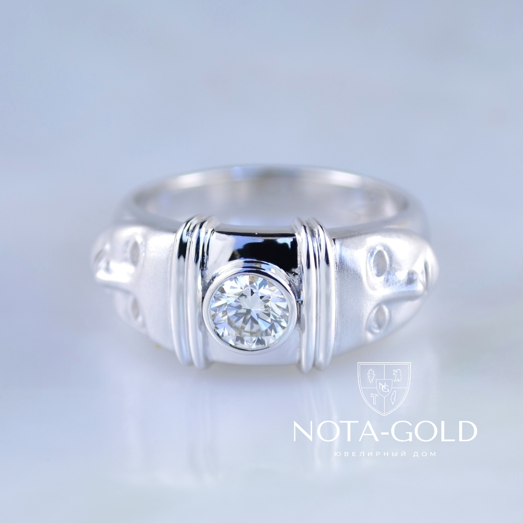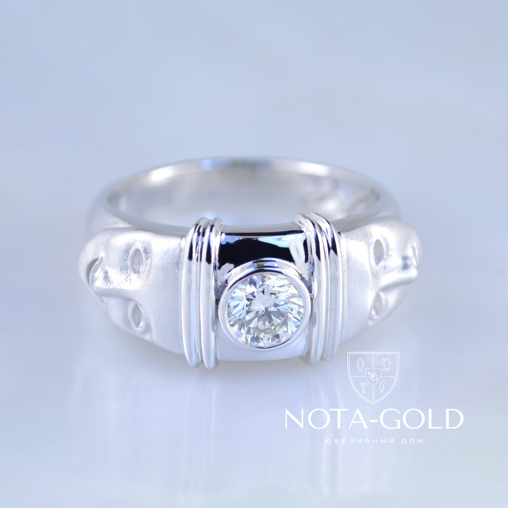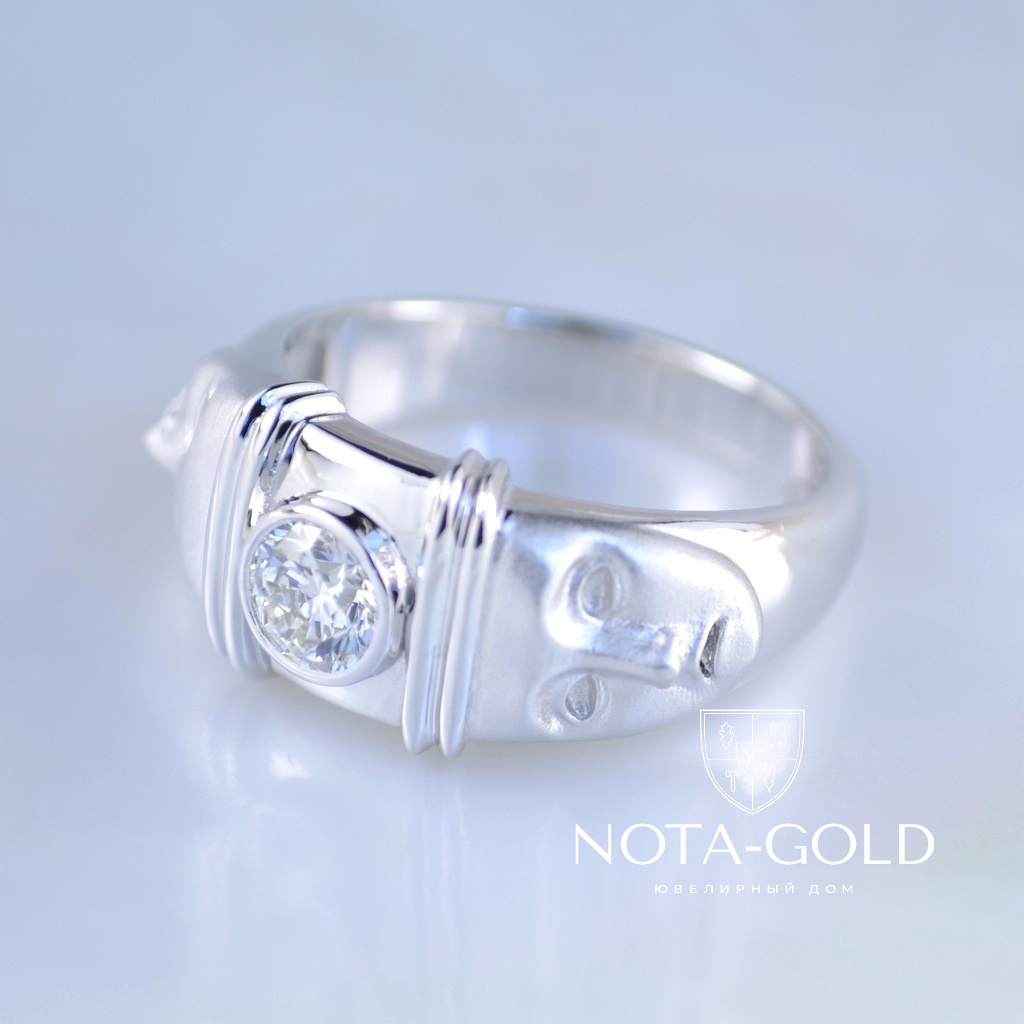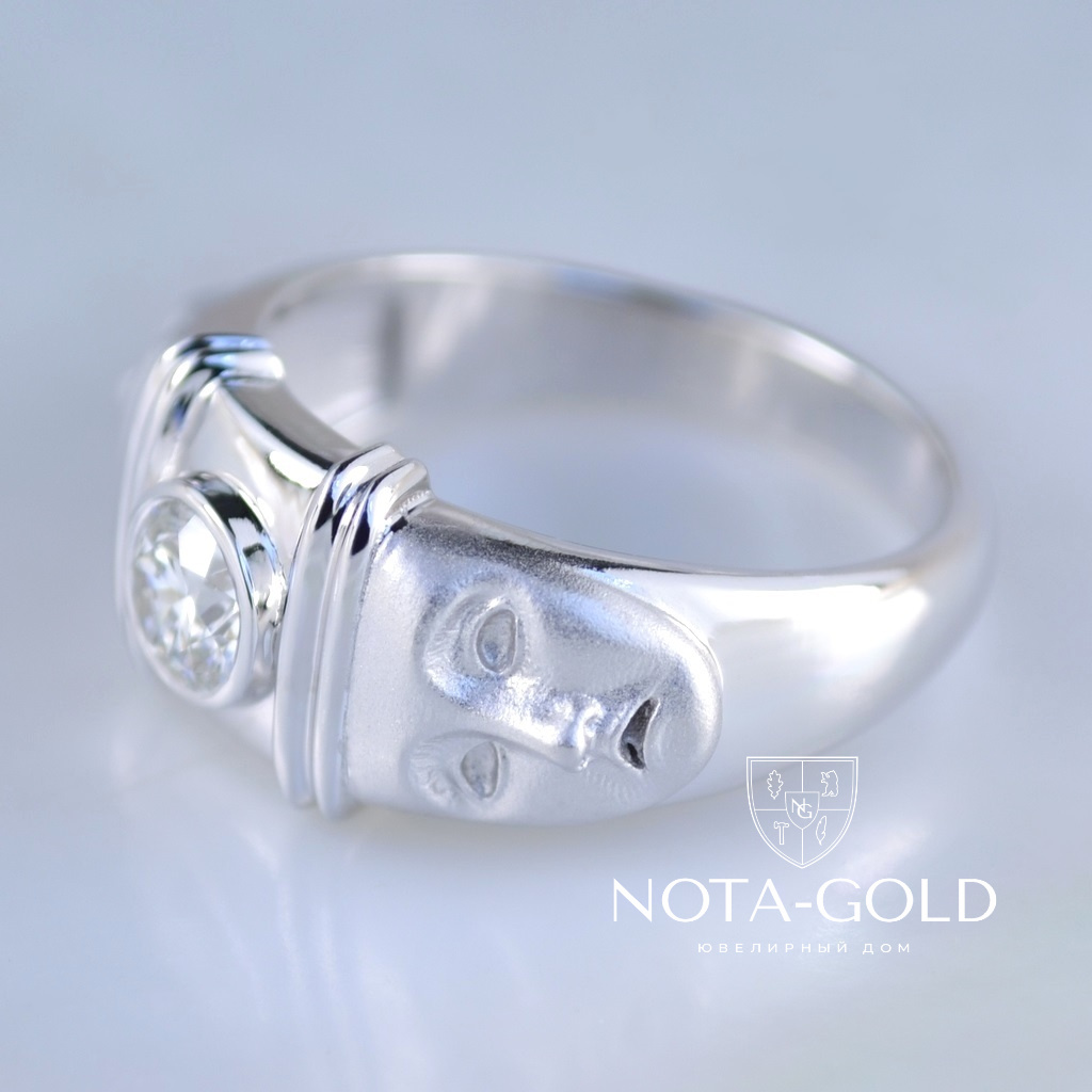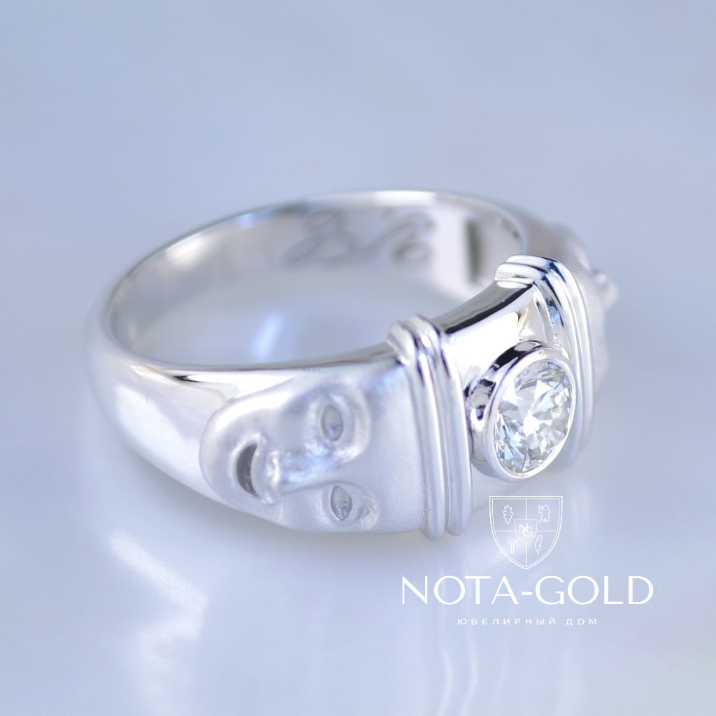 Золотое мужское кольцо из белого золота с двумя масками, бриллиантом и гравировкой (Вес: 5,5 гр.)