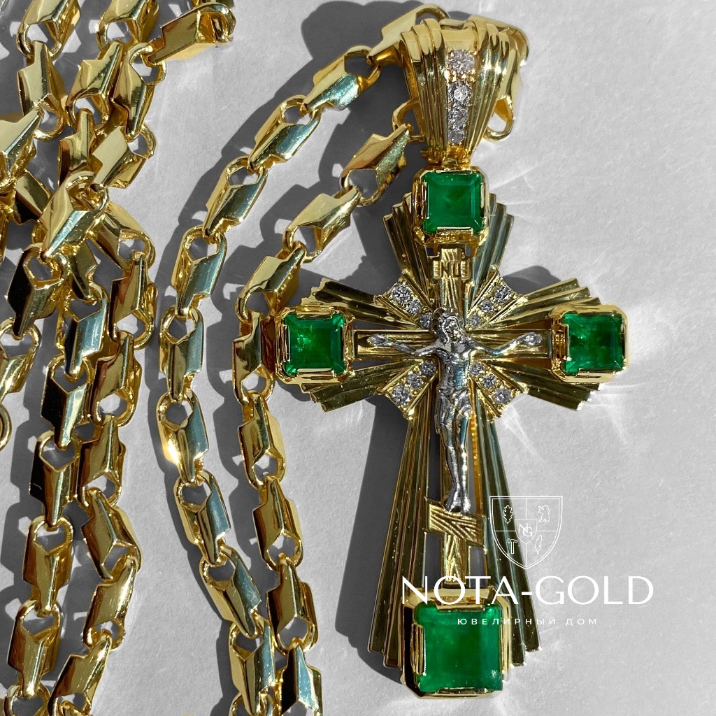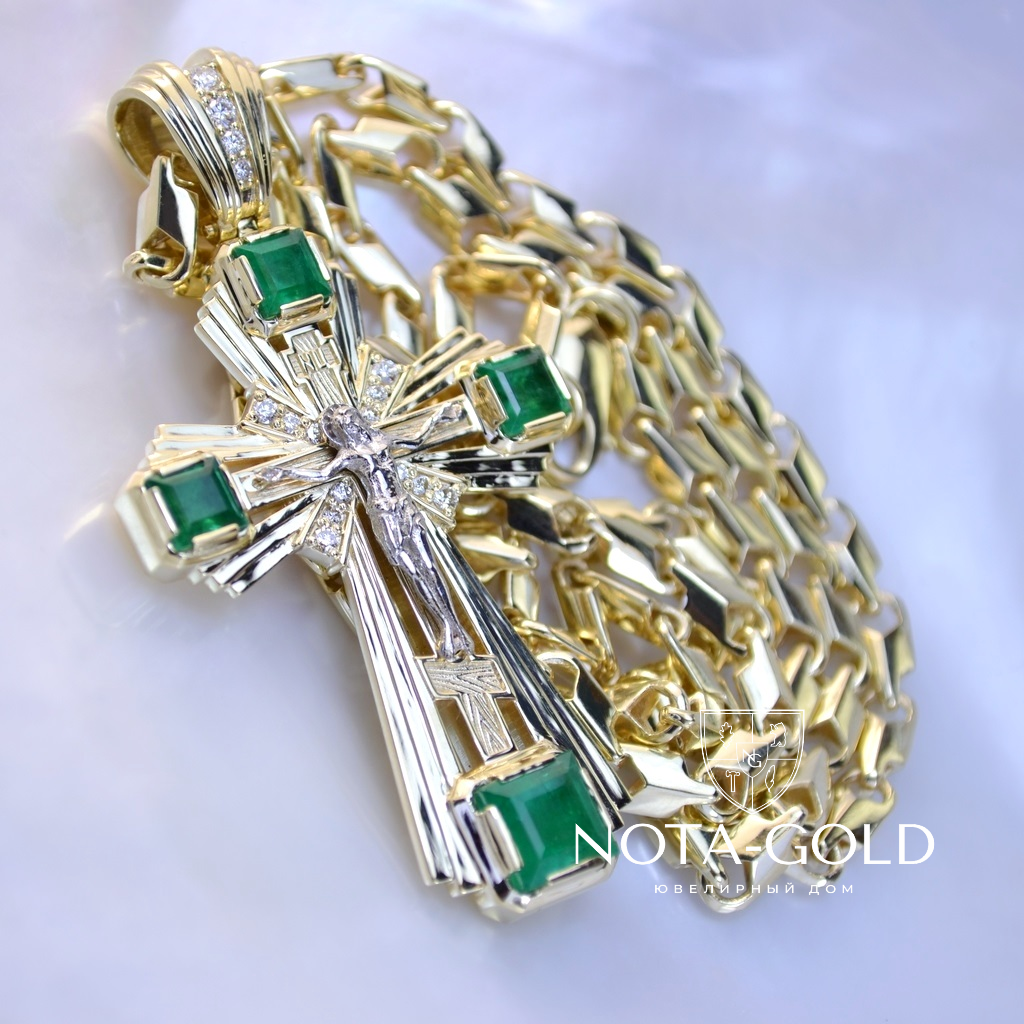 Нательный золотой крест с ликами святых, бриллиантами и изумрудами на золотой цепочке плетение Рыбка (Вес: 43 гр.)