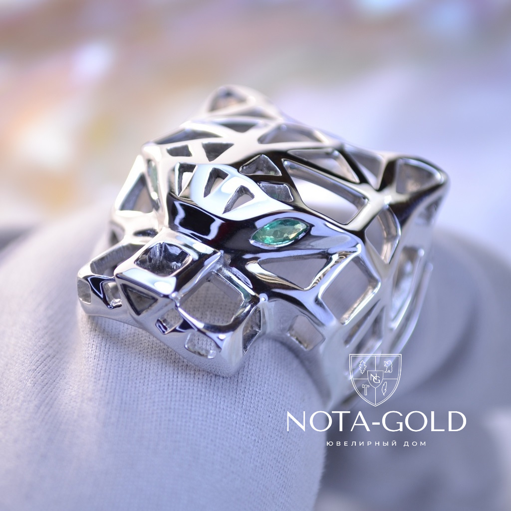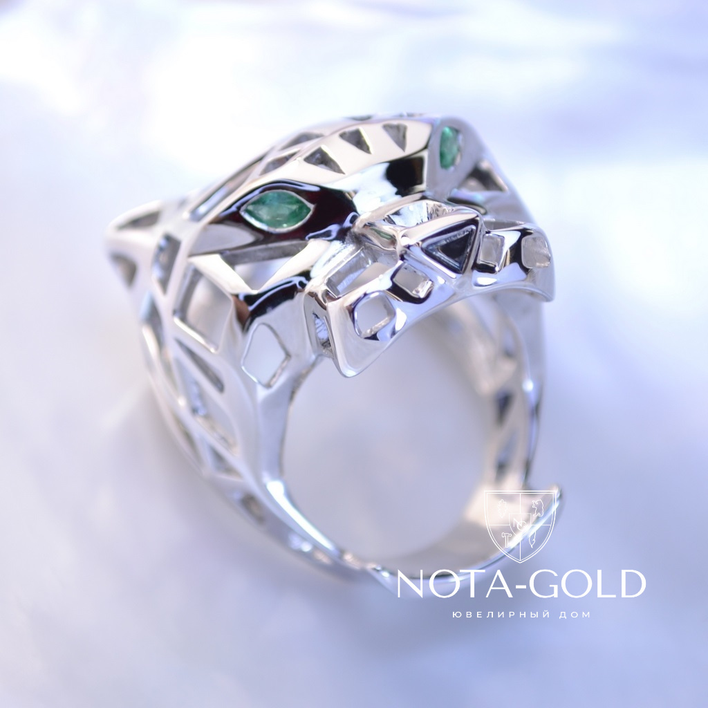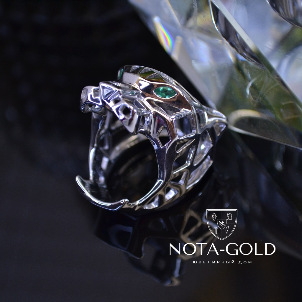 Эксклюзивное мужское золотое кольцо Пума из белого золота с изумрудами (Вес: 23 гр.)