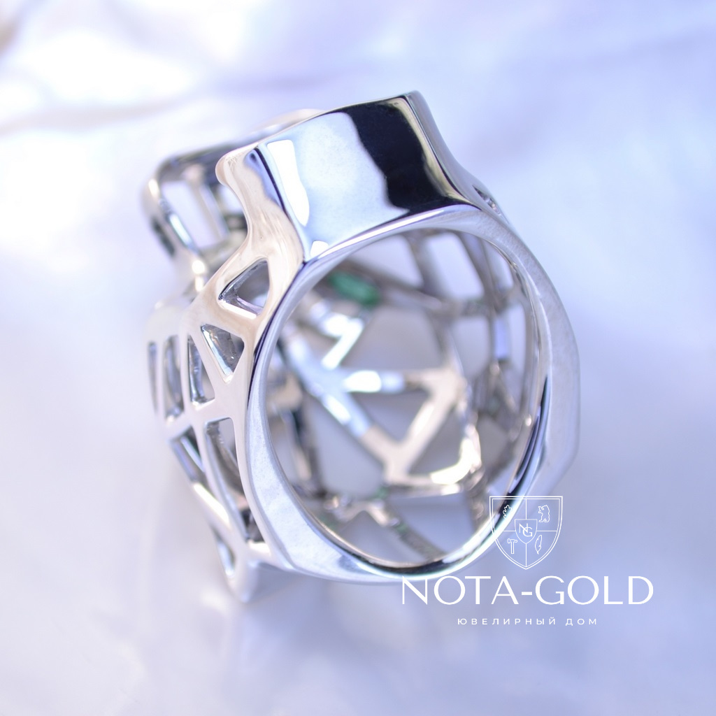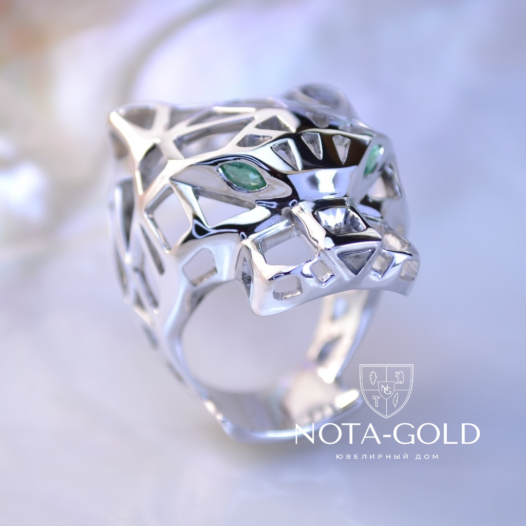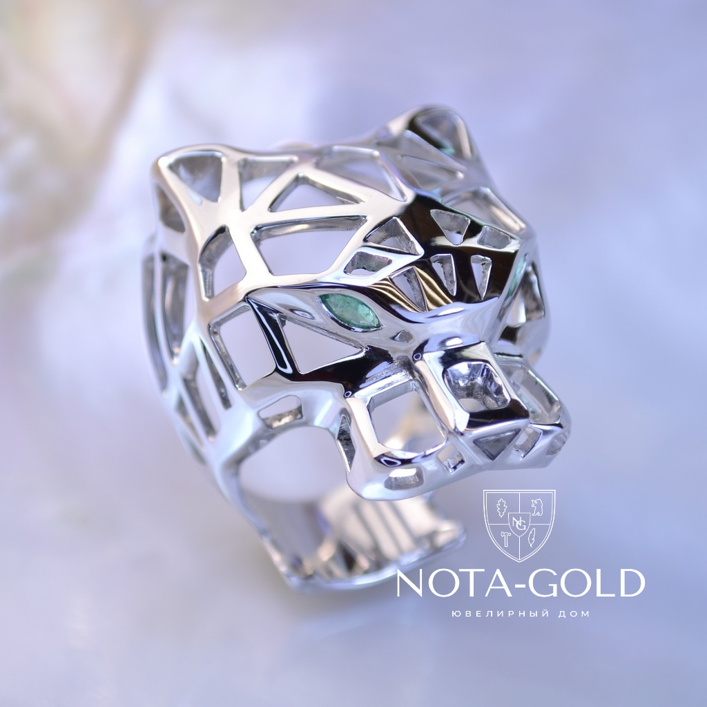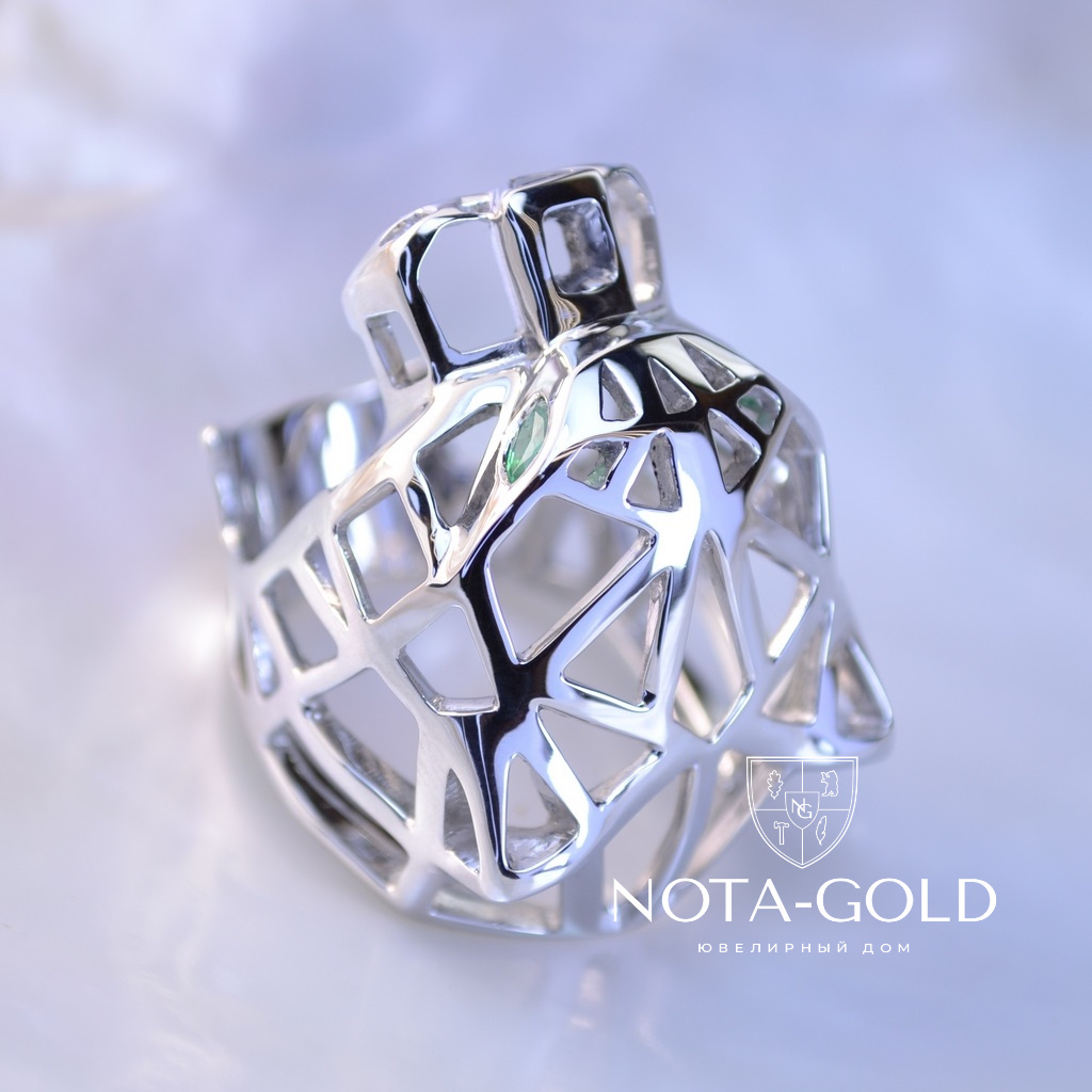 Эксклюзивное мужское золотое кольцо Пума из белого золота с изумрудами (Вес: 23 гр.)