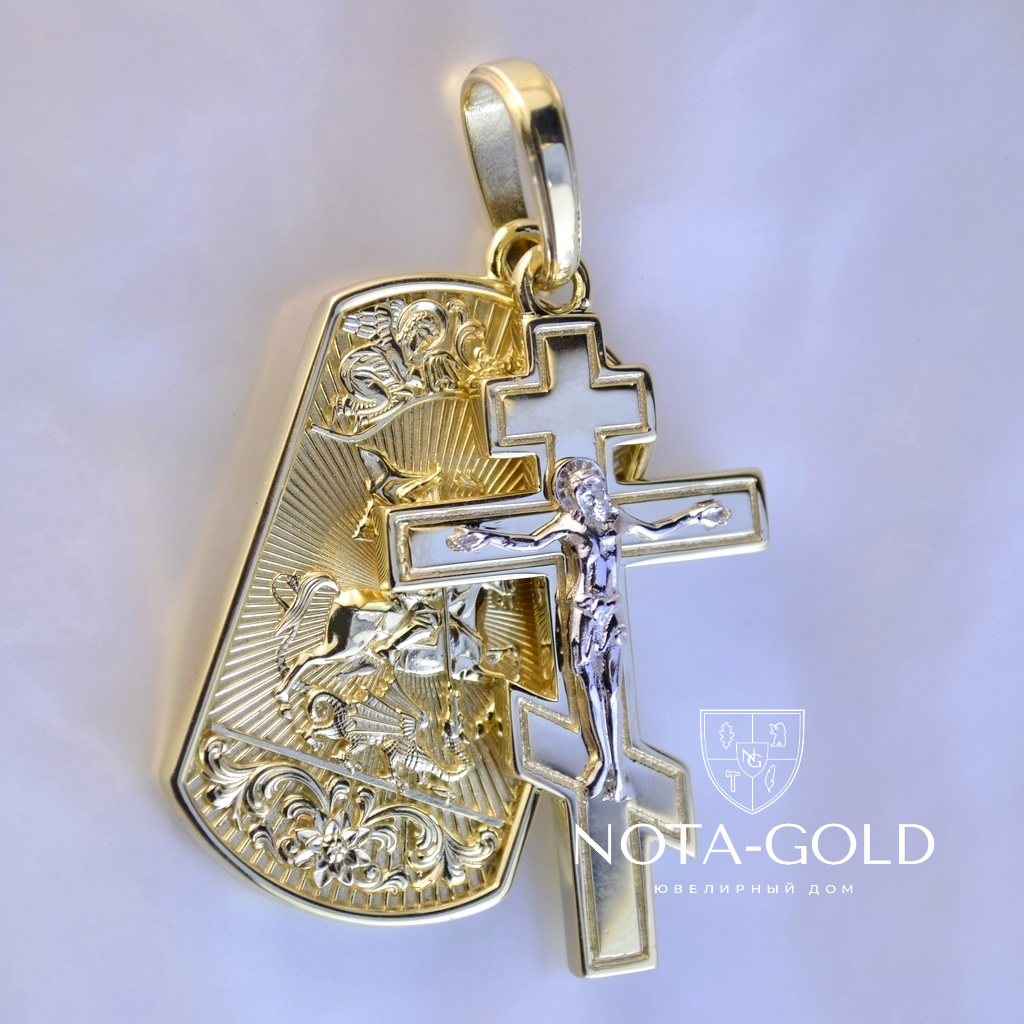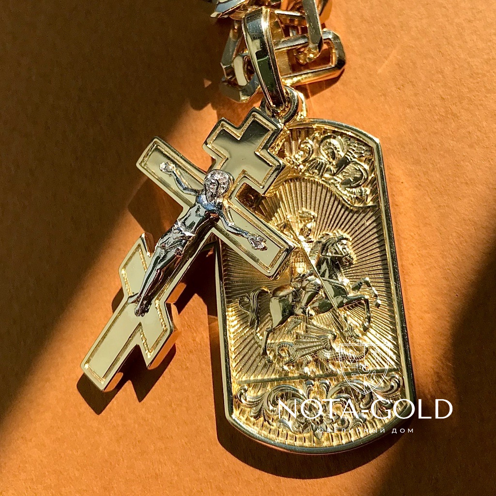 Православный золотой крест с распятием и жетон-иконка с Георгием Победоносцем и молитвой Отче наш (Вес 26 гр.)