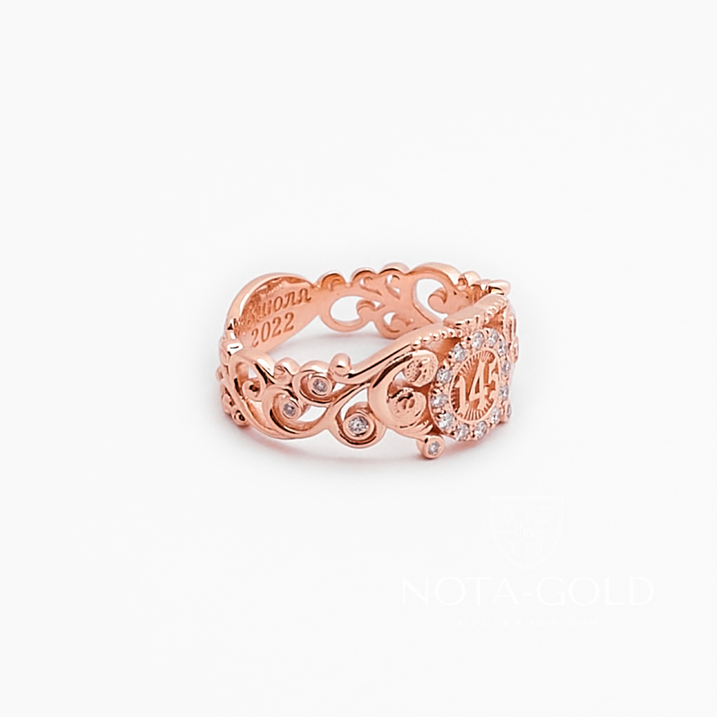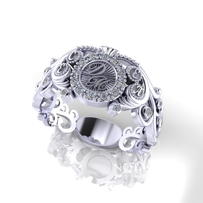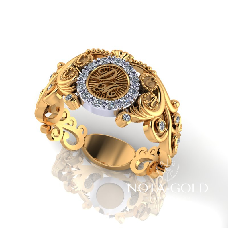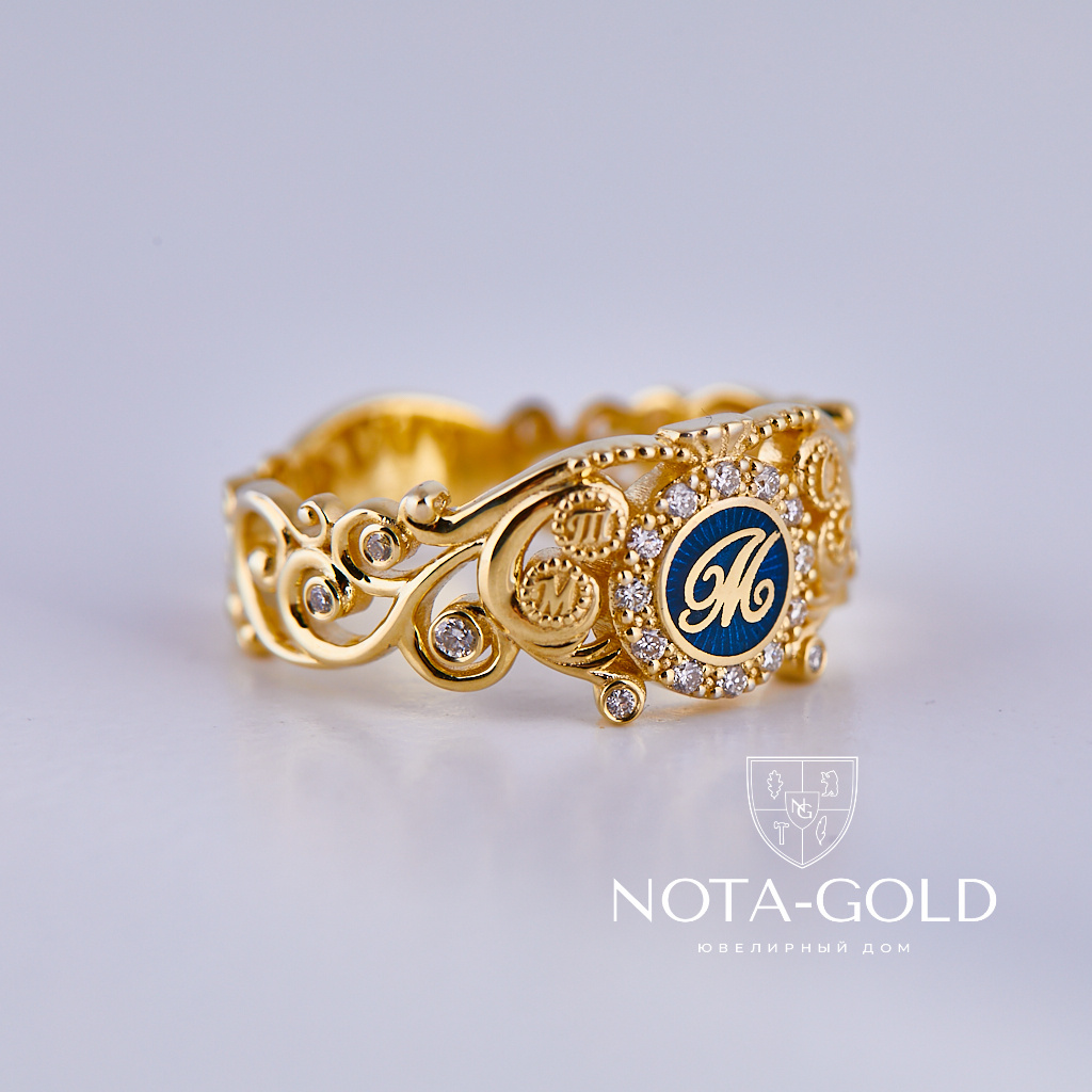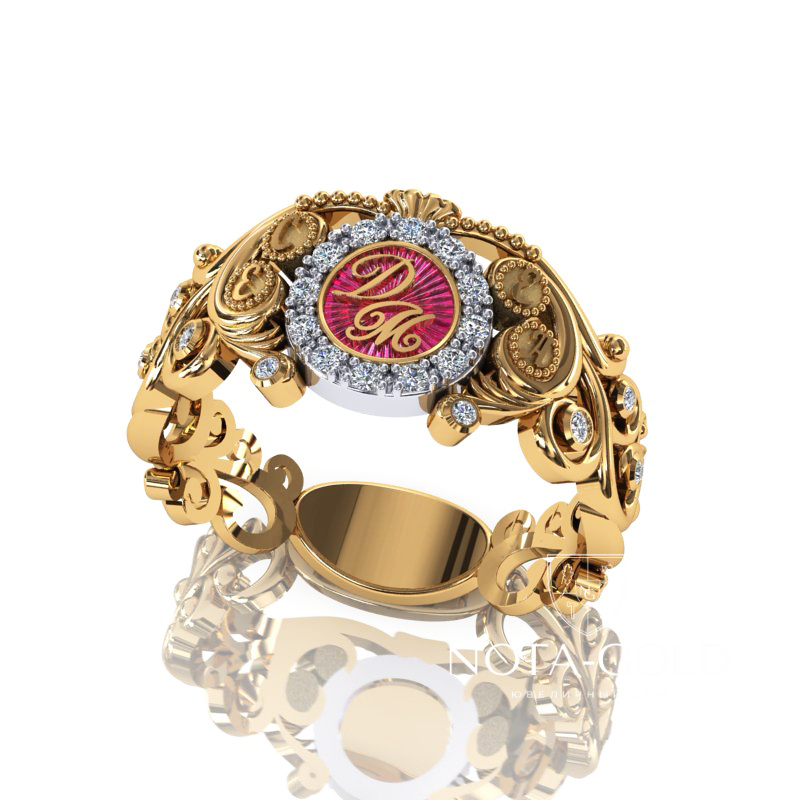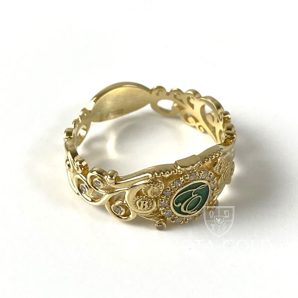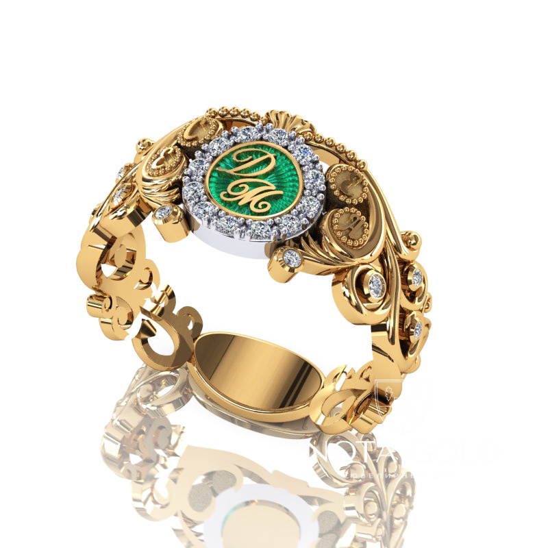 Именное золотое кольцо с бриллиантами, цветной эмалью, инициалами и площадкой под гравировку (Вес: 5 гр.)
