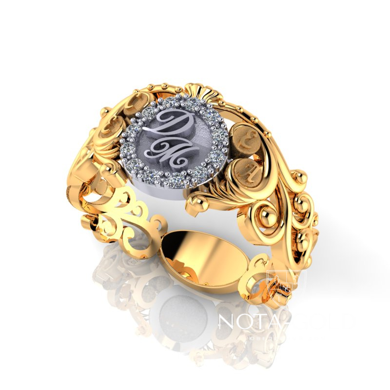 Ажурное именное золотое кольцо с бриллиантами, инициалами и площадкой под гравировку (Вес: 5 гр.)