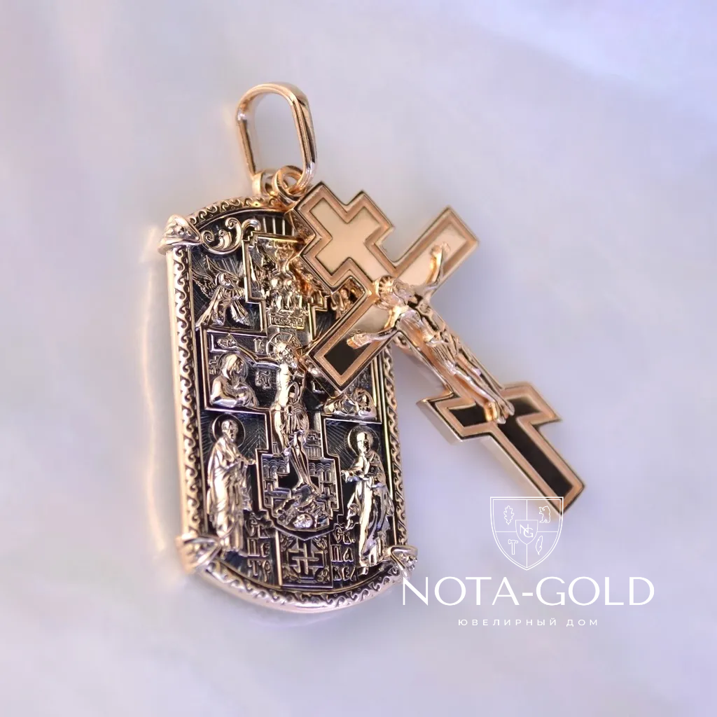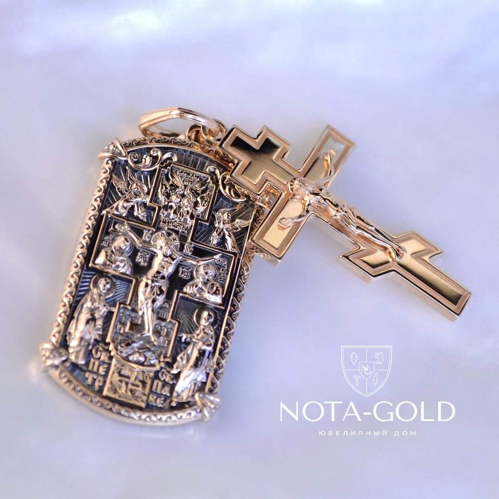 Золотой крест с распятием и жетон-иконка с ликами святых и гравировкой молитвы (Вес: 33,5 гр.)