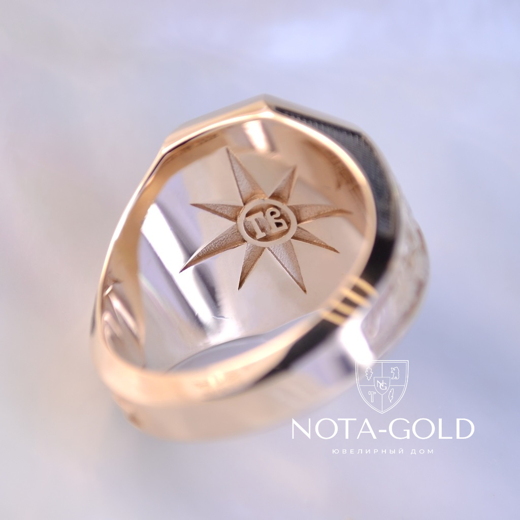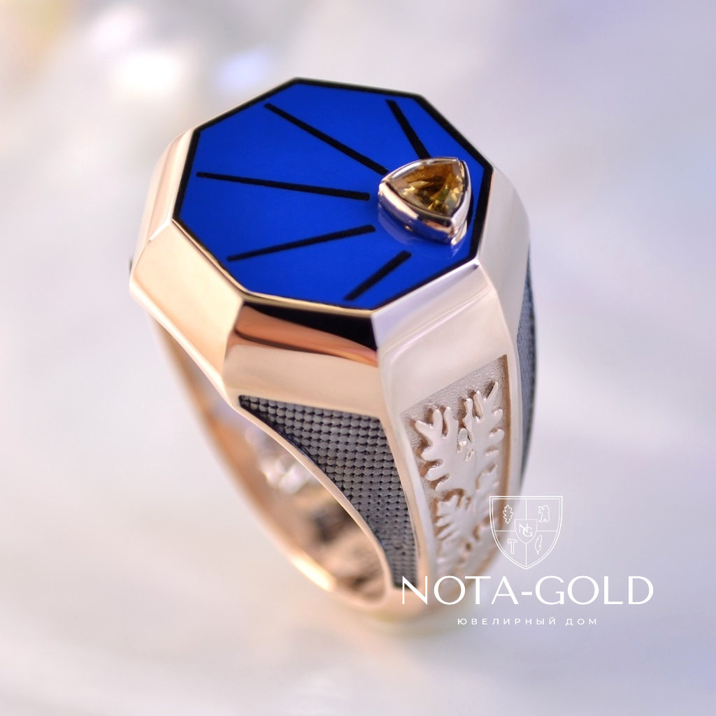 Мужское золотое кольцо с эмалью, цитрином, узором и гравировкой Иду на вы (Вес: 38 гр.)