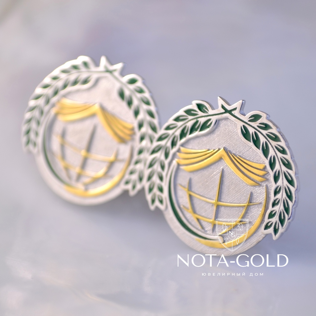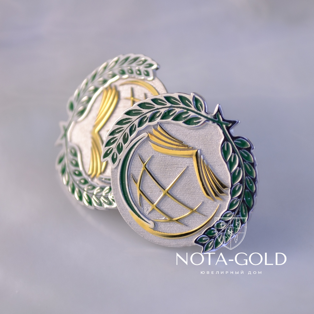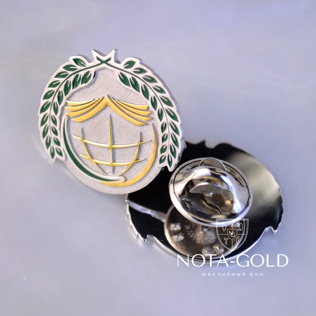 Золотой нагрудный значок из белого золота с логотипом компании и эмалью (Вес: 4 гр.)