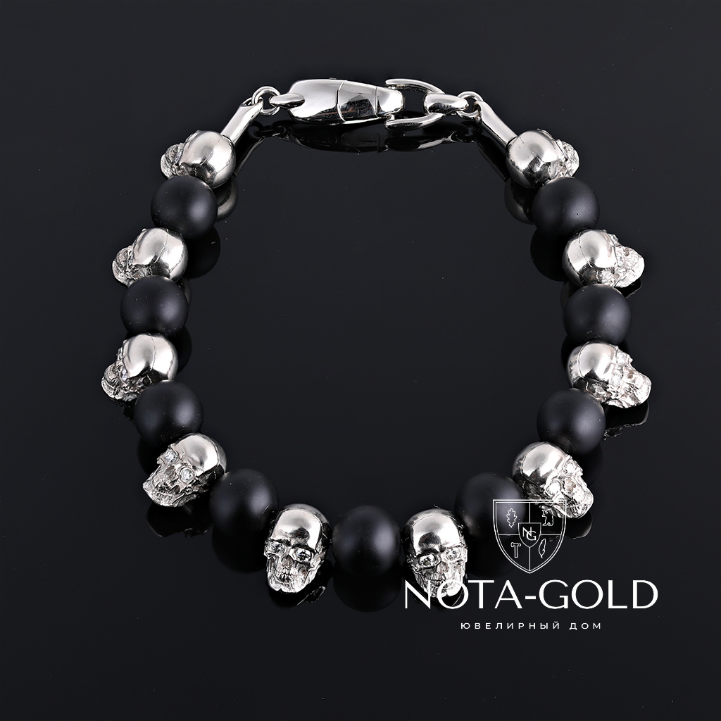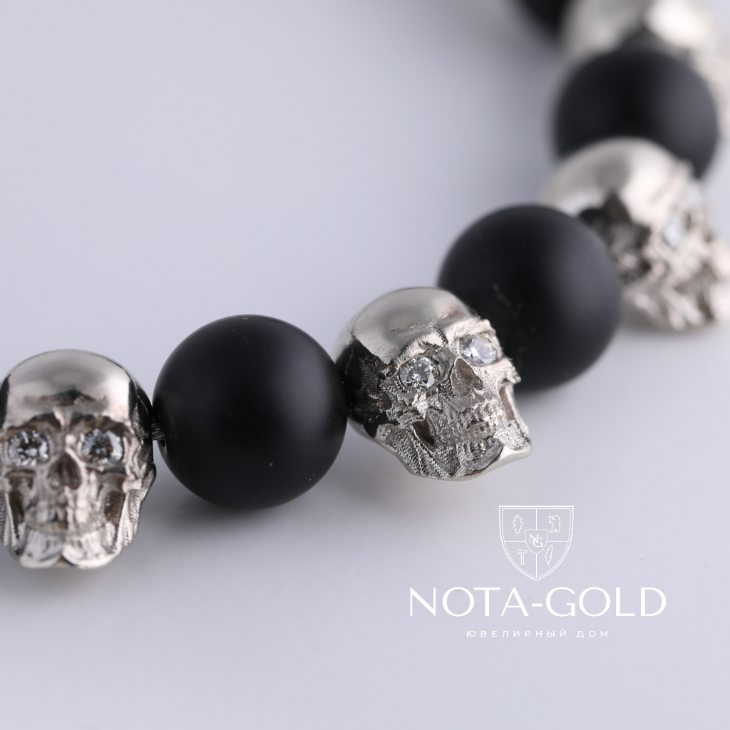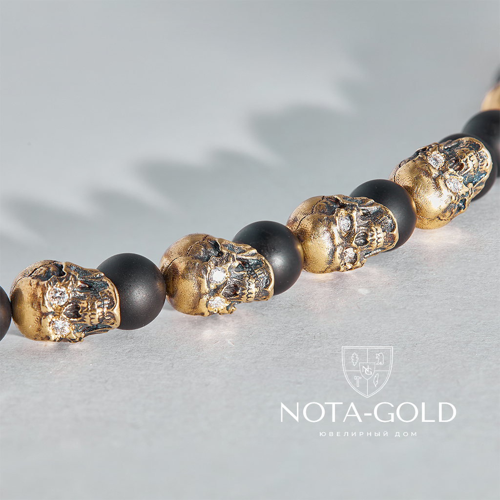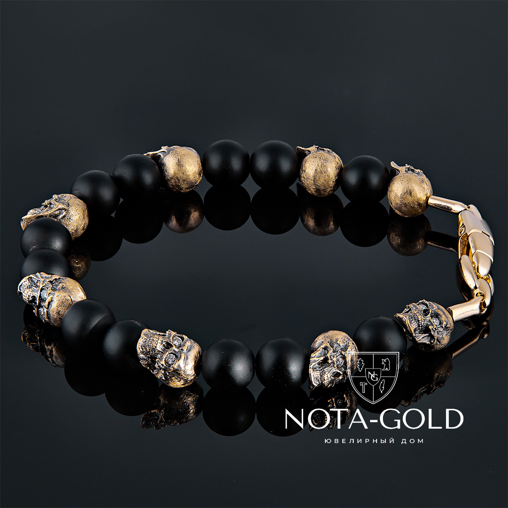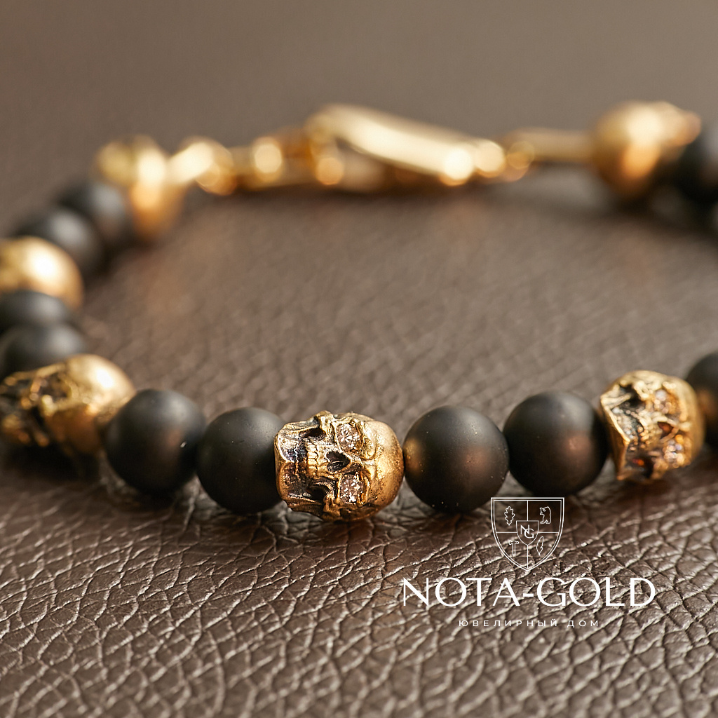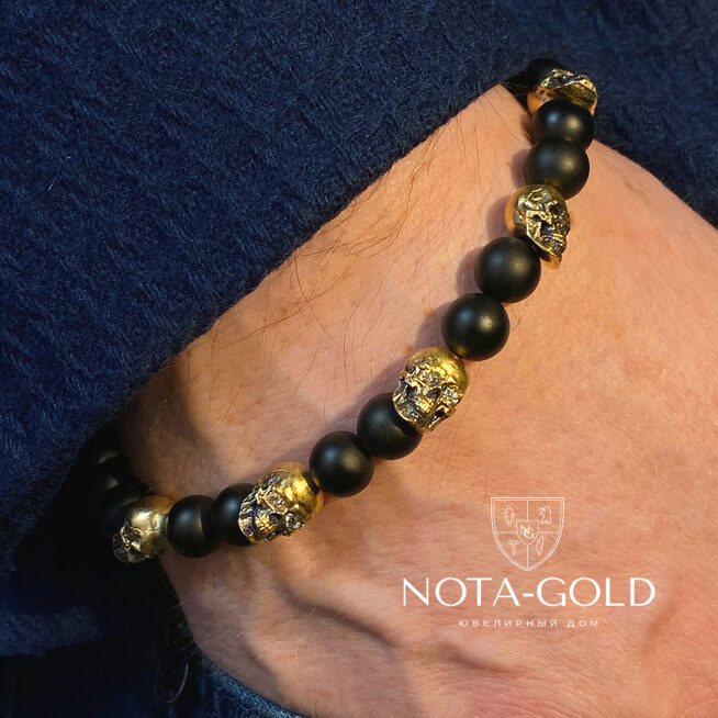 Золотой браслет с черепами и бусинами из чёрного оникса (Вес 58 гр.)