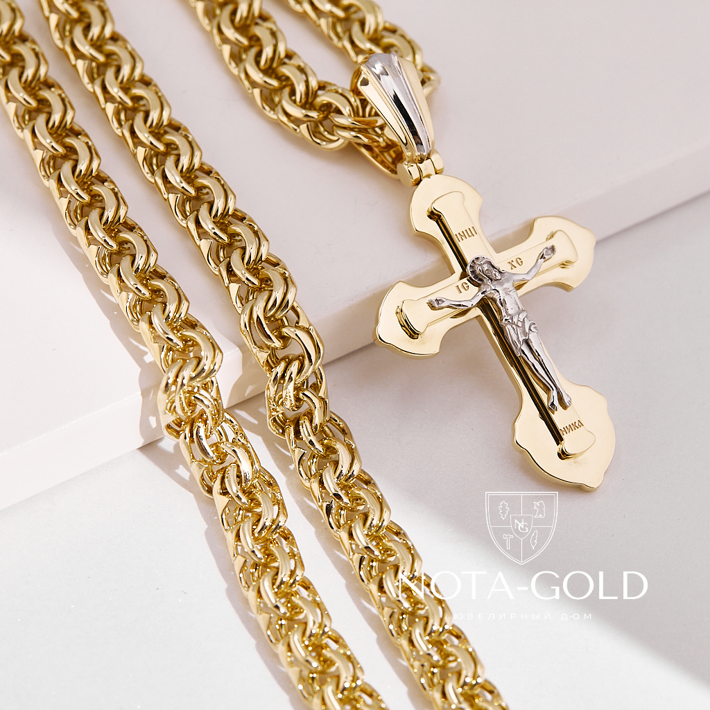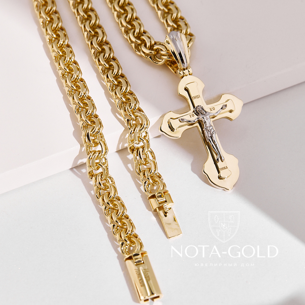Золотая цепочка плетения Бисмарк с православным крестиком из жёлтого золота (Вес: 144 гр.)