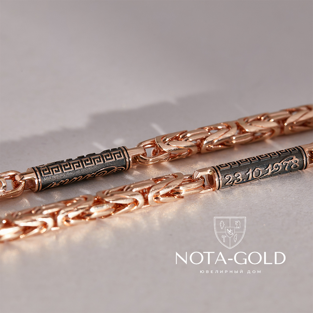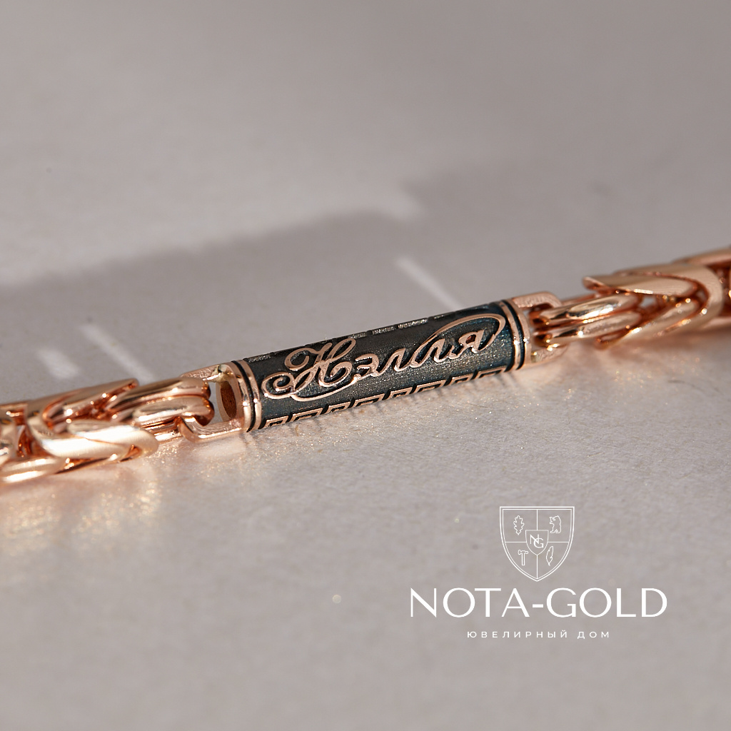 Цепочка плетения Лисий хвост с именами изготавливается на заказ по Вашим индивидуальным параметрам (вес, длина, ширина). Заказать можно из красного, жёлтого или белого золота 585, либо 750 пробы, может быть изготовлена из материала Мастерской или из золота Заказчика. Цепочку из белого золота можно дополнительно покрыть родием для придания холодного, стального оттенка. Так же, дополнительно, можно почернить золотую цепь Лисий хвост с именами, что особо подчеркнёт рельеф плетения. Исходя из Ваших предпочтений, мы изготавливаем любой замок из золота: карабин, шпрингель, пенал, коробочка. Все подробности по стоимости и возможности изготовления, Вы можете уточнить у наших менеджеров.