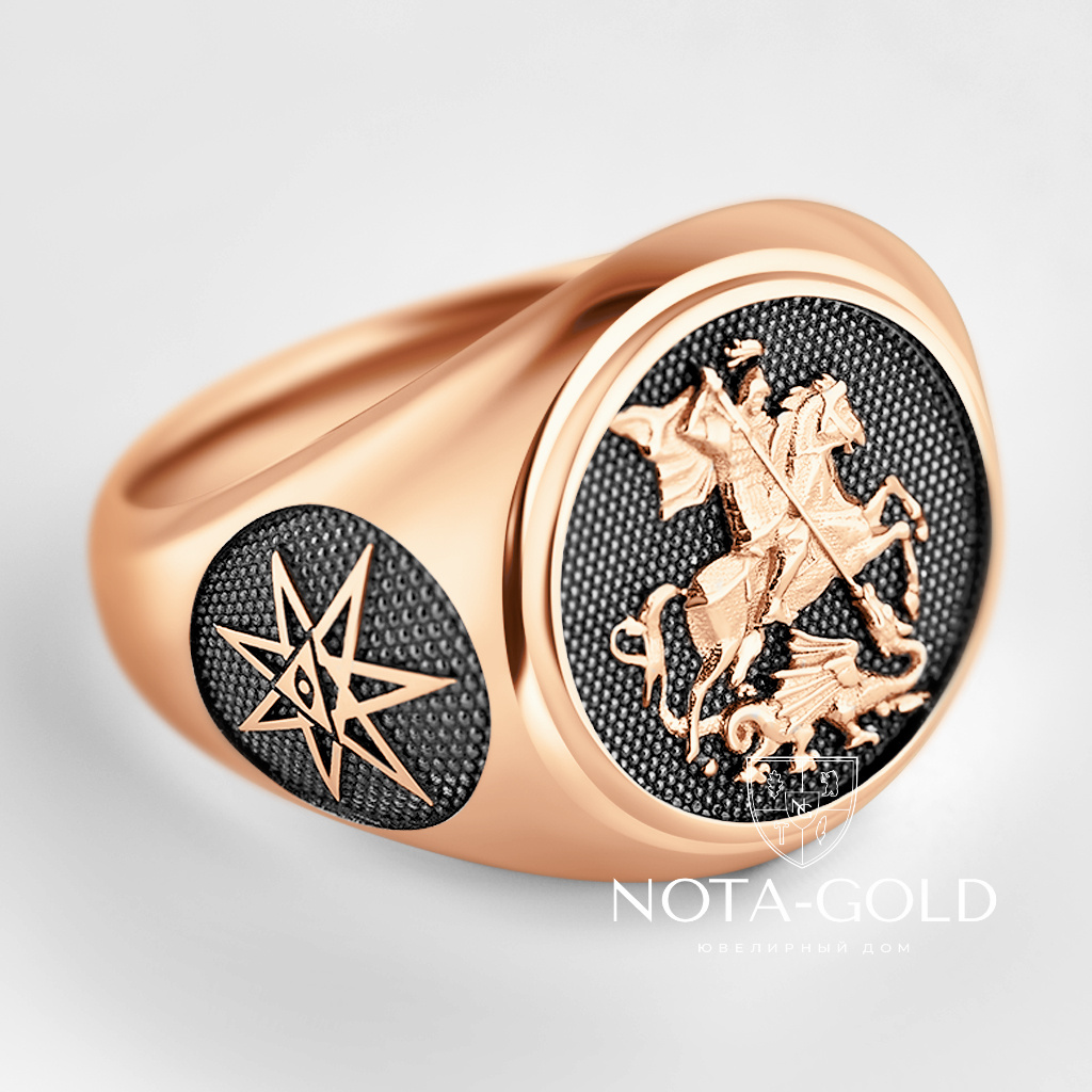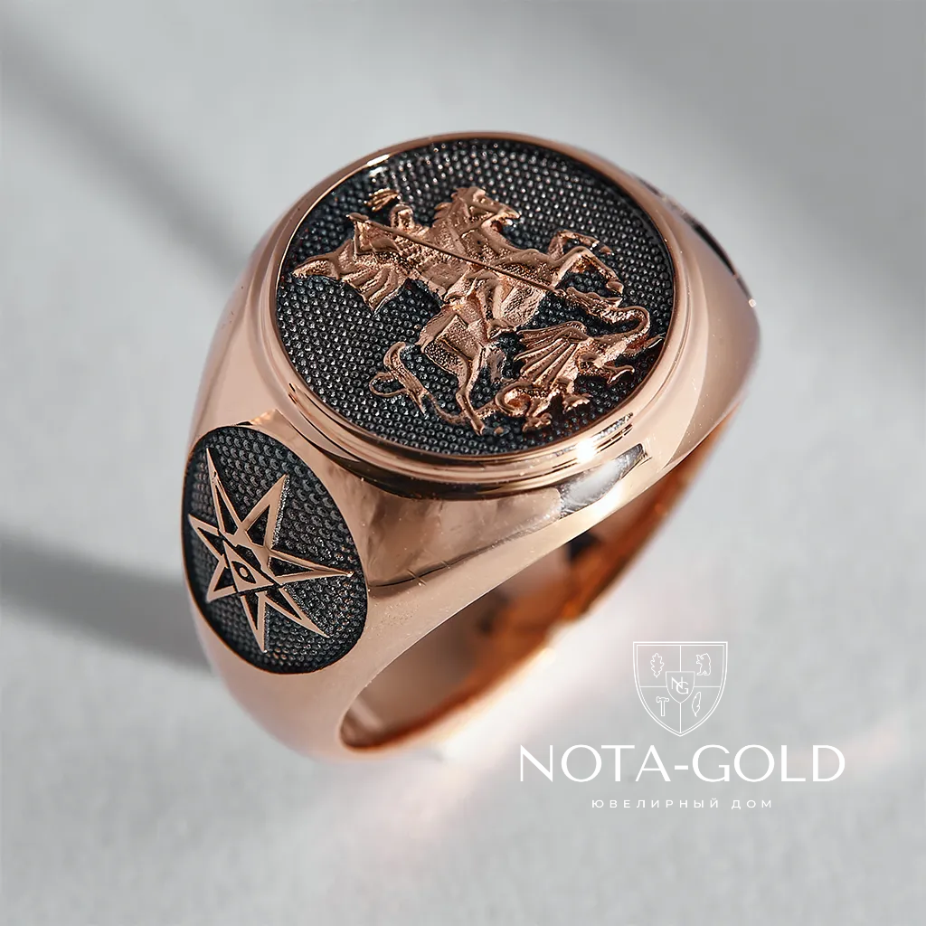 Кольцо-перстень Георгий Победоносец с семиконечной звездой из красного золота (Вес: 24 гр.)
