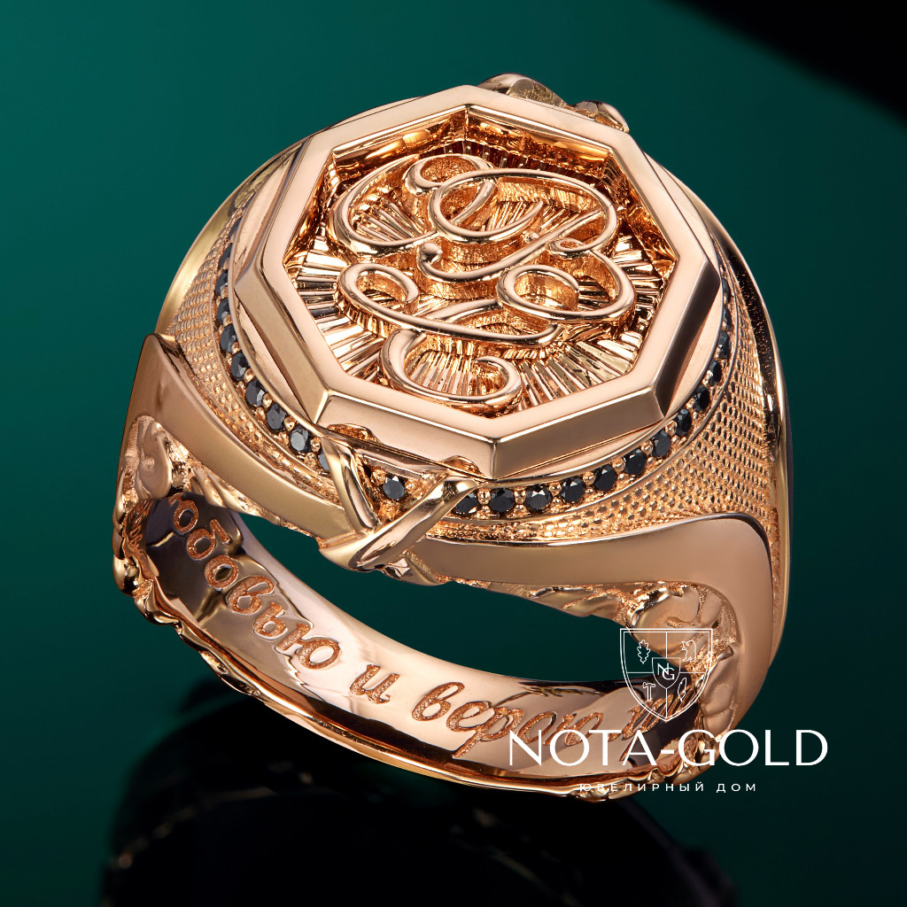 Мужская печатка с инициалами в октагоне и гравировкой из золота с чёрными бриллиантами (Вес: 23 гр.)