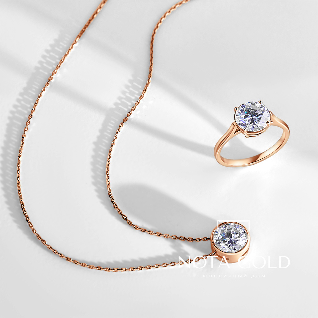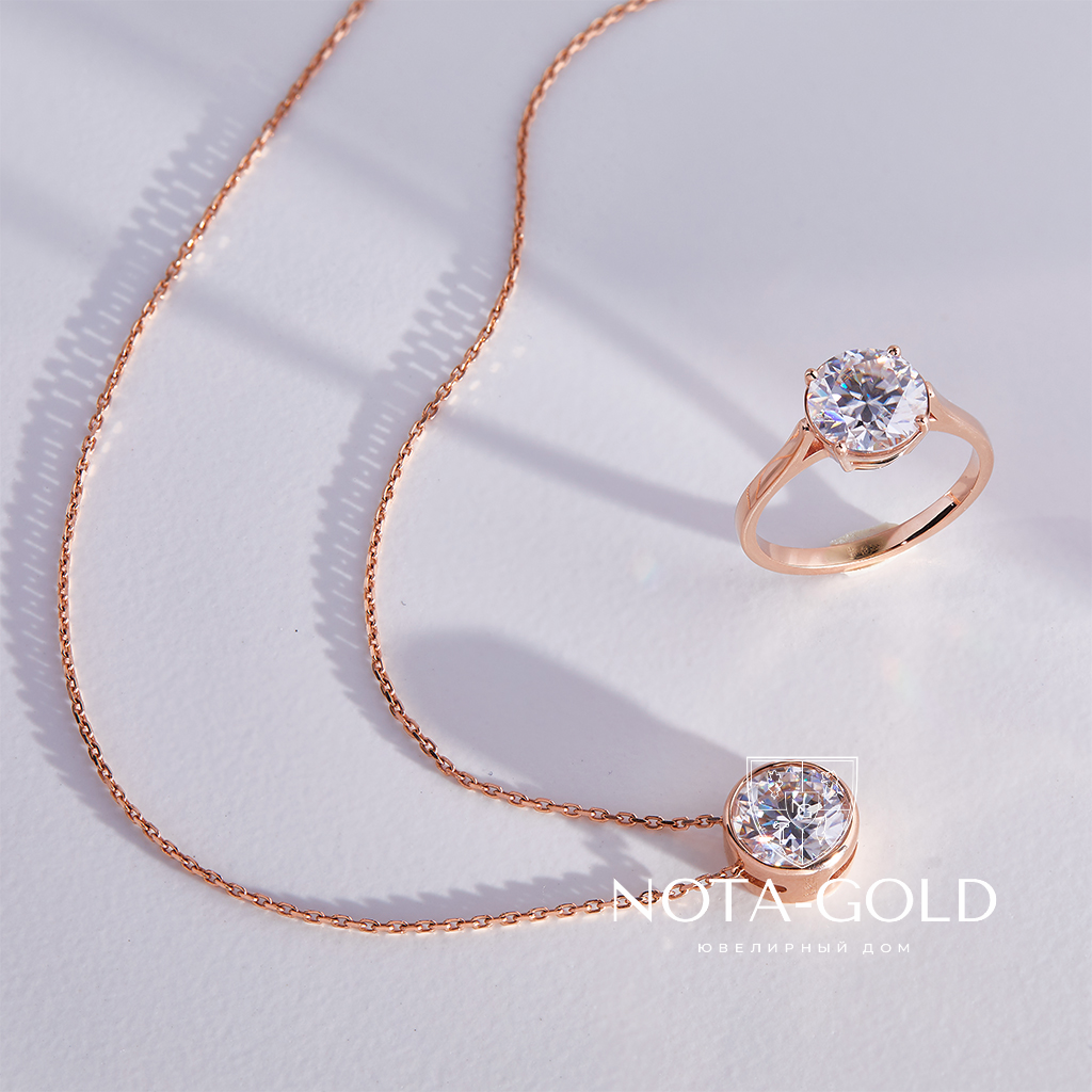 Женский комплект из золота с крупными муассанитами кольцо и подвеска на цепочке (Вес 9,6 гр.)