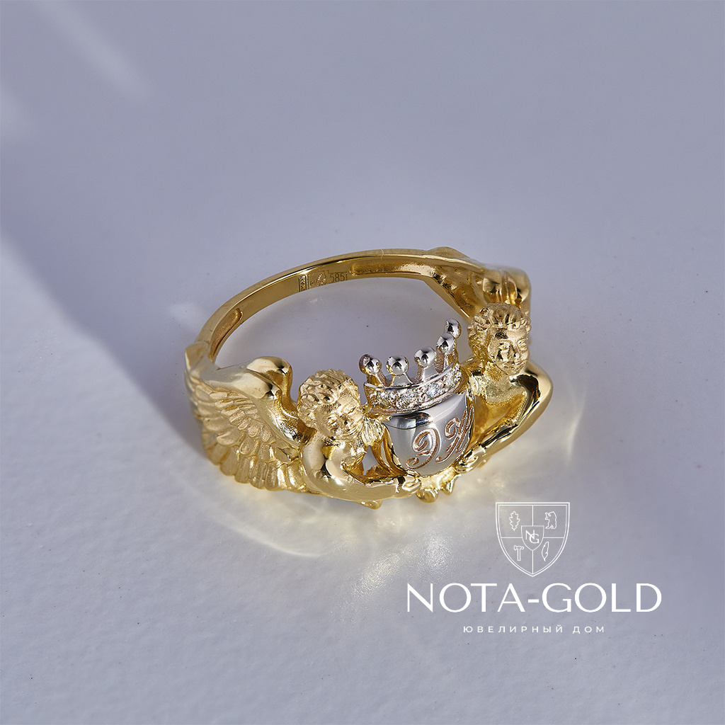 Кольцо из двух видов золота с бриллиантами, ангелами, короной и инициалами (Вес 5 гр.)