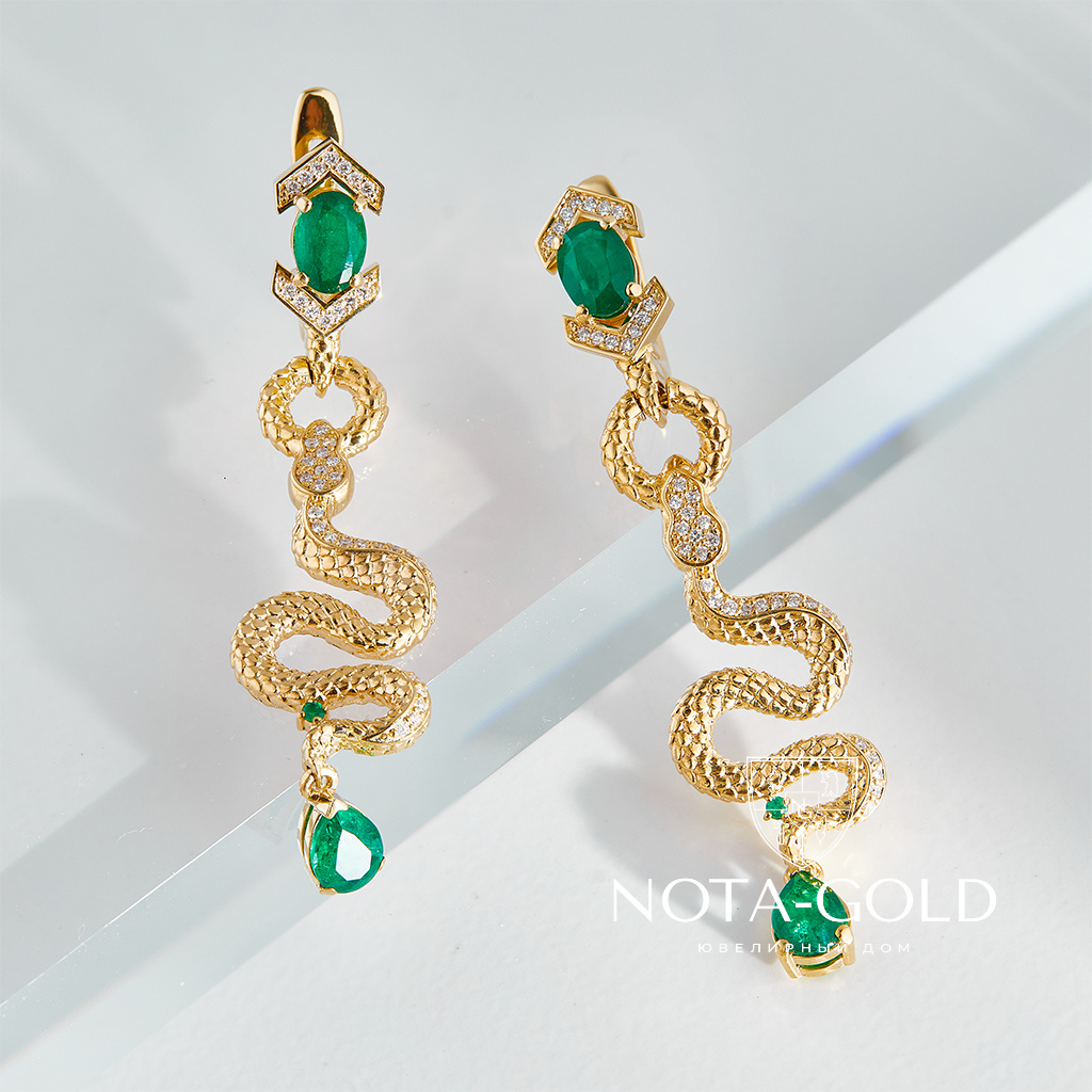 Женские серьги из желтого золота в виде змеи с бриллиантами и изумрудами (Вес 14 гр.)