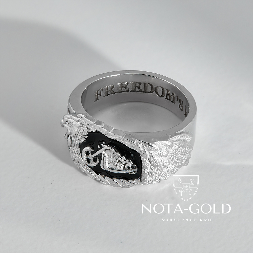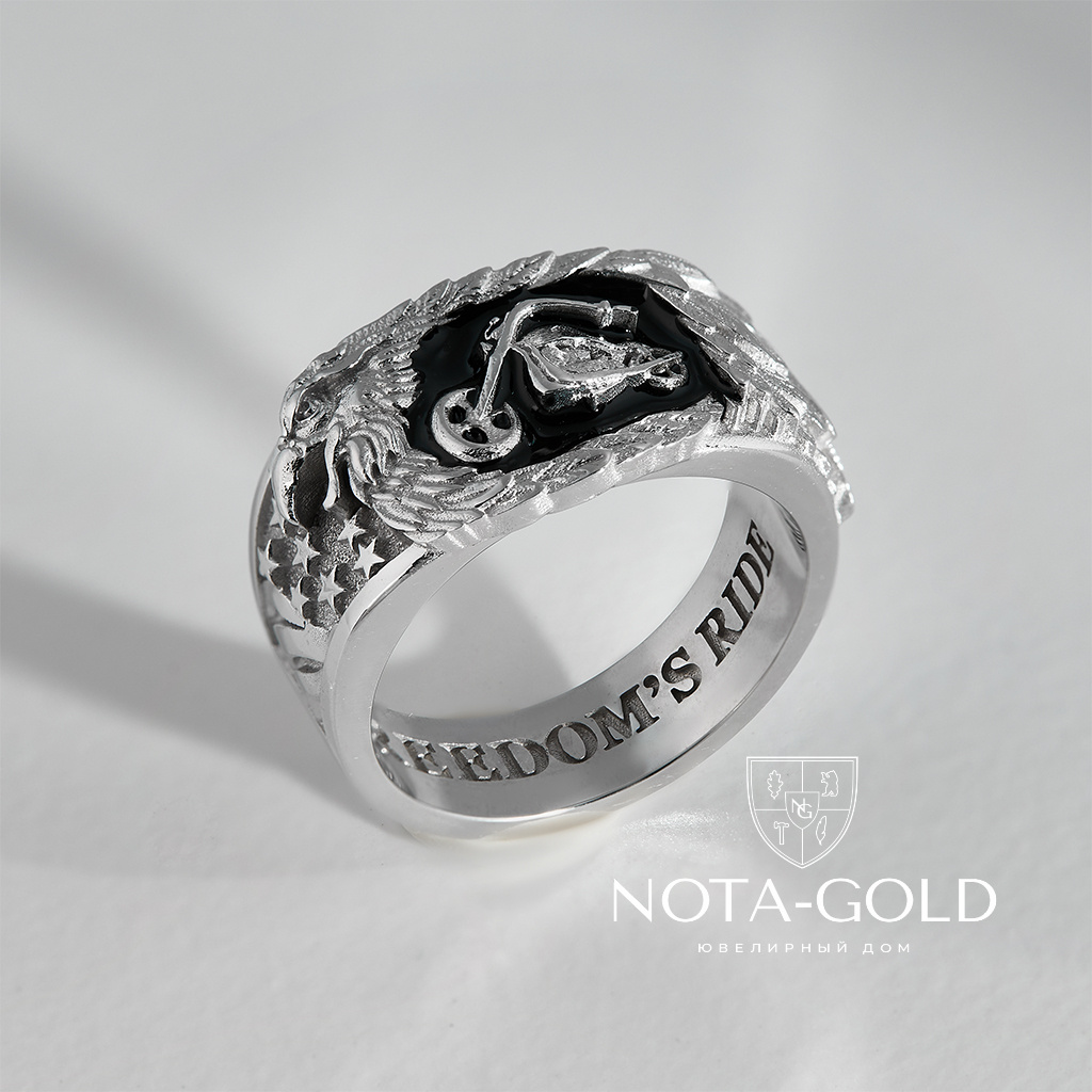 Кольцо из белого золота с черной эмалью, гравировкой и байкерской символикой (Вес 14,4 гр.)