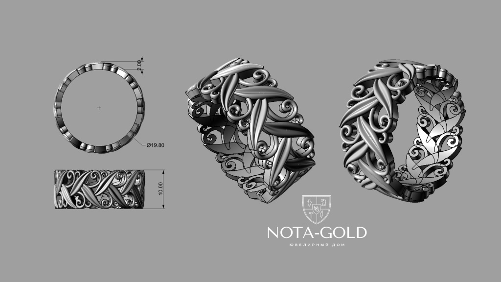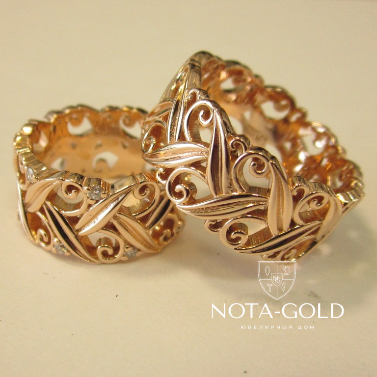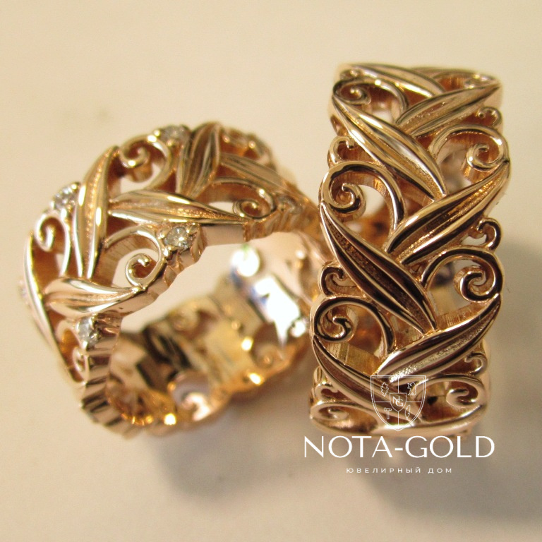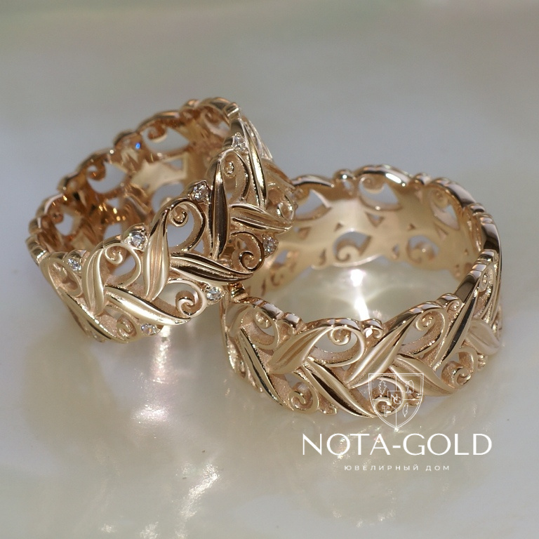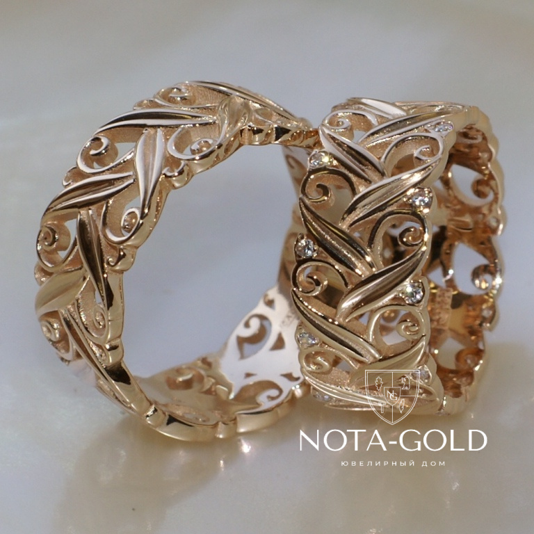 Широкие ажурные обручальные кольца выполнены в красном золоте 585 пробы. Ажурный орнамент из золота в растительном стиле украшает всю поверхность колец. Наши ювелиры изготовят широкие кольца с узором и орнаментом из золота 585, 750 пробы и серебра 925 пробы.