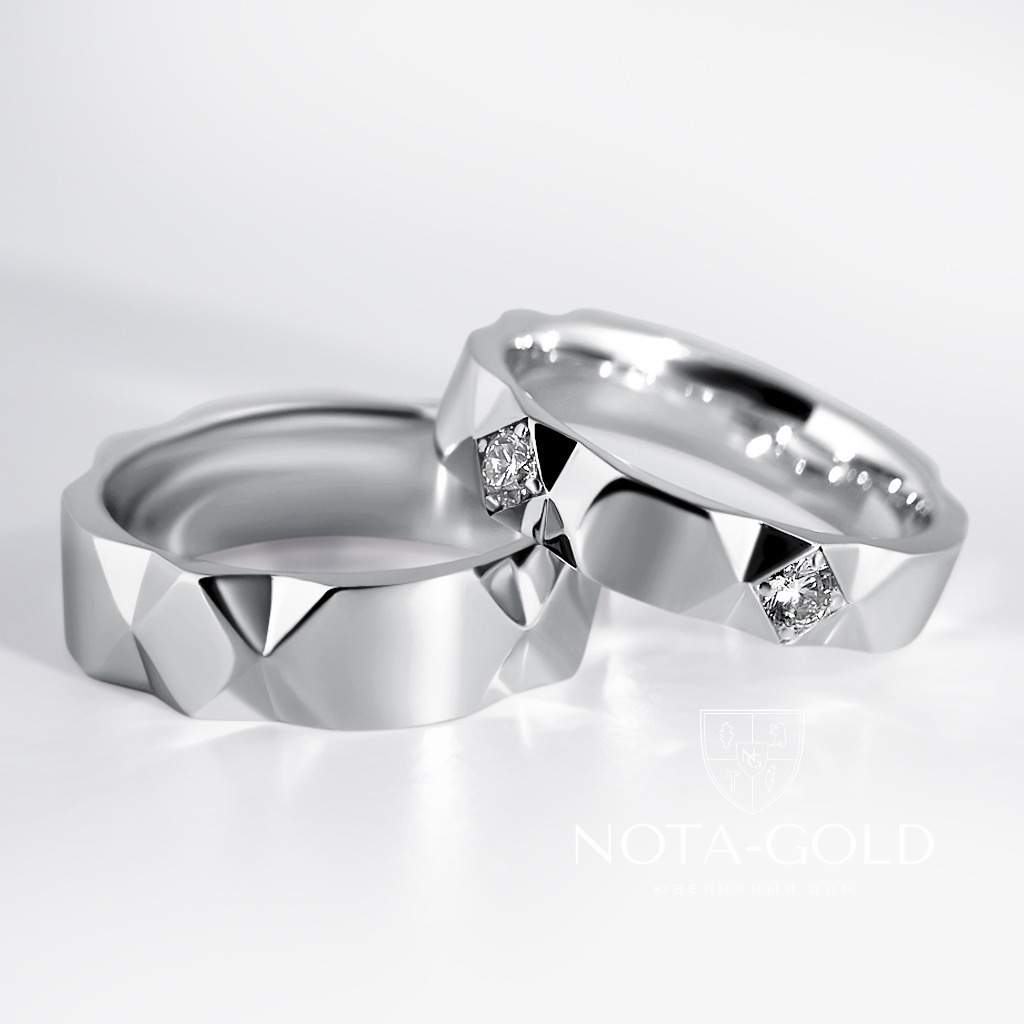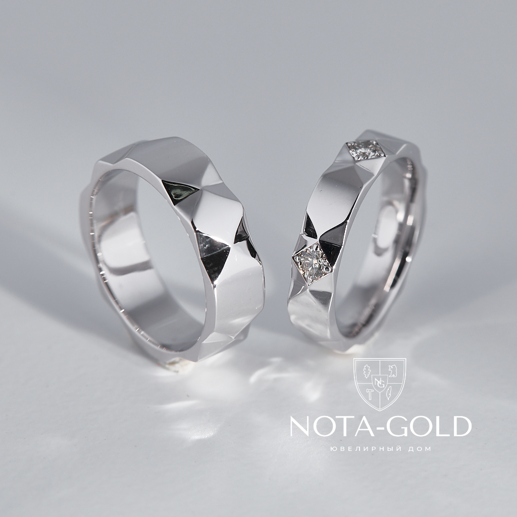 Граненые обручальные кольца из белого золота с бриллиантами в женском кольце (Вес пары 12,6 гр.)