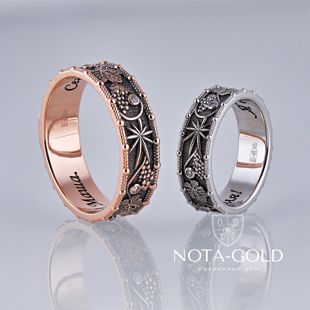 Золотые обручальные кольца с инициалами, растительным узором и гравировкой (Вес пары 11,5 гр.)