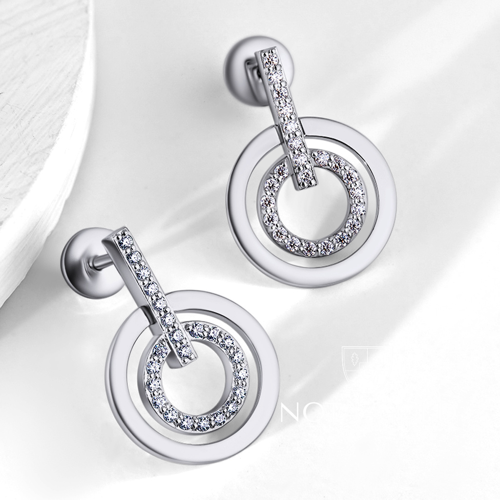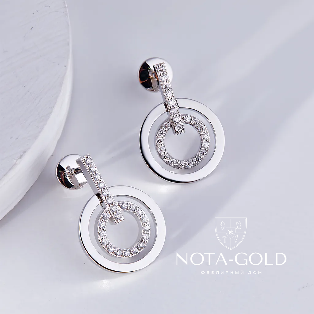 Женские серьги пусеты в виде пары кругов из белого золота с бриллиантами (Вес 7 гр.)